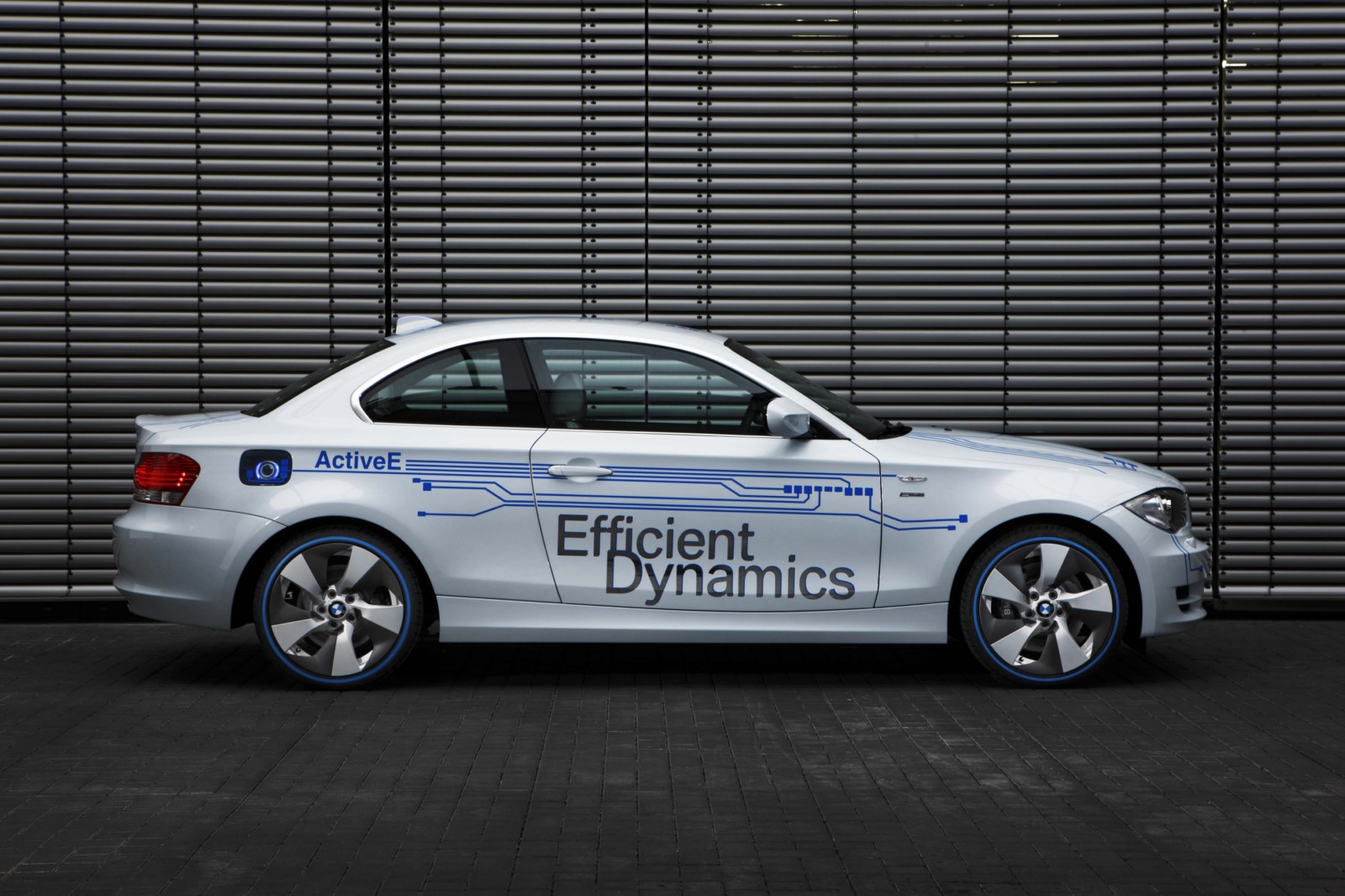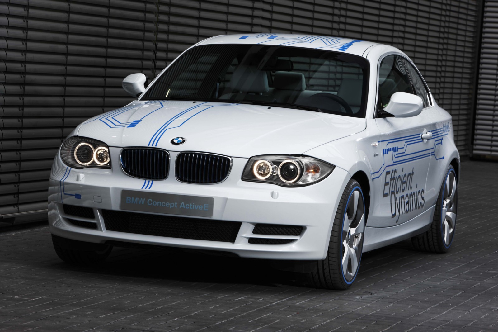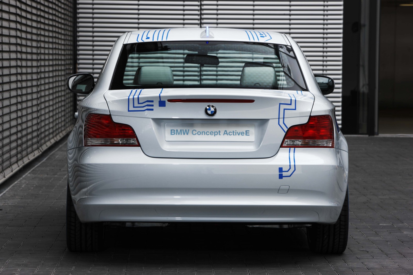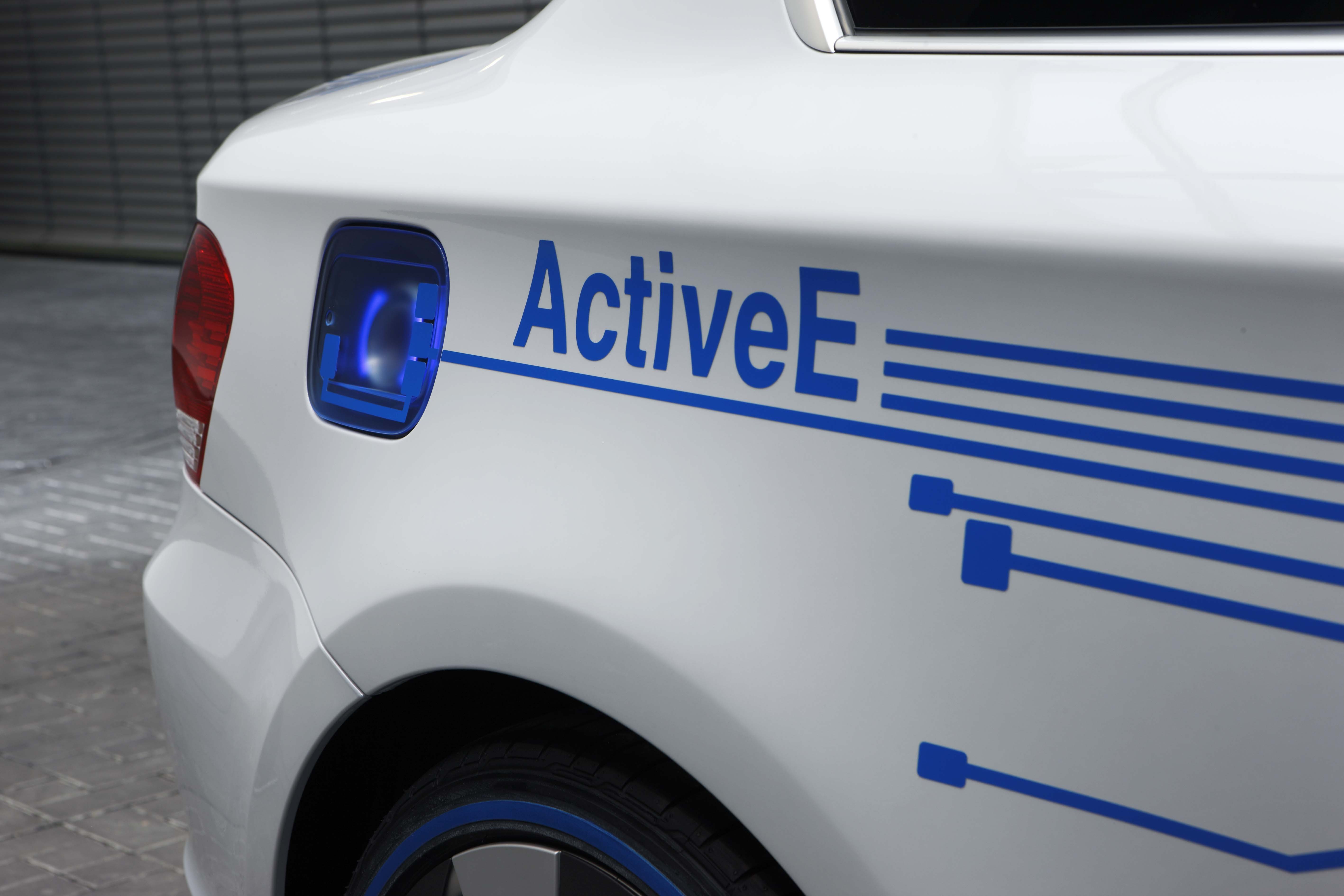 The technology of the BMW Concept ActiveE is highlighted through unique design features. The BMW Concept ActiveE is unmistakably based on the BMW 1 Series Coupe, well-known for its outstanding agility and efficiency. With its powerful proportions, the BMW Concept ActiveE also embodies an especially sporty form. Its side view is dominated by the striking shoulder line and the short overhangs. In addition, the BMW Concept ActiveE boasts striking light alloy wheels which are aerodynamically optimized. The distinctive appearance is partly created by the concept-specific rear apron which is completely closed, demonstrating that the vehicle is entirely emissions-free due to the lack of an exhaust system. There is a recognisable differentiation from the production model of the BMW 1 Series Coupe with the body finish in Liquid White metallic, as well as graphic elements derived from printed circuits in Electric Blue on the hood, doors, roof and trunk lid, as well as the lettering “ActiveE”, “eDrive” and “Efficient Dynamics” on the doors and side panels. The following elements also reflect the special character of this electrically powered vehicle: a blue illuminated charging connection behind a translucent filler cap, a glowing blue roof fin and kidney rods finished in blue. Blue rings on the tyres also make for a visual enlargement of the 18-inch wheels.