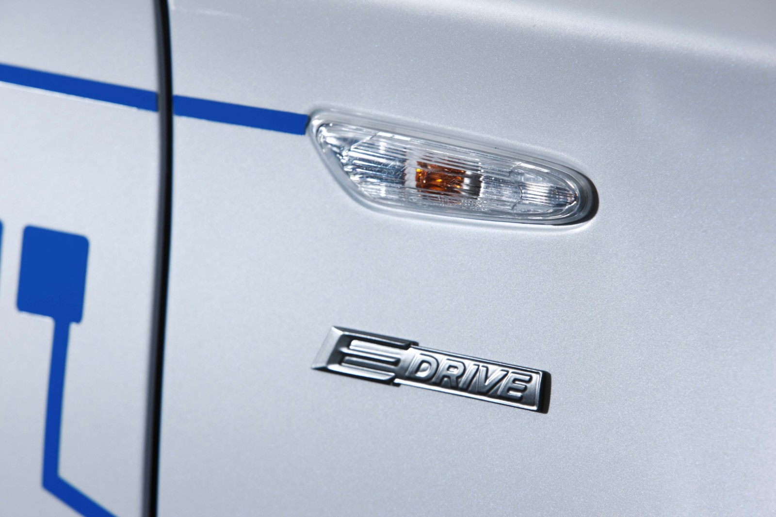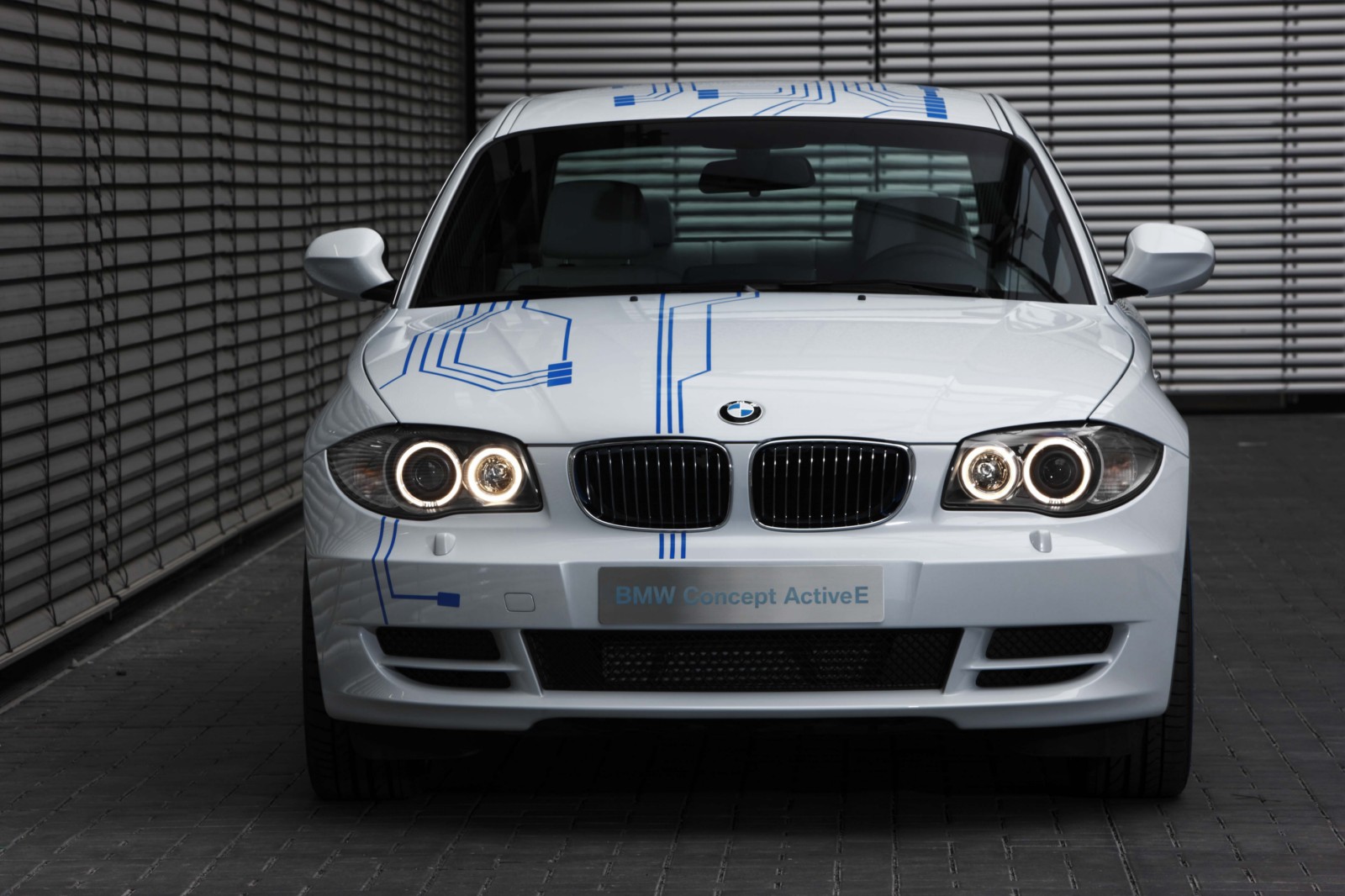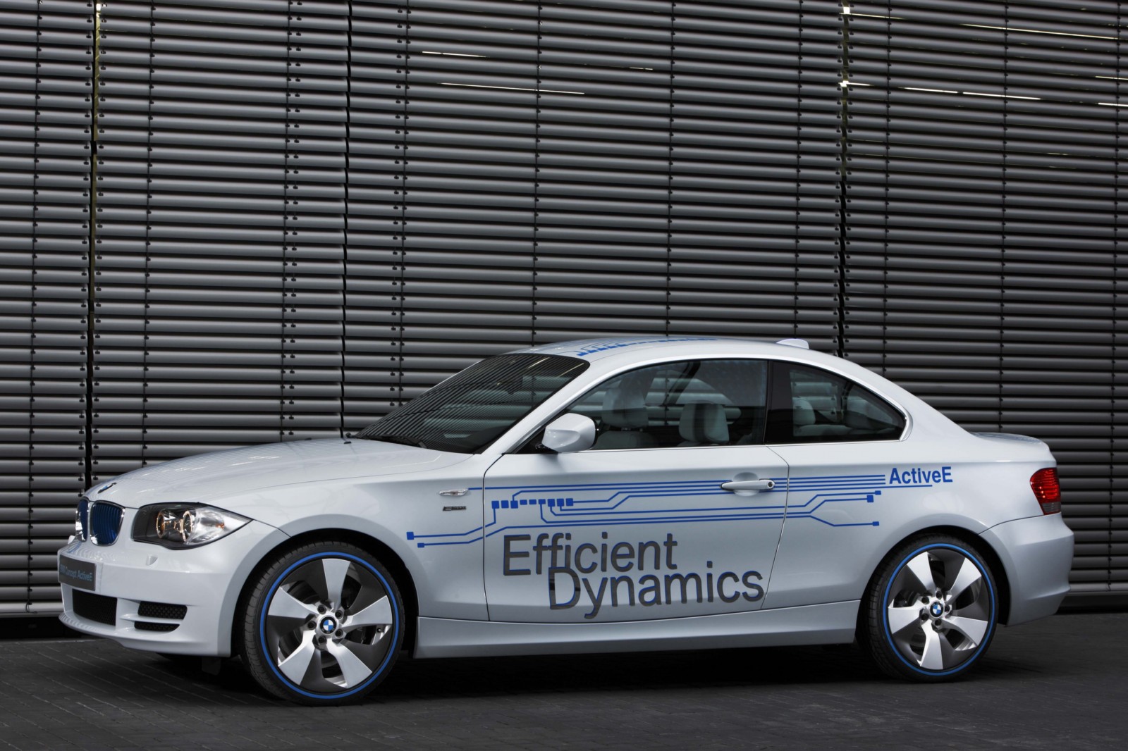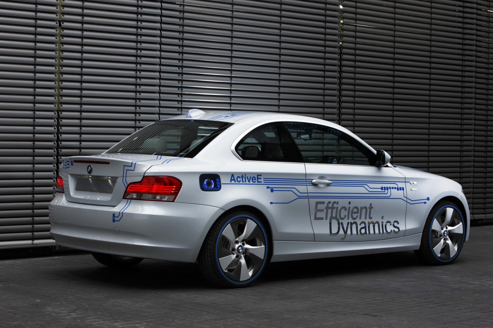 The technology of the BMW Concept ActiveE is highlighted through unique design features. The BMW Concept ActiveE is unmistakably based on the BMW 1 Series Coupe, well-known for its outstanding agility and efficiency. With its powerful proportions, the BMW Concept ActiveE also embodies an especially sporty form. Its side view is dominated by the striking shoulder line and the short overhangs. In addition, the BMW Concept ActiveE boasts striking light alloy wheels which are aerodynamically optimized. The distinctive appearance is partly created by the concept-specific rear apron which is completely closed, demonstrating that the vehicle is entirely emissions-free due to the lack of an exhaust system. There is a recognisable differentiation from the production model of the BMW 1 Series Coupe with the body finish in Liquid White metallic, as well as graphic elements derived from printed circuits in Electric Blue on the hood, doors, roof and trunk lid, as well as the lettering “ActiveE”, “eDrive” and “Efficient Dynamics” on the doors and side panels. The following elements also reflect the special character of this electrically powered vehicle: a blue illuminated charging connection behind a translucent filler cap, a glowing blue roof fin and kidney rods finished in blue. Blue rings on the tyres also make for a visual enlargement of the 18-inch wheels.