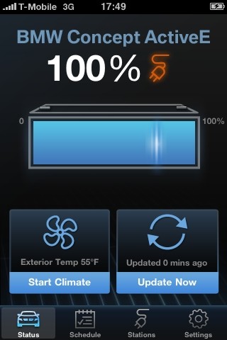 The climate control systems developed for the BMW Concept ActiveE can also be activated via mobile phone. This option also includes a timer function so the driver can ensure that the vehicle is conveniently pre-cooled or pre-heated before getting into it in the morning, for example. Climatic pre-conditioning optimizes not only ride comfort but also the operating status of the energy storage system in the sense that it maximises the range of the vehicle. The control of the heating and air conditioning system by mobile phone is made available through BMW ConnectedDrive. The BMW Concept ActiveE demonstrates the extensive range of options for using these services with the full integration of a smartphone connection into the vehicle infotainment system.