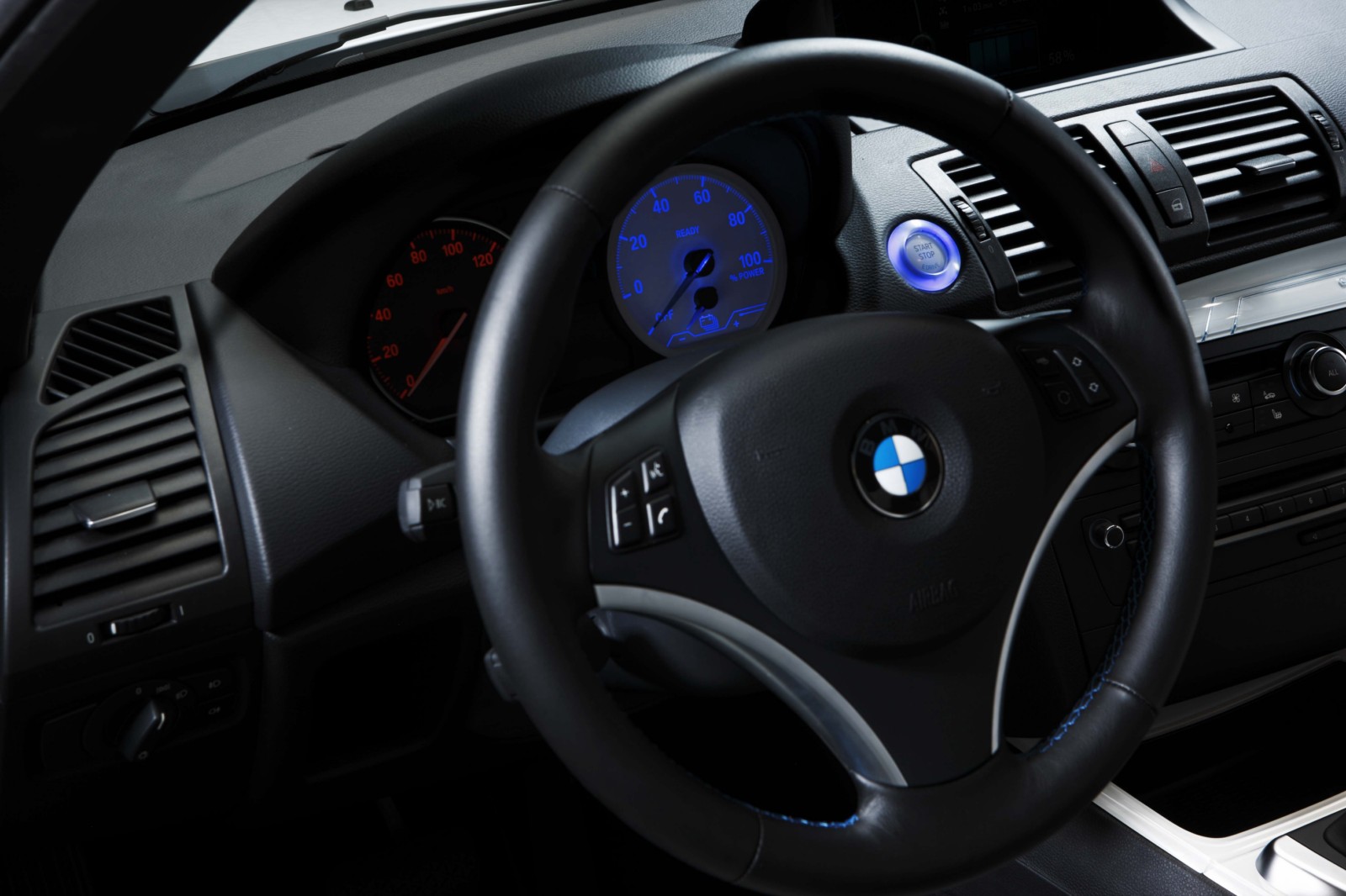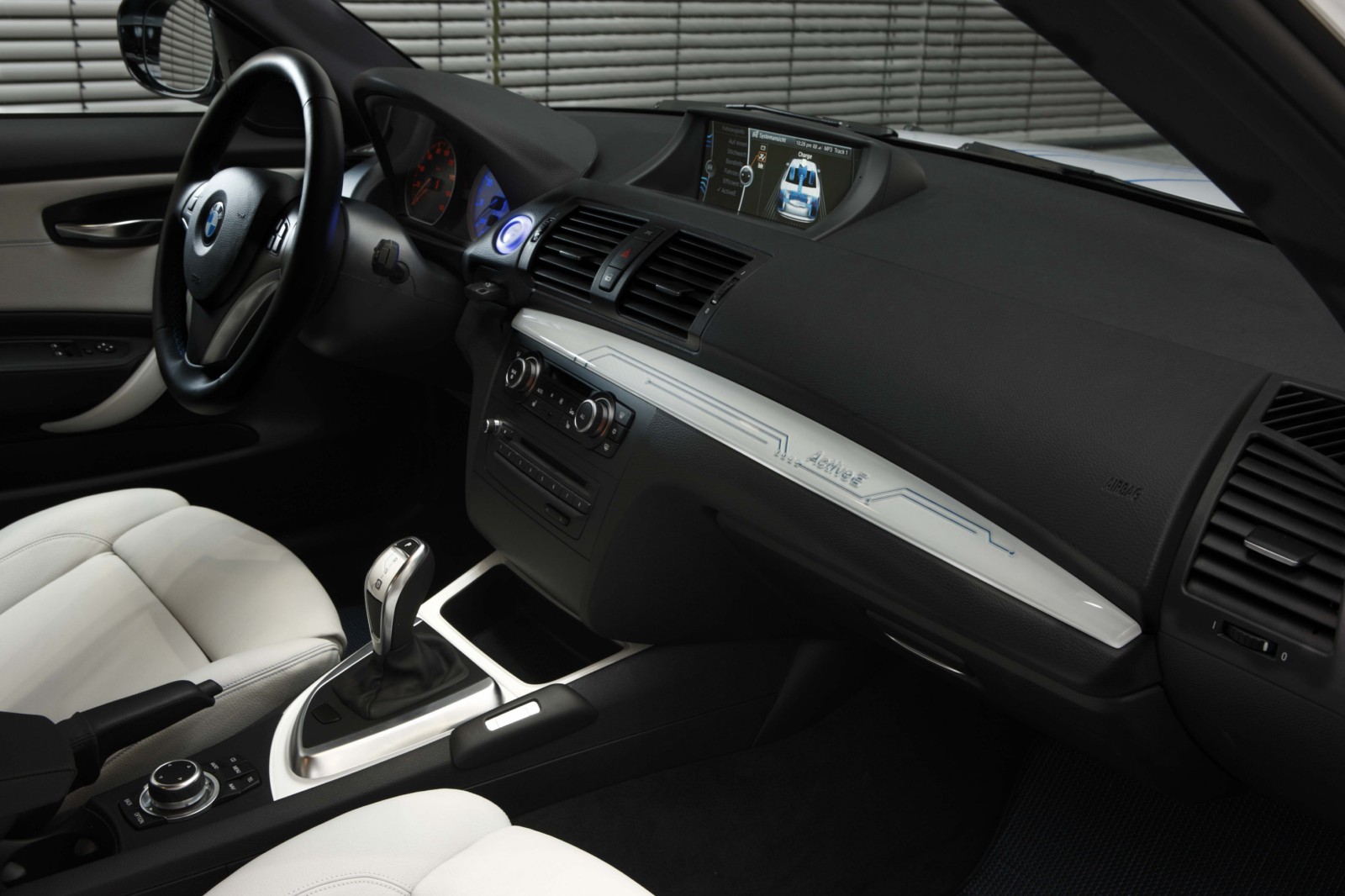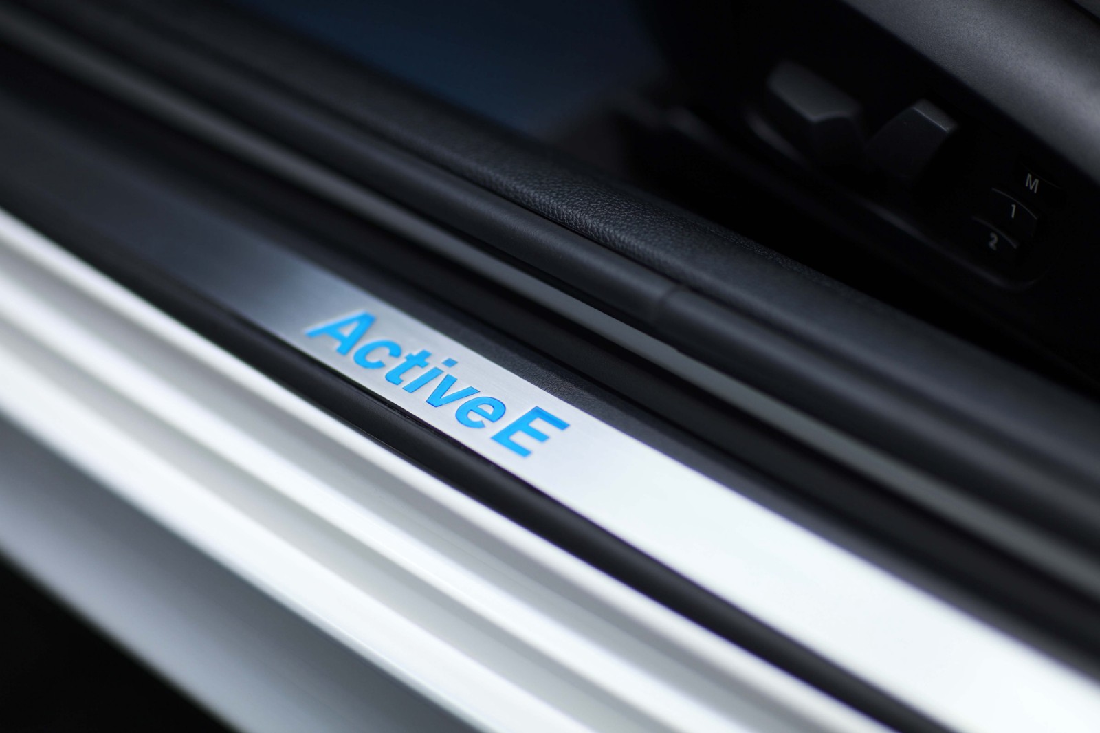 In the interior, individual details highlight the distinctive style of the study and are functionally associated with the electric drive. Among other things, the interior of the BMW Concept ActiveE has special leather seats with embossed graphic elements and blue contrasting stitching. The instrument panel and door trim panels have strips in Liquid White. The decor strip in the instrument panel is finished with a three-dimensional rear-lit ActiveE graphic. The blue illuminated start/stop button and the selector lever knob emblem in White/Blue round off the overall graphic concept. What is more, the instrument panel and the central display have been enhanced to monitor the electric drive.