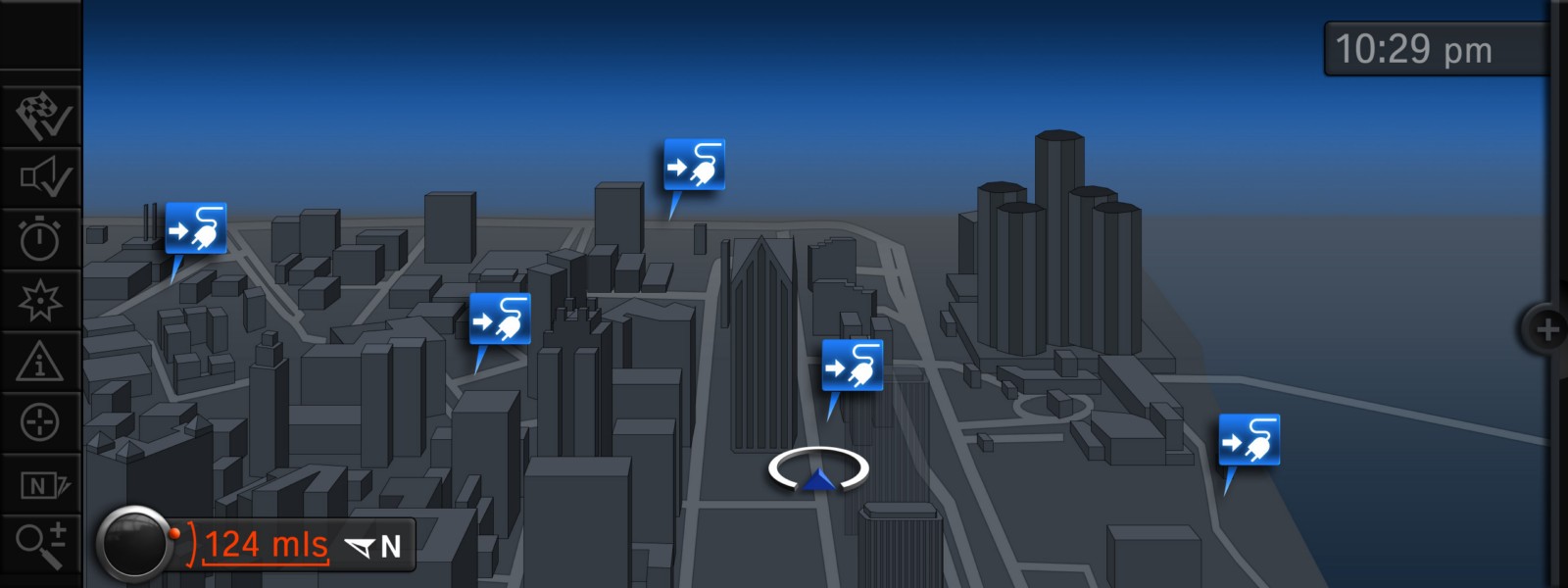 In addition to the familiar features, the central information display also has a battery level indicator, an active system status display function and the positions of the nearest electric charging stations.