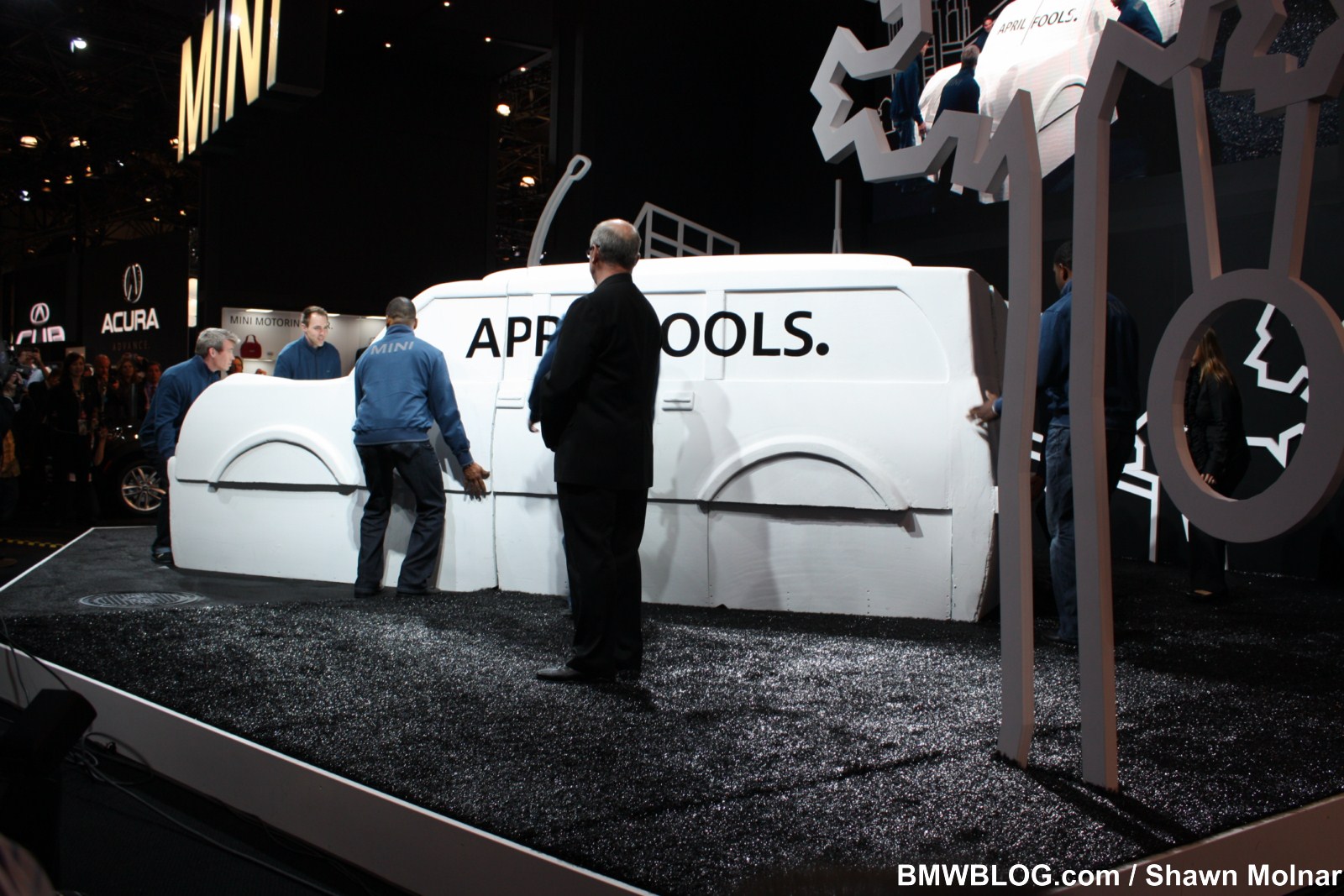In an apt April Fools joke, Mini unveiled the Countryman from under a traditional linen cover, but a surprise lurked beneath. Wide eyed journalists had looked inquisitively upon the silhouette of the vehicle beneath – but it was a monstrous silhouette, probably closer to the Escalade in size. Pictures can be deceiving – but was the Countryman really that huge? The linen was pulled, and the joke revealed – a giant wooden shell encapsulating the new Mini. Several young men descended on the vehicle to remove the wooden enclosure and finally the Countryman was sitting before us. Take a look at all the action in our gallery below.