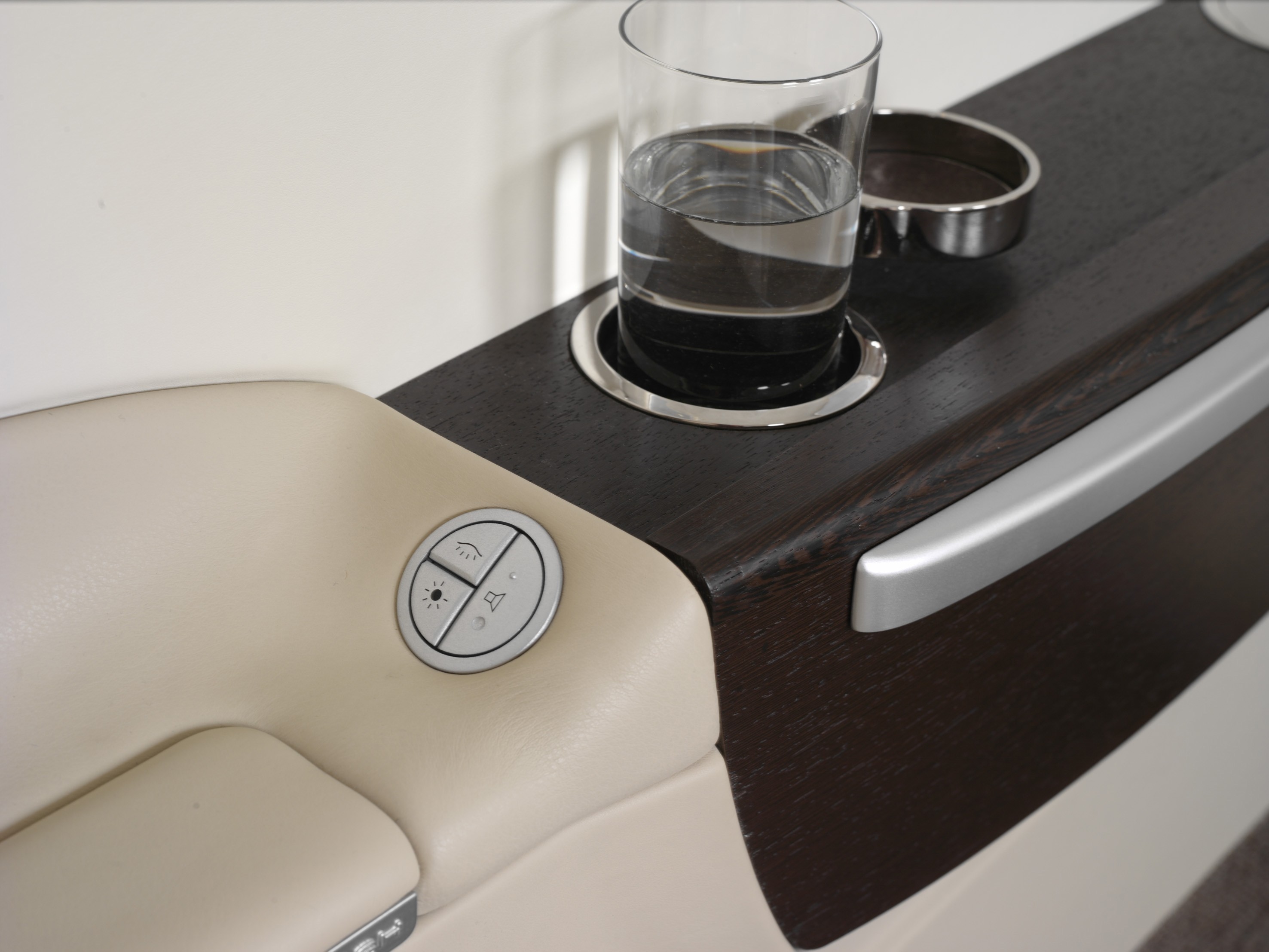 The design of the Phenom jets stands out through a multitude of intelligent solutions and details. The entrance to the cabin is tailored to the natural physiognomy of the human body and broadens out at shoulder height, giving the interior along the aisle its very own, elegant, characteristic form for more passenger freedom of movement and comfort. Integrated armrests, which have been a feature of the automobile sector for many years now, have also been introduced. An innovative flooring design was implemented, consisting of new, durable materials, offering superior inherent value. Simultaneously, it provides an adequate, sustainable answer to the owner’s or operator’s demand for high quality design combined with low cost and maintenance.