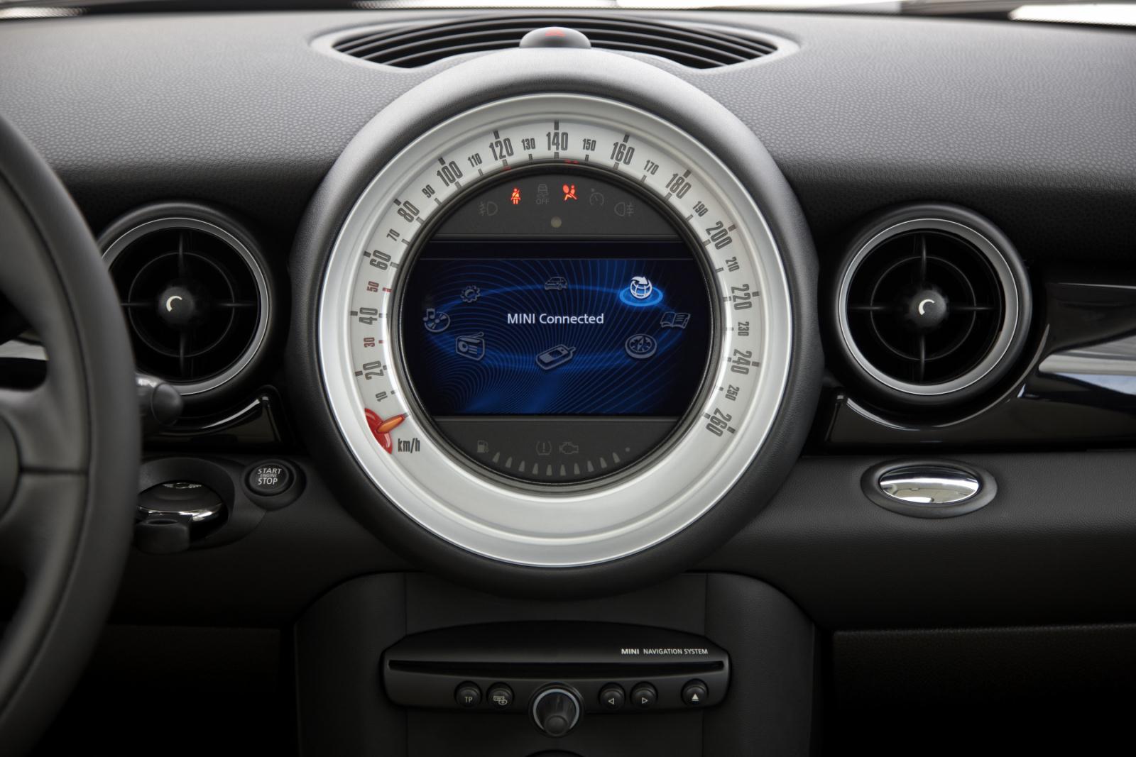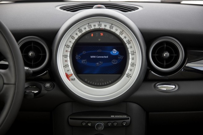 The tech features include a new multimedia system, called MINI Connected, which integrates Apple iPhone into the car’s system architecture and allows its telephone, music player and online functions to be operated using a joystick, steering wheel buttons and the on-board monitor. Using an application available from the Apple AppStore, users can receive now Facebook and Twitter posts inside the car, display them on the on-board monitor and have them read out via the optional MINI Connected voice output function. The radio systems, the navigation system and the Bluetooth were updated.
