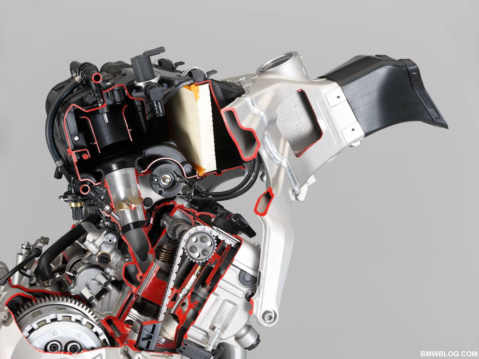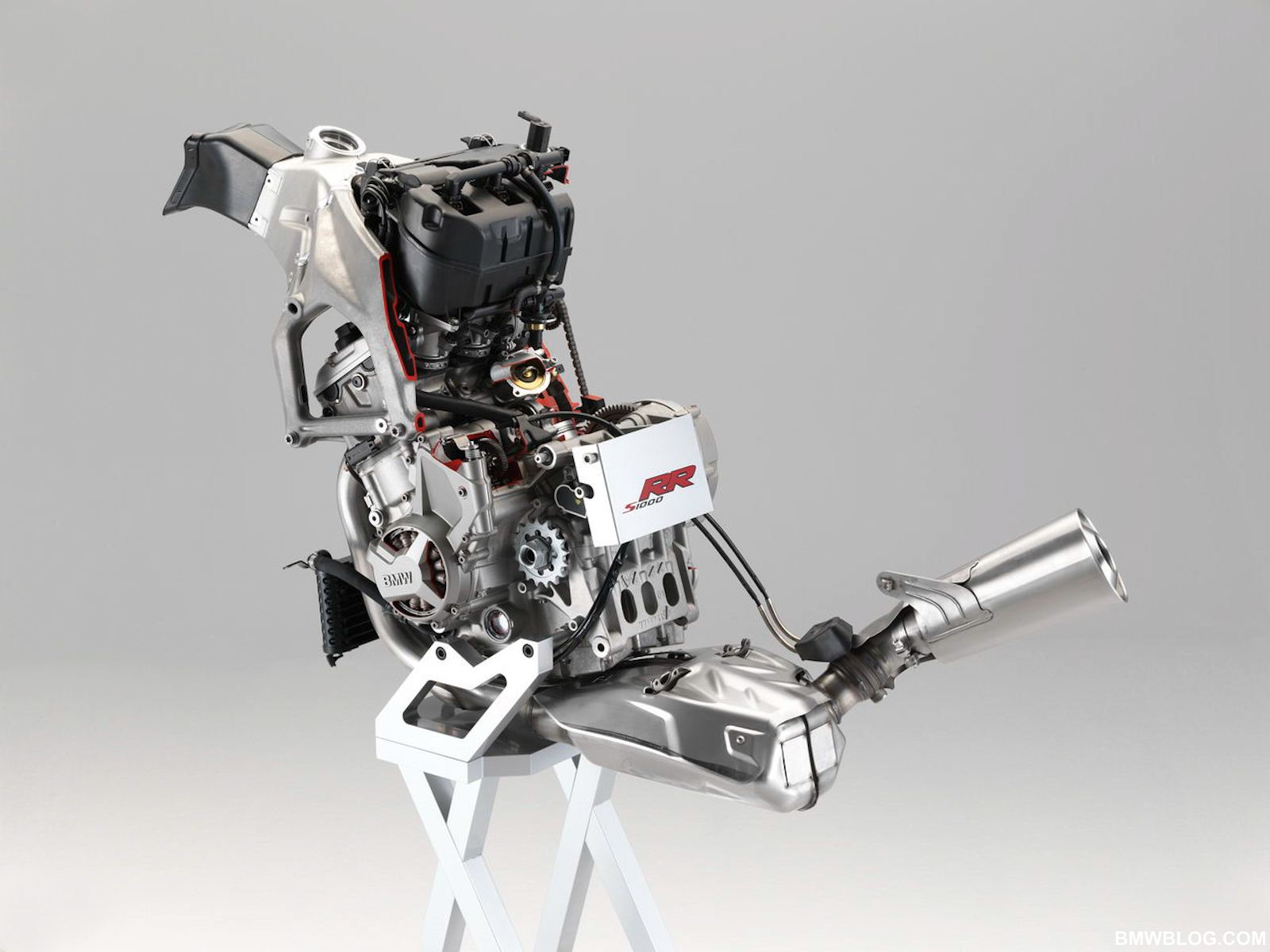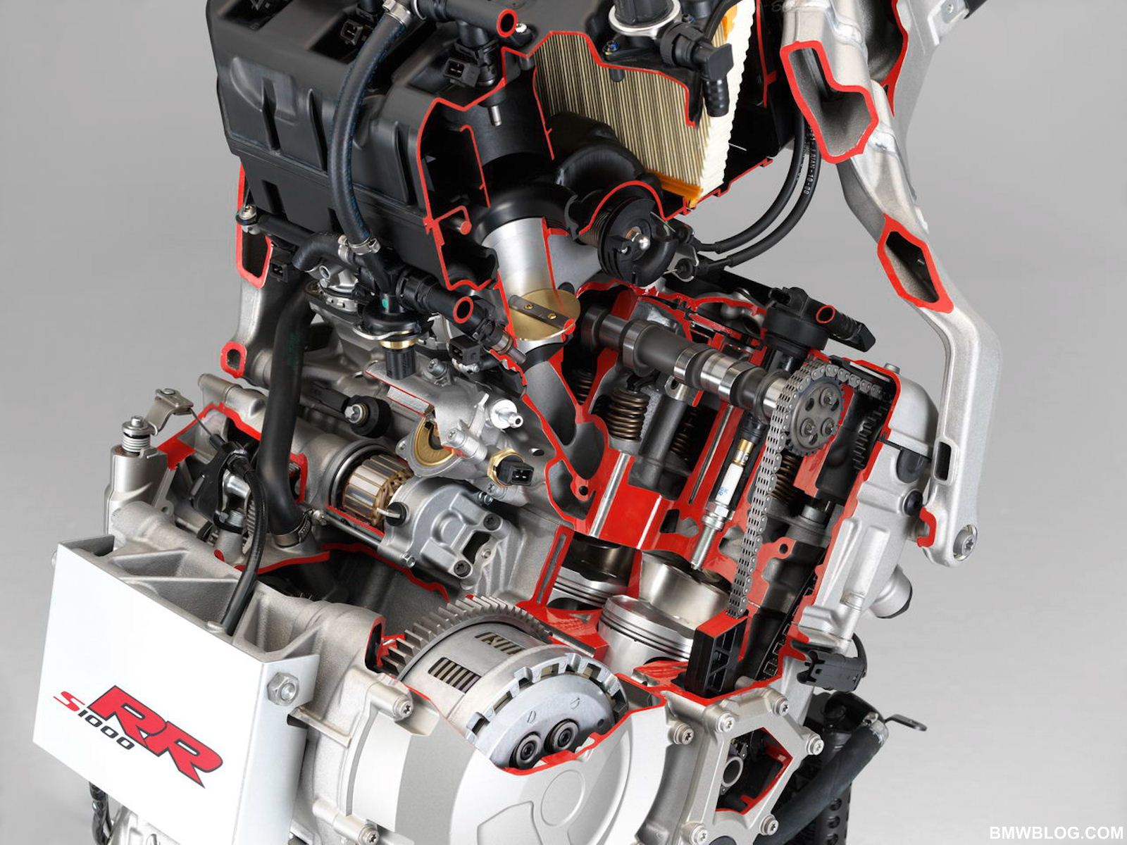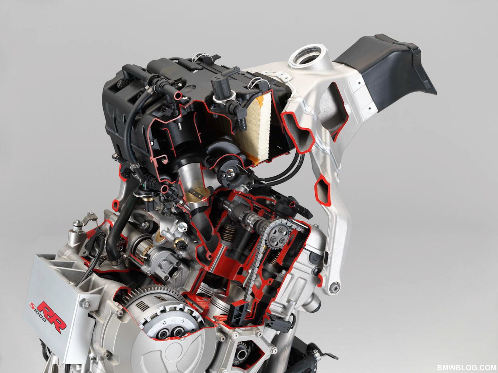 The S1000RR’s 999 cc inline 4 cylinder engine is endowed with highly advanced, F1 derived technology. Let’s start as air enters the engine. A ram air effect is achieved by the intake at high speeds, and air is eventually fed through variable length intake tracts into the highly compact combustion chamber. This engine has the widest cylinder bore in the segment with a bore of 80 mm and a stroke of 49.7 mm, lending the engine its rev happy demeanor. Single finger style cam followers are ultra light and allow for compact spacing above the nikasil coated cylinders. Thus the combustion chamber can be made smaller with larger valve diameters; proof is in the pudding, this inline 4 achieves a compression ratio of 13:1 with the industry’s largest valve plate diameter of 33.5 mm on the intake side and 27.2 mm on the exhaust valves.