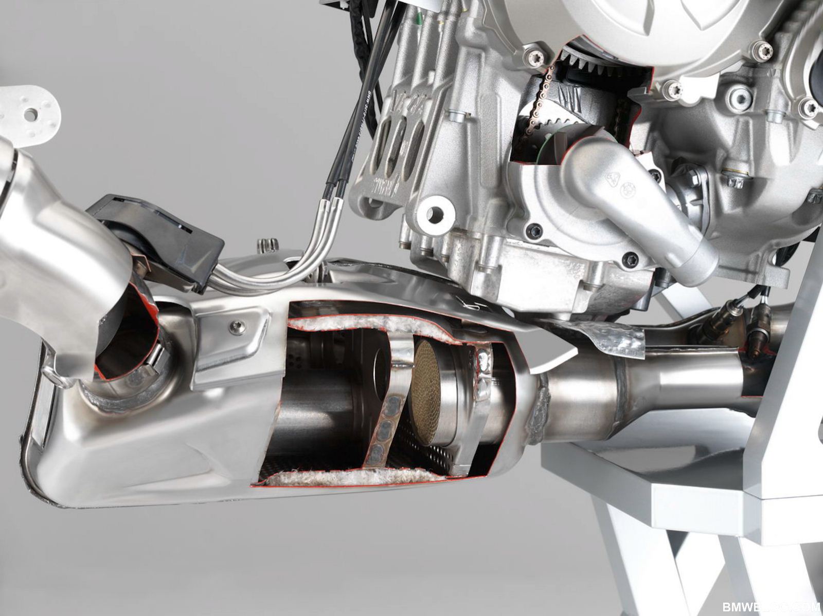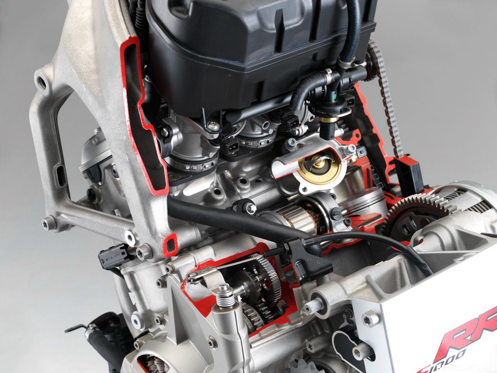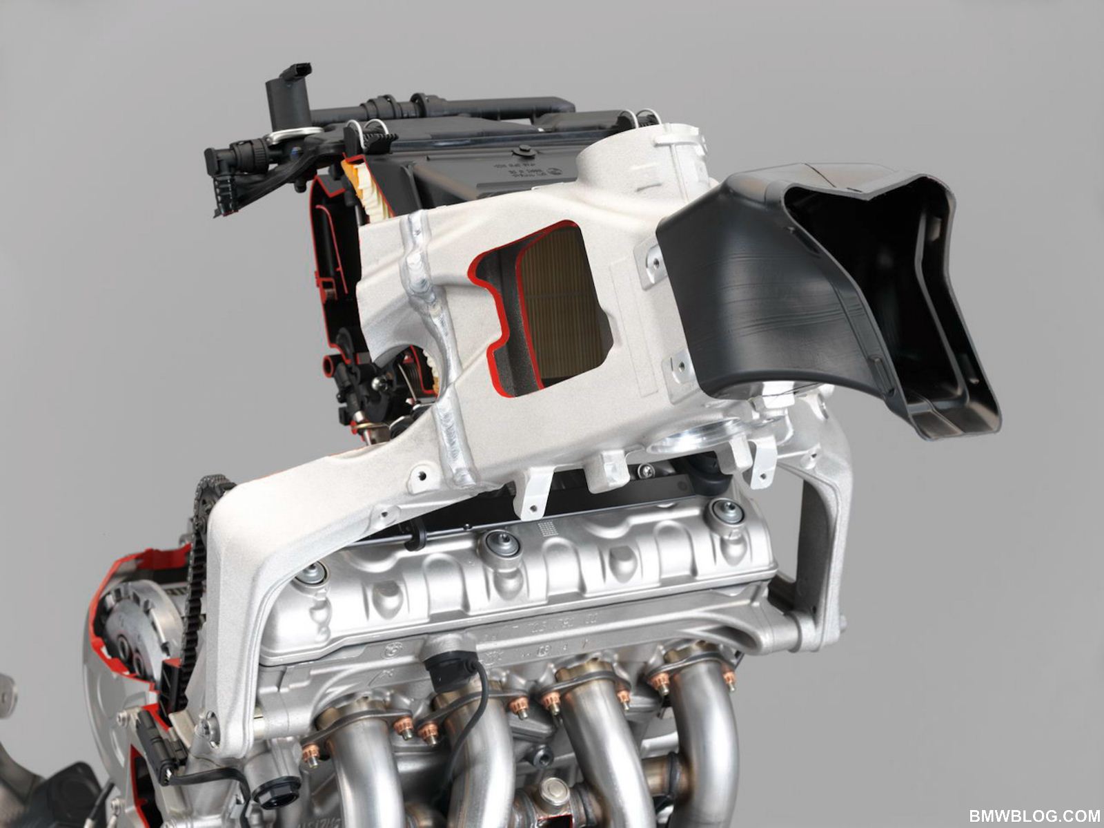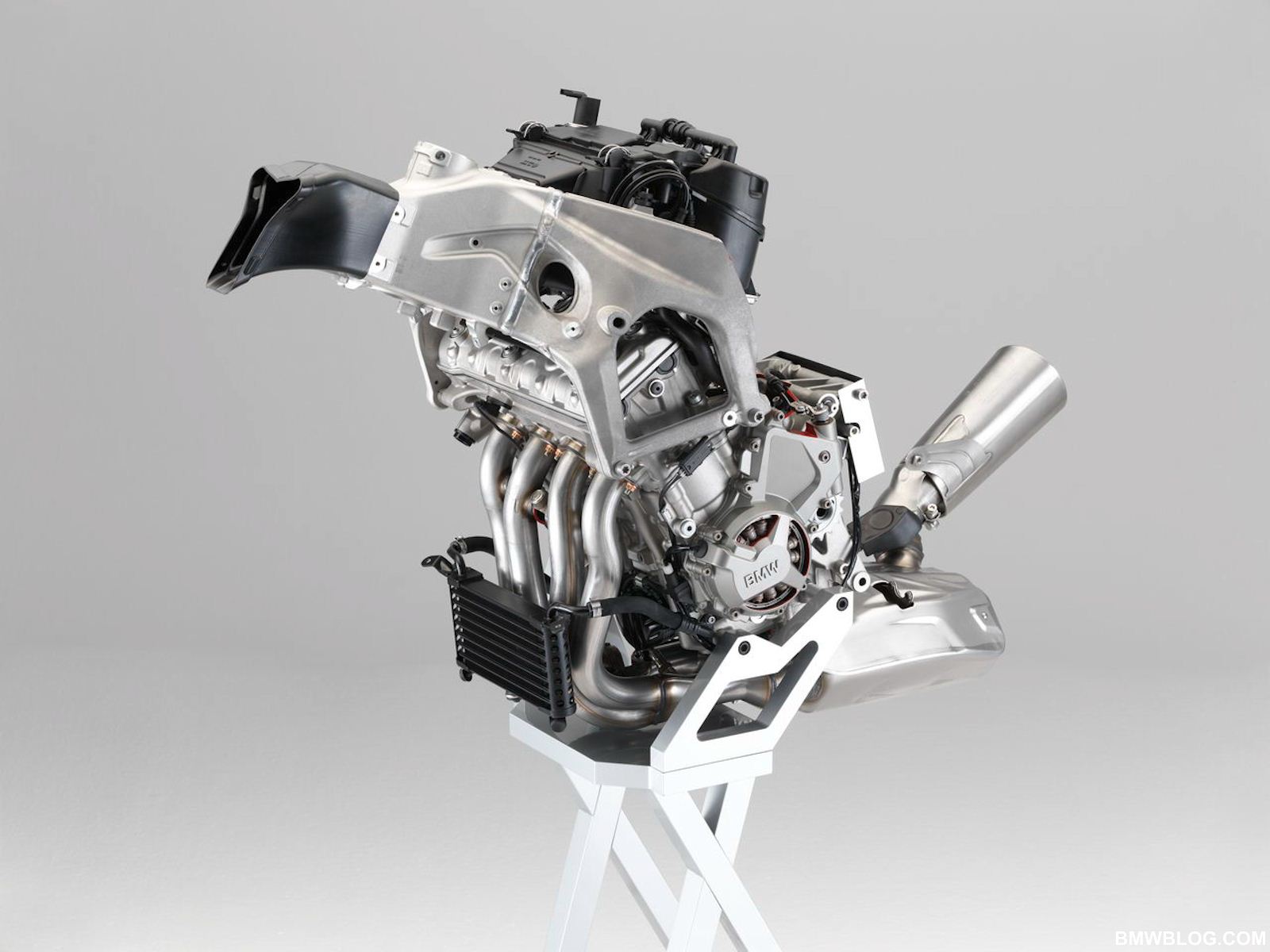 The S1000RR’s 999 cc inline 4 cylinder engine is endowed with highly advanced, F1 derived technology. Let’s start as air enters the engine. A ram air effect is achieved by the intake at high speeds, and air is eventually fed through variable length intake tracts into the highly compact combustion chamber. This engine has the widest cylinder bore in the segment with a bore of 80 mm and a stroke of 49.7 mm, lending the engine its rev happy demeanor. Single finger style cam followers are ultra light and allow for compact spacing above the nikasil coated cylinders. Thus the combustion chamber can be made smaller with larger valve diameters; proof is in the pudding, this inline 4 achieves a compression ratio of 13:1 with the industry’s largest valve plate diameter of 33.5 mm on the intake side and 27.2 mm on the exhaust valves.