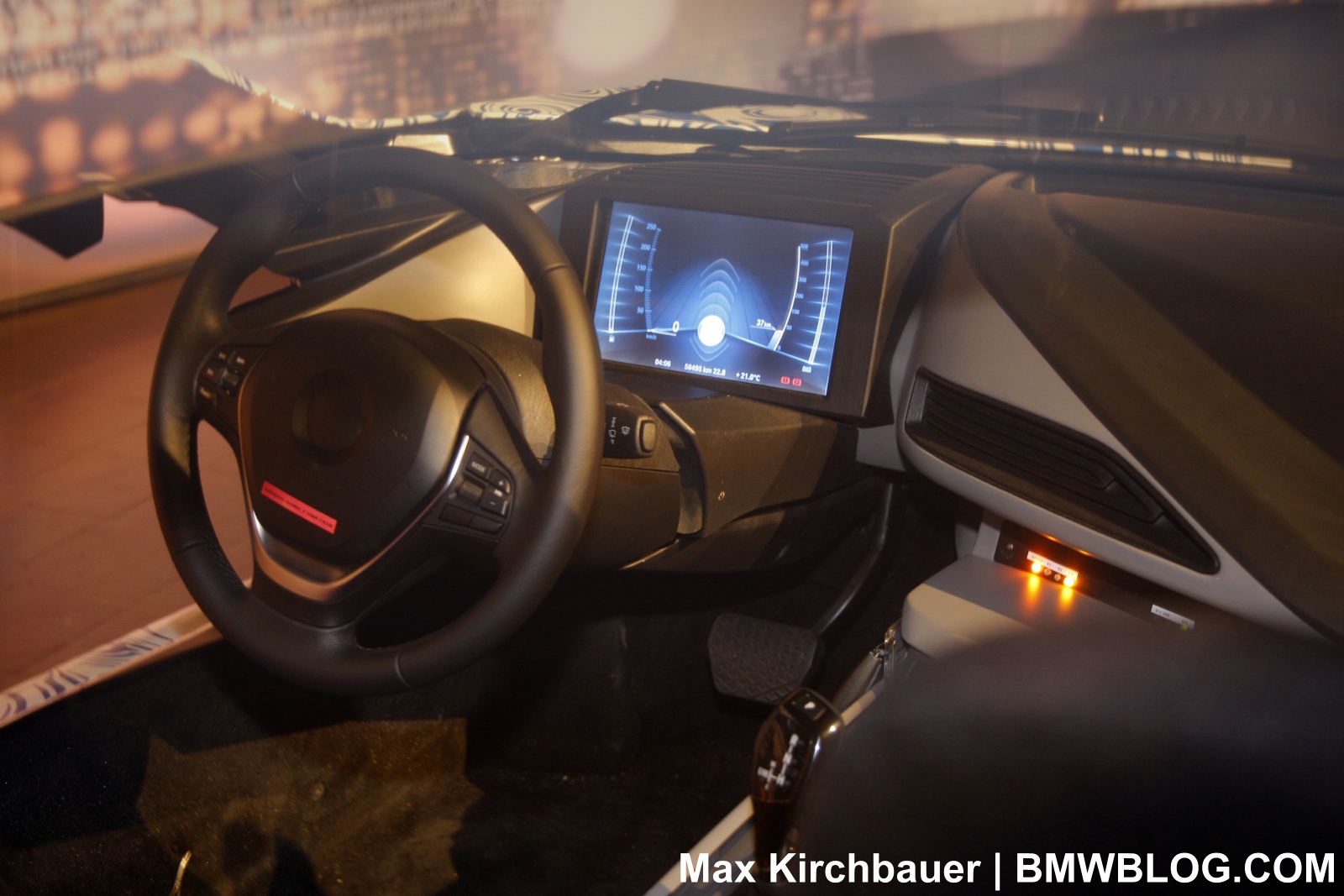 Inside, the design is far from being finalized. The current prototype sports a variety of different controls and parts from a wide range of BMWs. In the production model, the bucket seats will go through some changes. The dasbhoard features the electronic screen seen in the Concept, with the speed and other messages being displayed on the fancy and slick LCD.