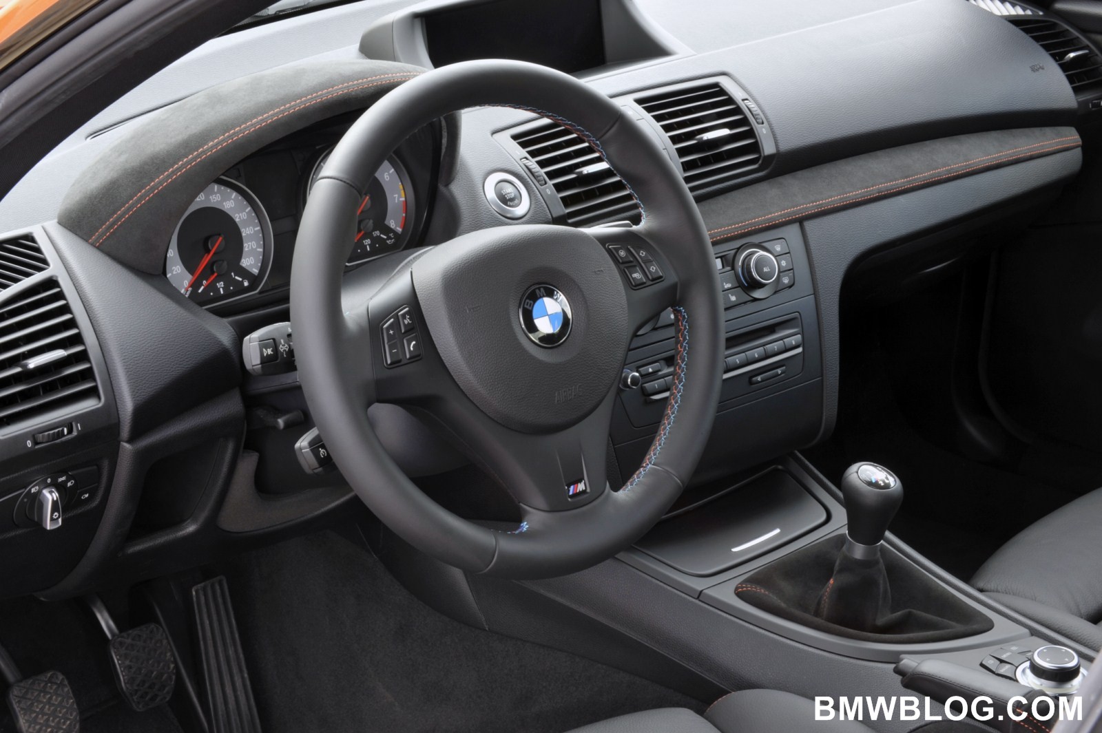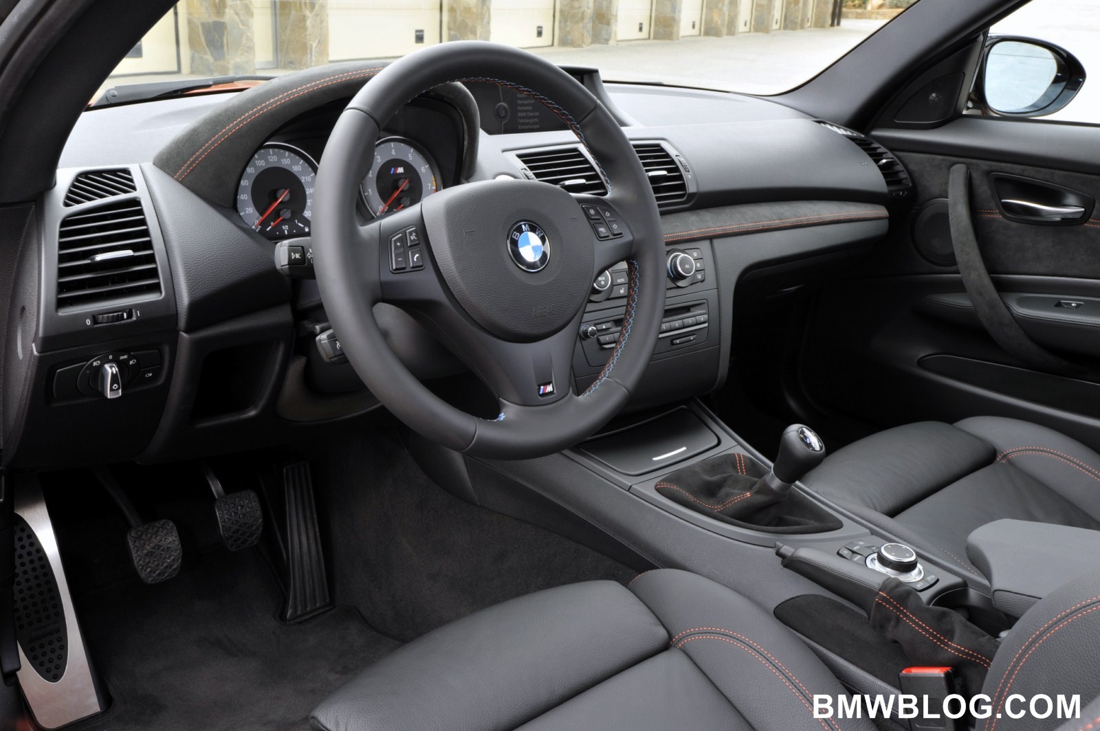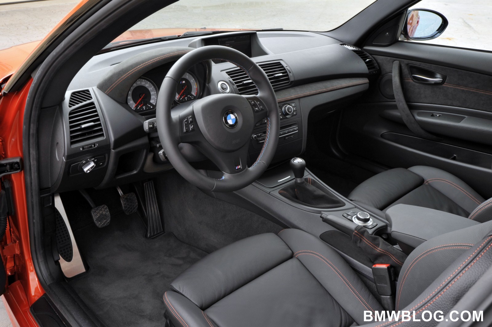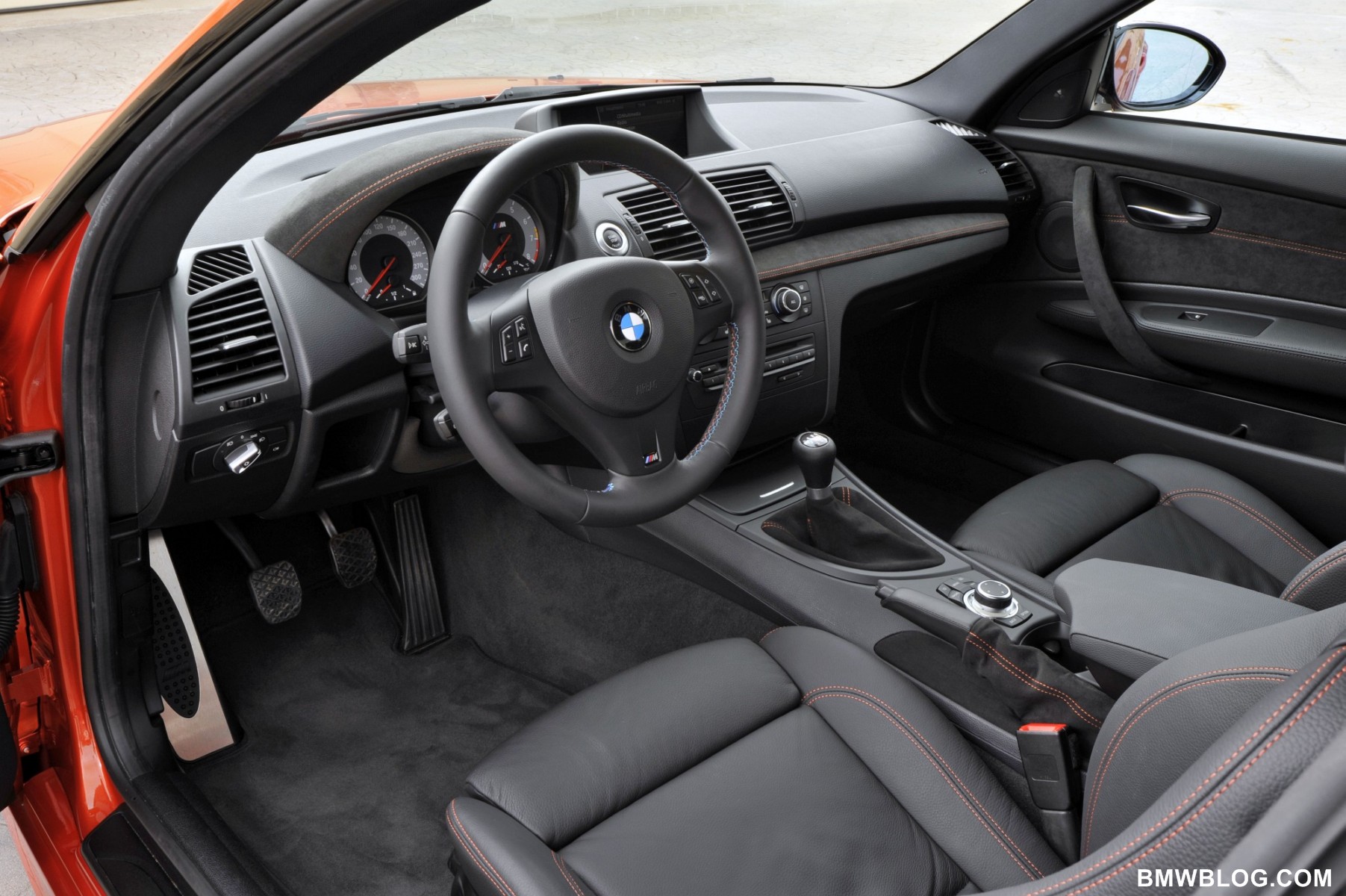 The M-specific cockpit developed exclusively for the BMW 1 Series M Coupe is designed to facilitate focused, sporty driving. High-quality, dark Alcantara with orange contrast stitching covers the door panels, door pulls, instrument cluster binnacle, dash panel, and gearshift and handbrake lever boots. The driver’s attention is focuses on an M-specific instrument cluster with gray dials, classic M red pointers, and white backlighting. An M driver footrest and M entry sills round off the unique interior.