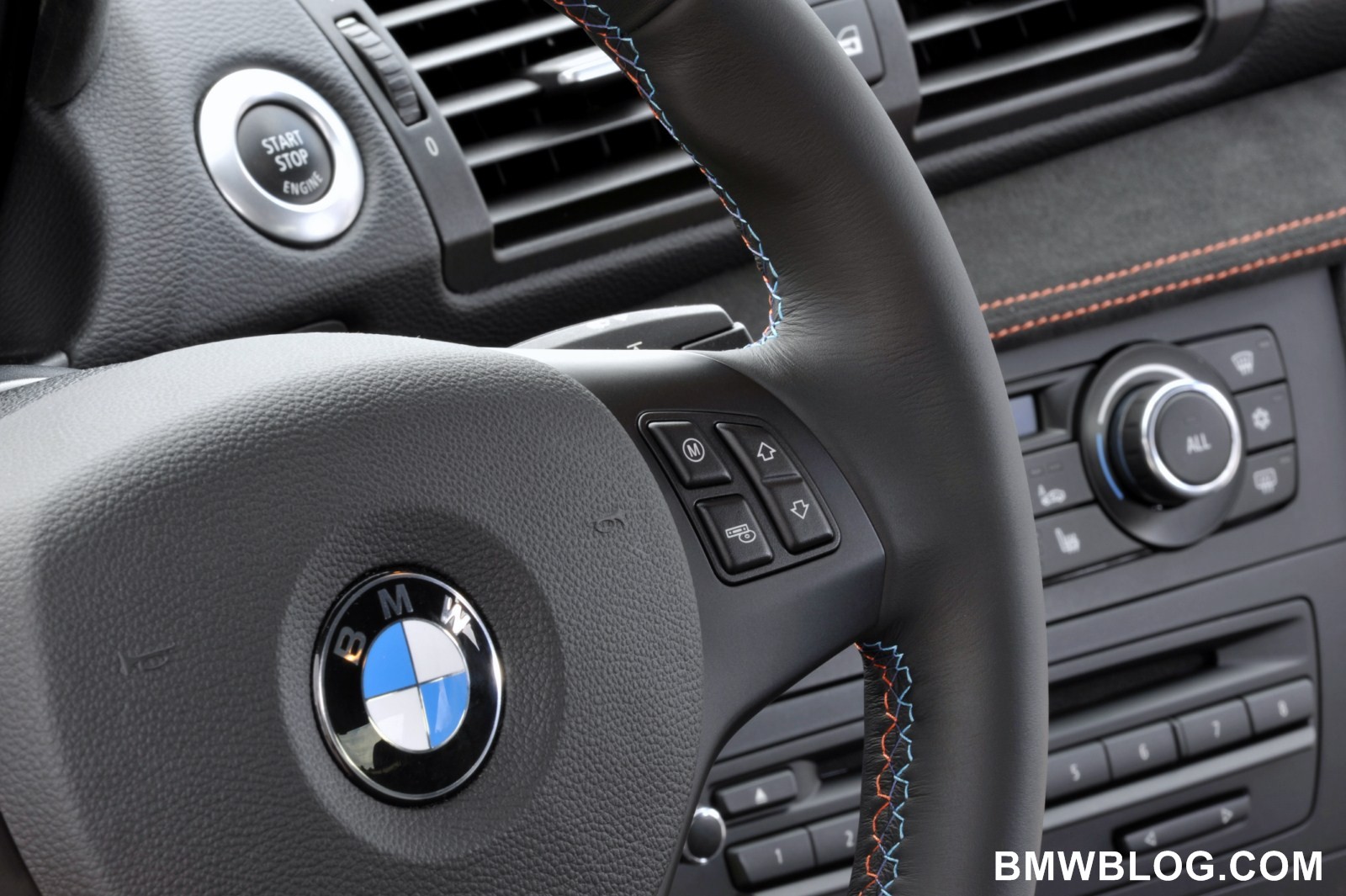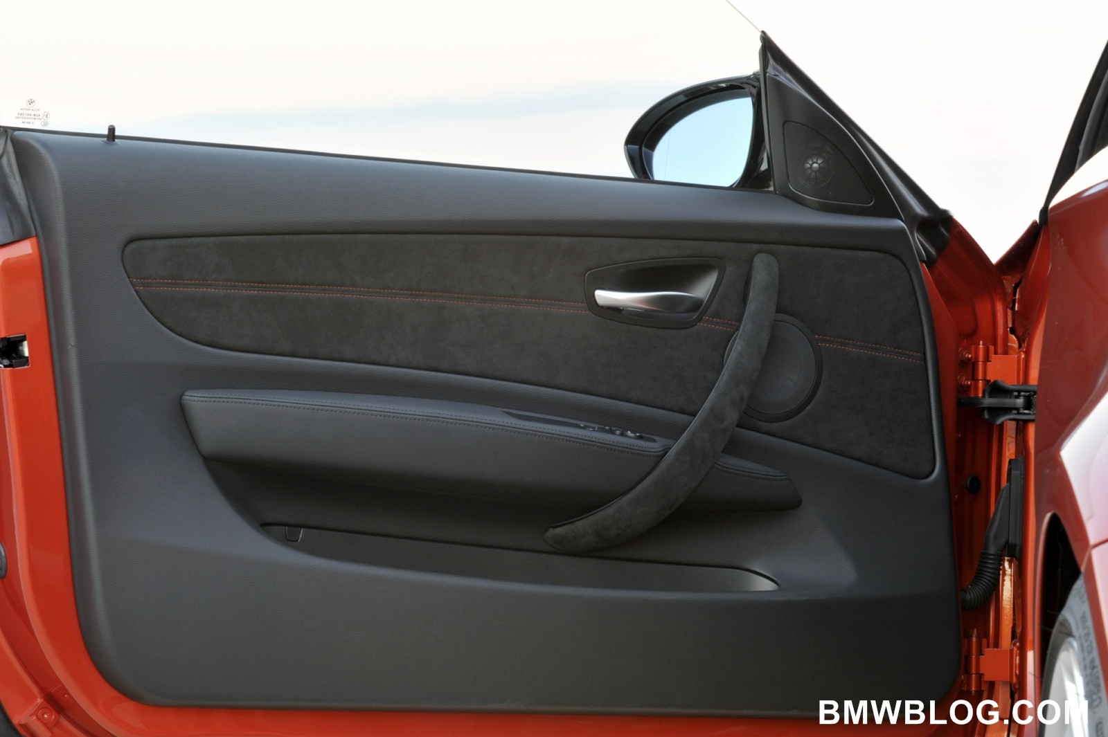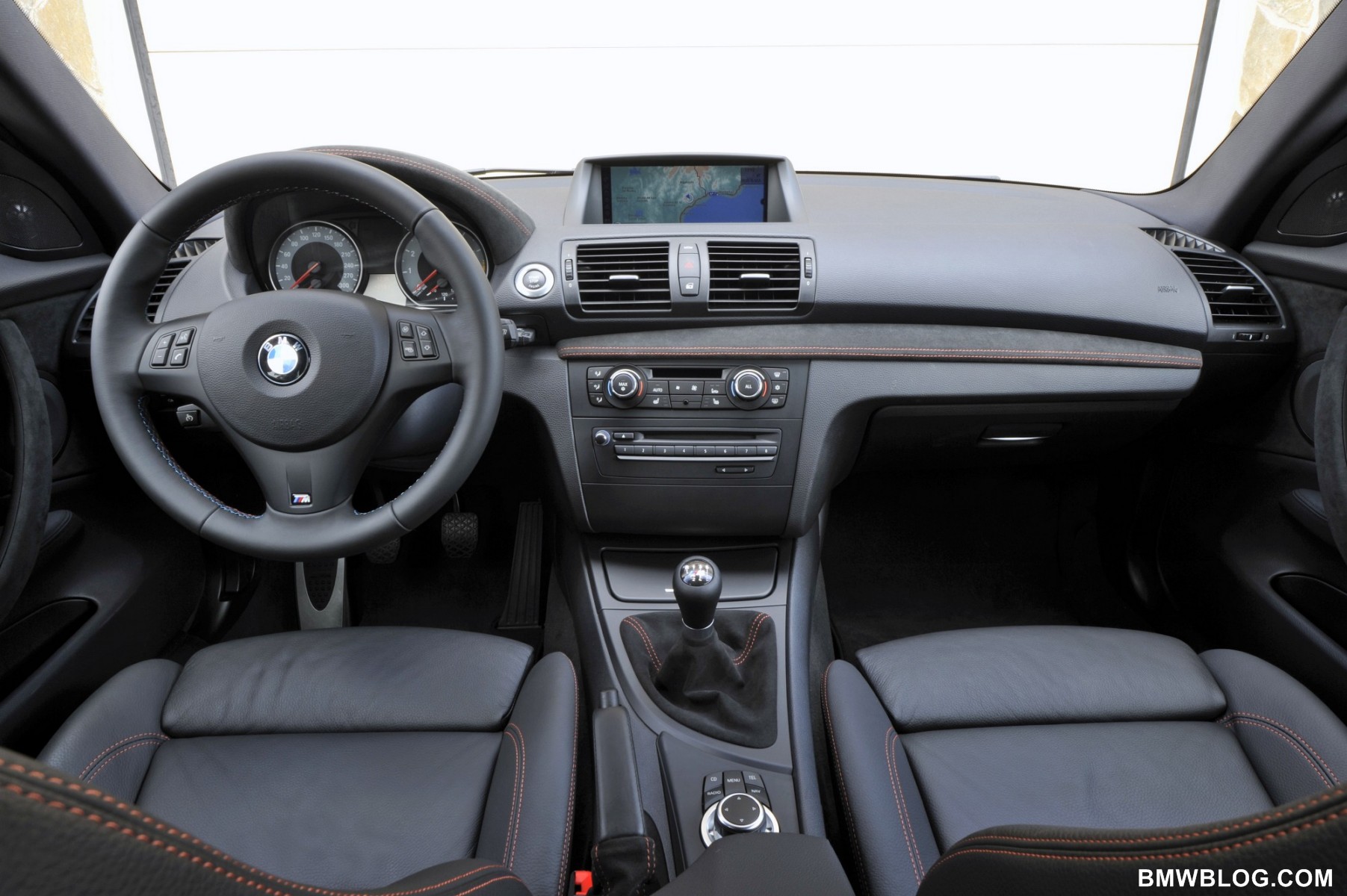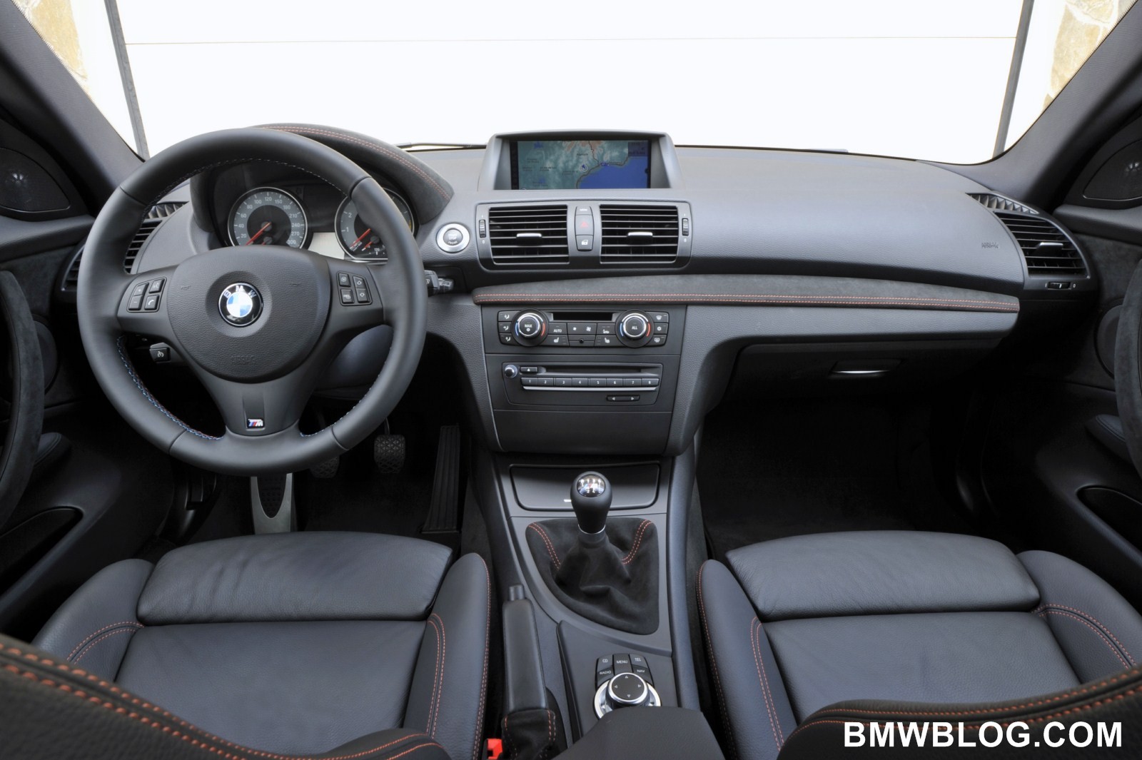 The M-specific cockpit developed exclusively for the BMW 1 Series M Coupe is designed to facilitate focused, sporty driving. High-quality, dark Alcantara with orange contrast stitching covers the door panels, door pulls, instrument cluster binnacle, dash panel, and gearshift and handbrake lever boots. The driver’s attention is focuses on an M-specific instrument cluster with gray dials, classic M red pointers, and white backlighting. An M driver footrest and M entry sills round off the unique interior.