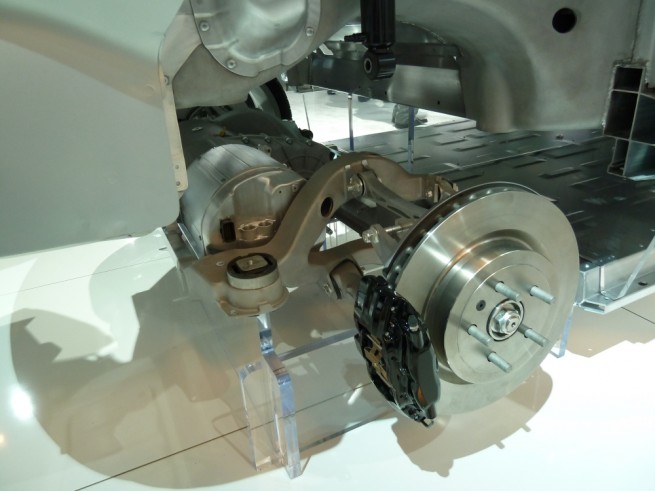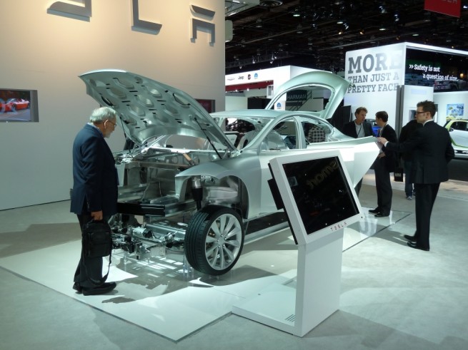 Tesla was displaying an ‘exploded’ S chassis. What is truly neat about it is the placement of the batteries. They are in a separate tray slung under the body of the vehicle. Weight placed in the best possible place. The electric drivetrain fits neatly into the space occupied by differential and axles in a conventional car.