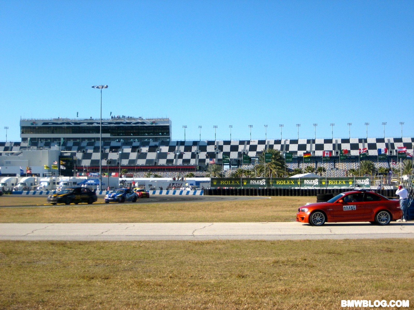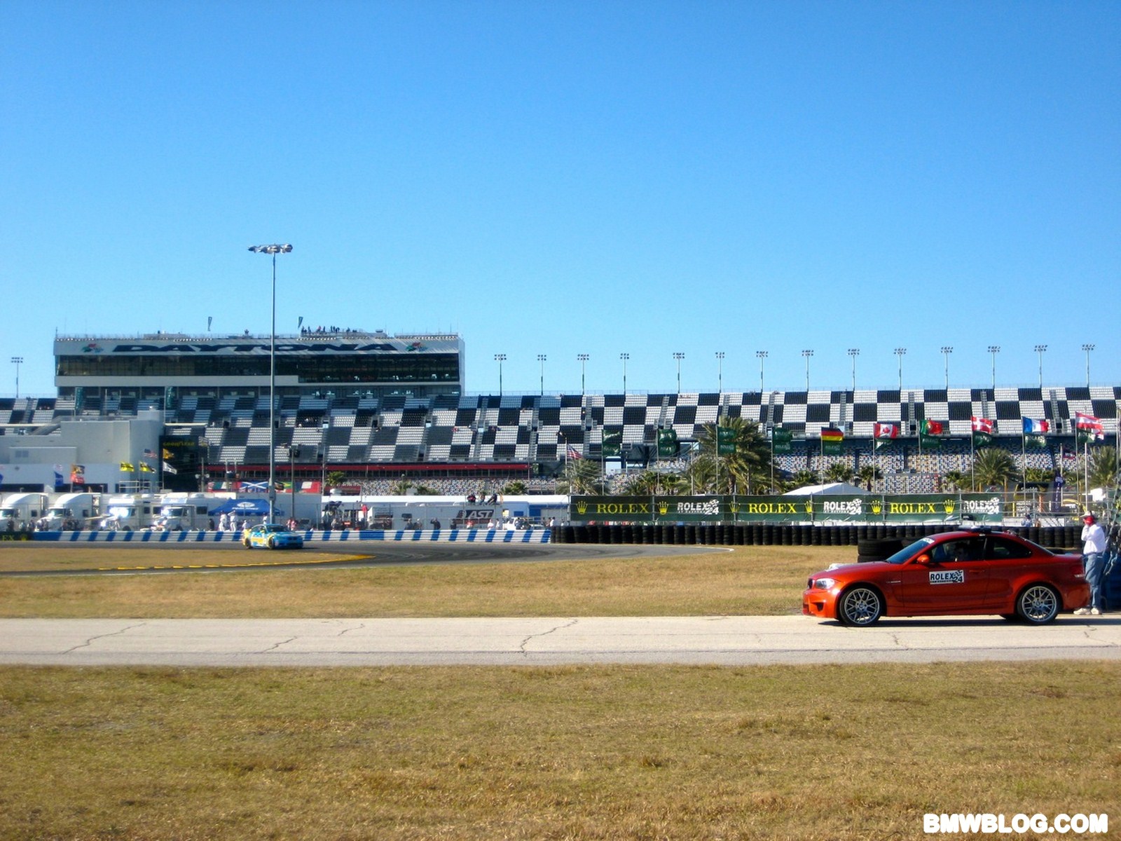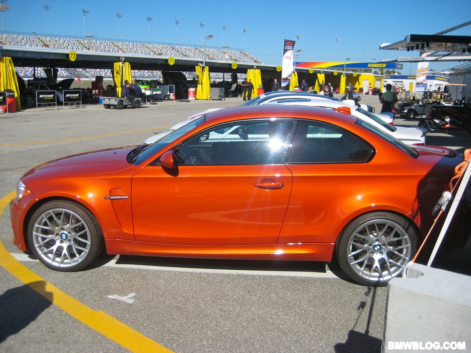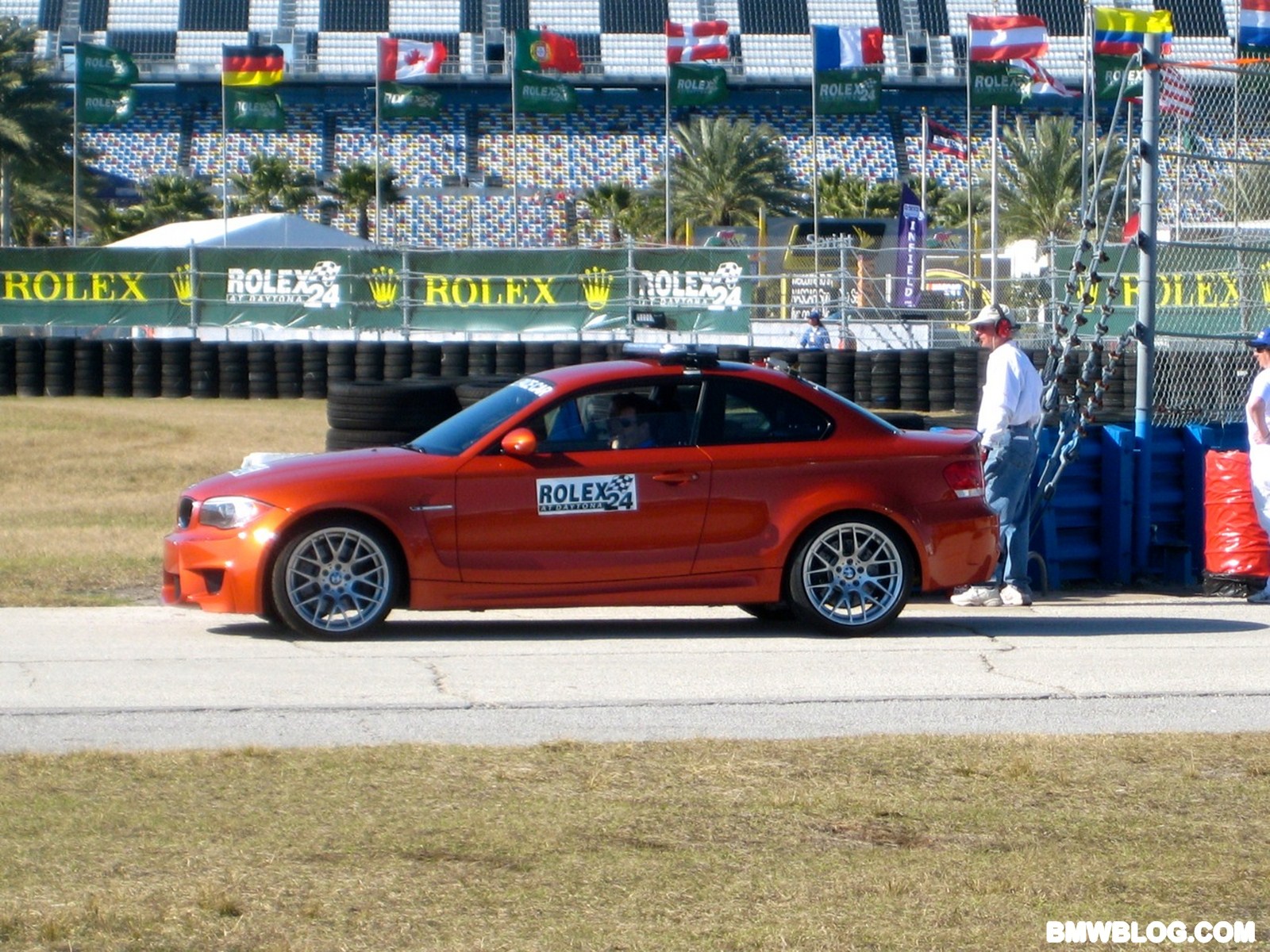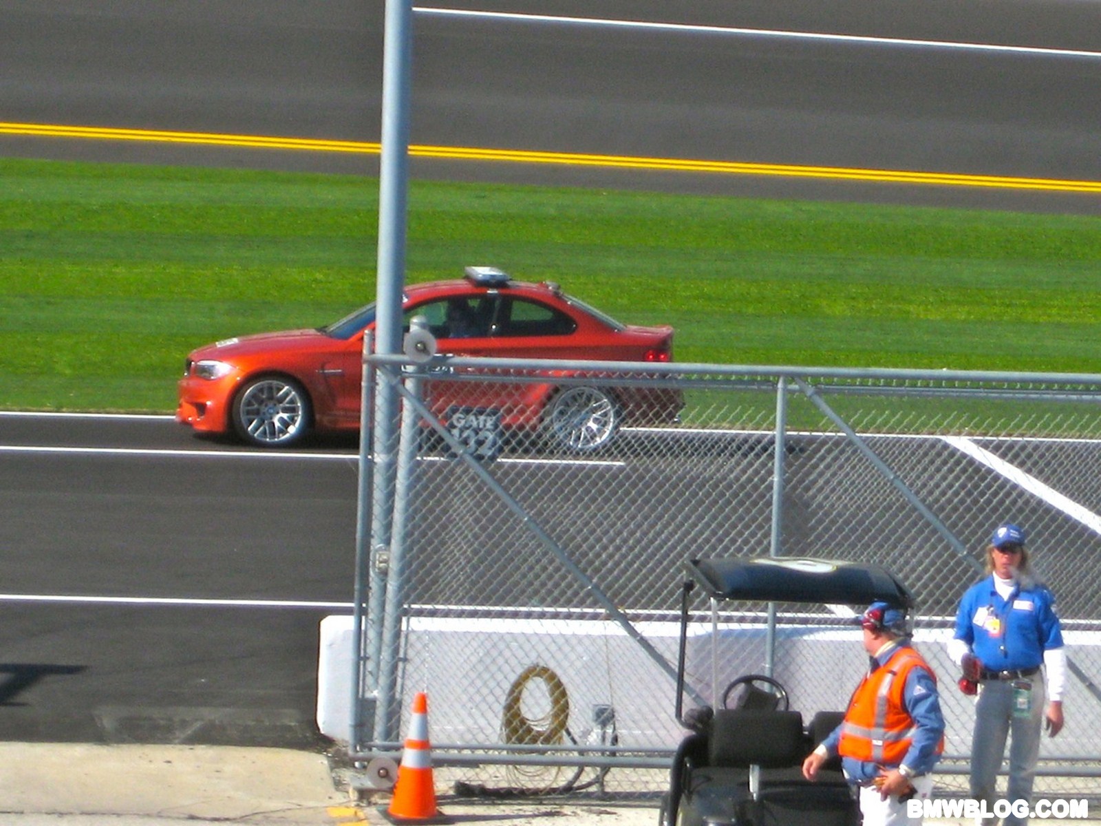Courtesy of our reader Brendan Smith, we have new photos of the 1M preparing for the race tomorrow. As seen earlier in our first photos, the pace car markings on the 1 M Coupe are minimal with only a few stickers and the light bar across the roof.