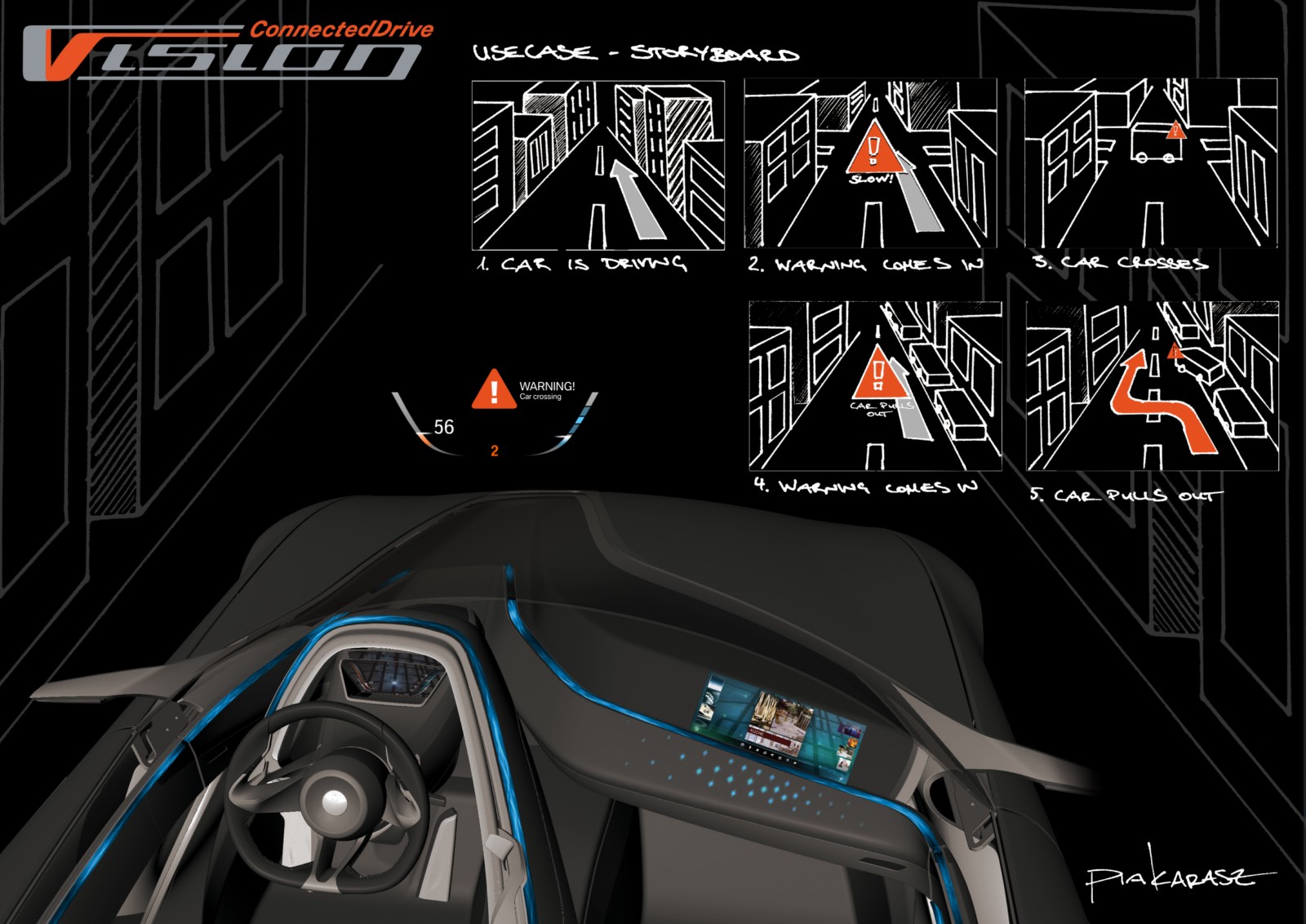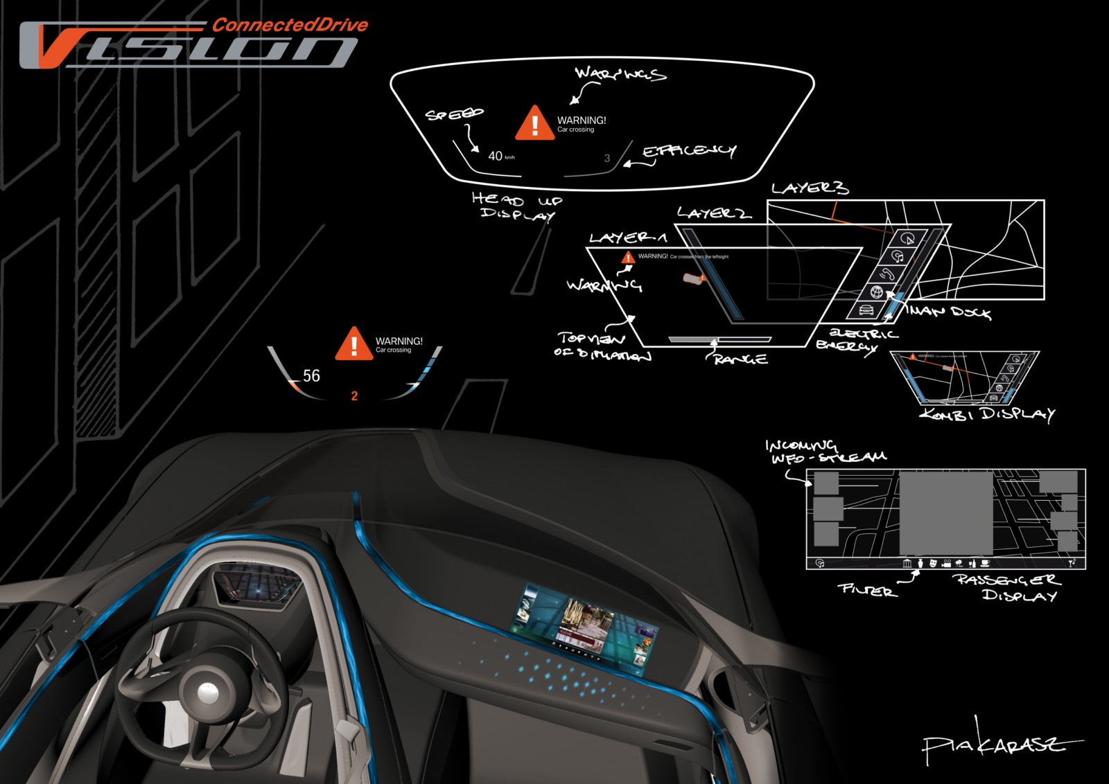 The BMW Vision ConnectedDrive concept car was consciously designed as a roadster, as the vehicle is able to show its overall creative concept best by way of the open roadster design. Seen from above, the interior design, light concept and exterior design fuse into a very clear, unmistakable statement:Â BMW ConnectedDrive.