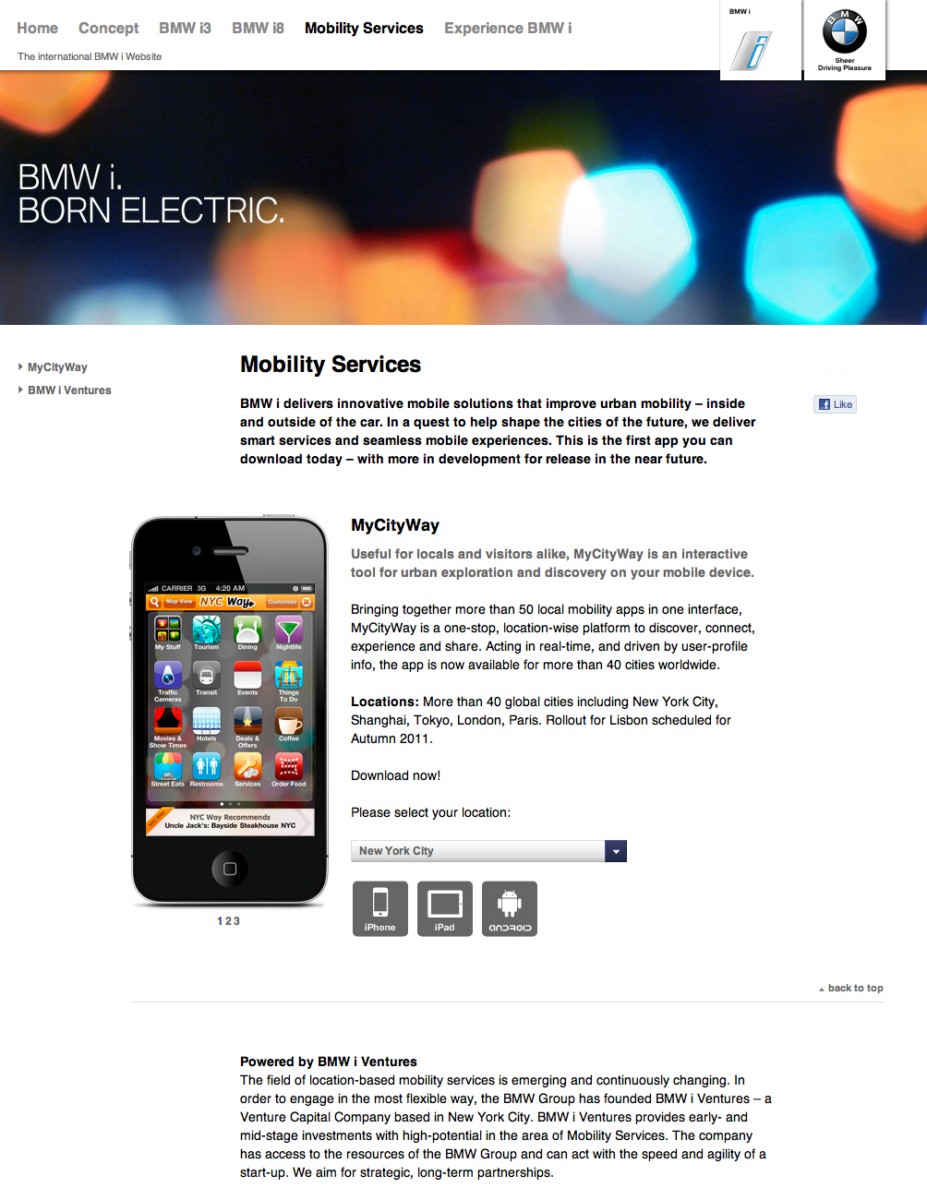 New York-based My City Way is the first company in which BMW i Ventures has taken a stake. Of the partnership, Ian Robertson said, “I am thrilled to announce that we have just signed our first strategic partnership with My City Way. As a mobile app, My City Way provides users with information on public transportation, parking availability, and local entertainment for over 40 cities in the US. Another 40 cities will be part of the global rollout, including Munich, of course.”