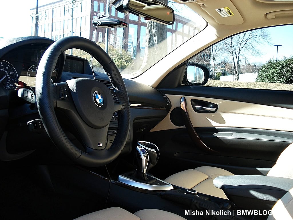 My favorite interior features are the thick leather wrapped M Sport steering wheel, gauge pod layout, and driver oriented center stack. The proper left down, right up steering wheel mounted paddles come in handy when doing spirited driving.The seating position is comfortable for drivers of all sizes and the greenhouse is open and airy, giving me great visibility in all directions. The top of the door panel is just about parallel with my left shoulder. The 1er Coupe has slightly less head and shoulder room than the 3 Series, but it’s barely noticeable. I’m 6’2” athletic build, and fit very comfortably in the supportive leather trimmed sport seat – they are some of the best in the business.