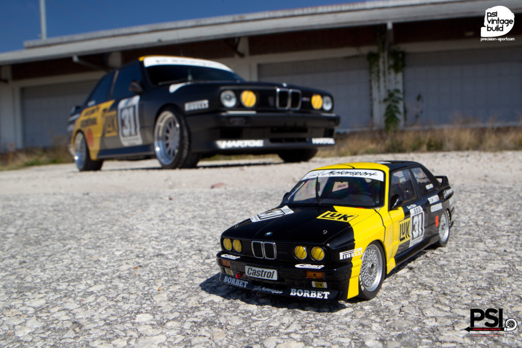 Enter the Kurt Thiim 1988 DTM Race Car created by Precision Sport. Using the 1:18 scale model as a guide, the DTM project was done with matte in mind. The mod list includes S52 Swap w/ OBD 1 Conversion, full custom exhaust and RD Sport RHD Headers, Euro 3.5 HFM w/ 24 lb injectors, Custom AA tuning, 3M Matte Black Complete Wrap, 3M Matte DTM Livery w/ Custom Cut Matte Decals and Lambo Pearl Yellow Striping, 17 inch Hartge 3 piece Wheels, TC Kline Racing SA Coliover Suspension and RECARO Pole Position Seat.