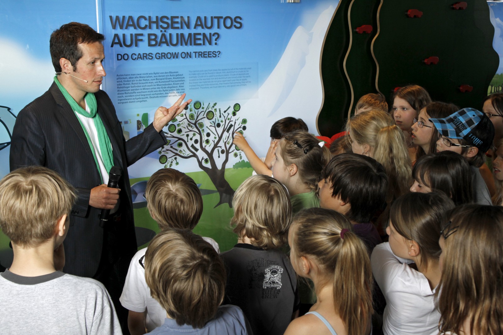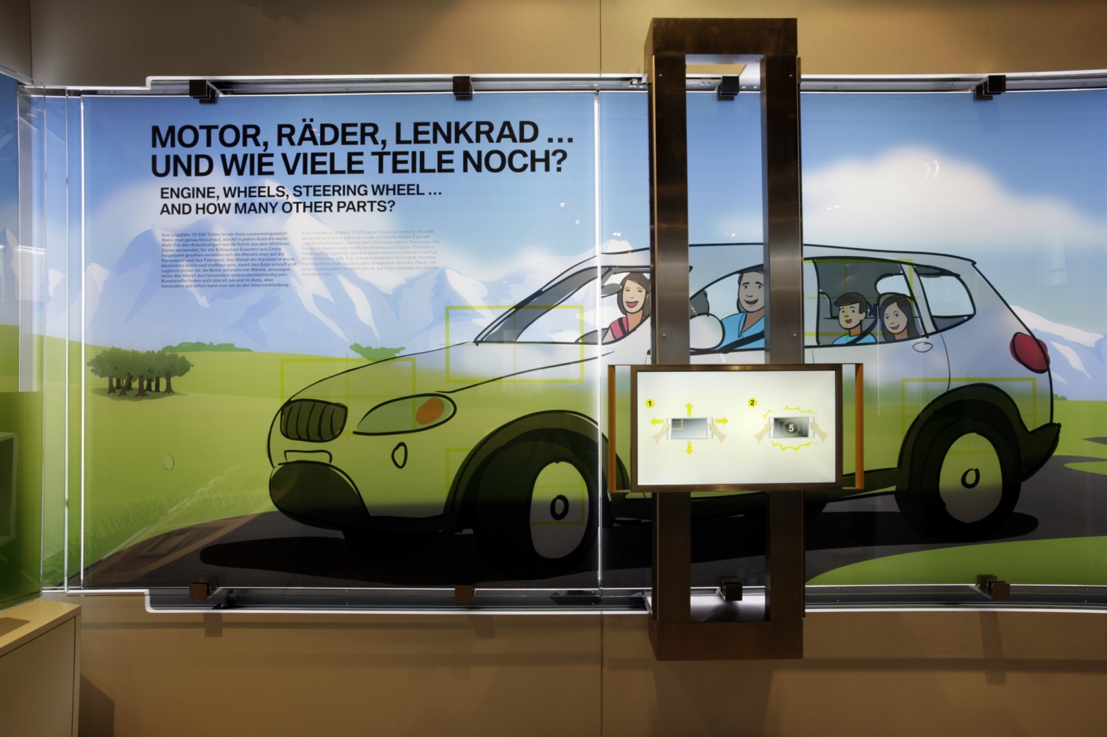 The new Junior Campus Portal visualizes a vehicle’s lifecycle with respect to sustainability. Six workstations – ranging from raw material sourcing to the production line and the recycling of parts – explain this cycle in a way that is easy to understand, hands-on and self-explanatory. All exhibits are identical as far as their structural setup is concerned: Each of them includes a brief explanation as well as age-appropriate possibilities of interaction for children.