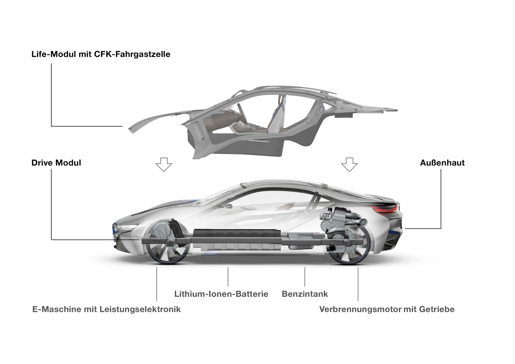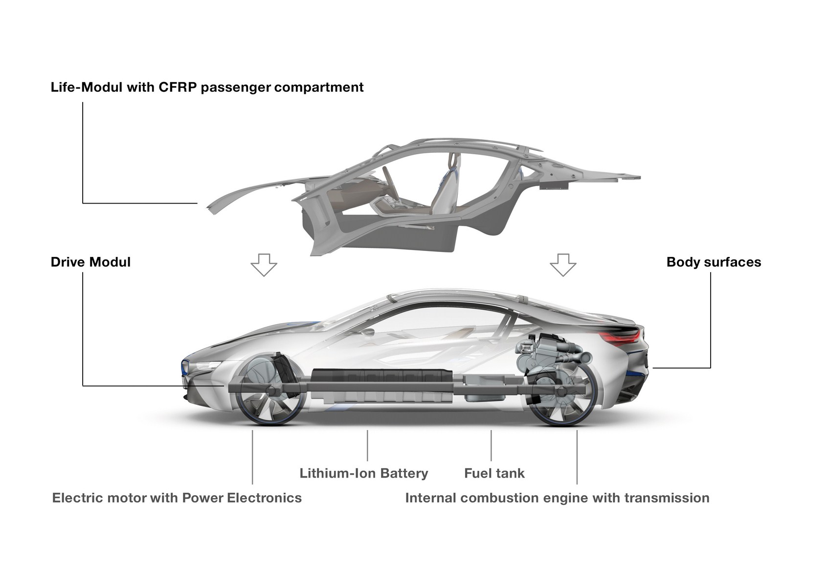 The BMW Group engineers took a different approach, focusing squarely on the eventual usage of the BMW i vehicles in developing the LifeDrive concept. This new vehicle architecture meets the full range of technical requirements of an electric drive system (including a large battery), while keeping weight low, maximising range, creating generous levels of space, enabling supreme driving characteristics, and ensuring impressive safety for the battery and passengers alike.