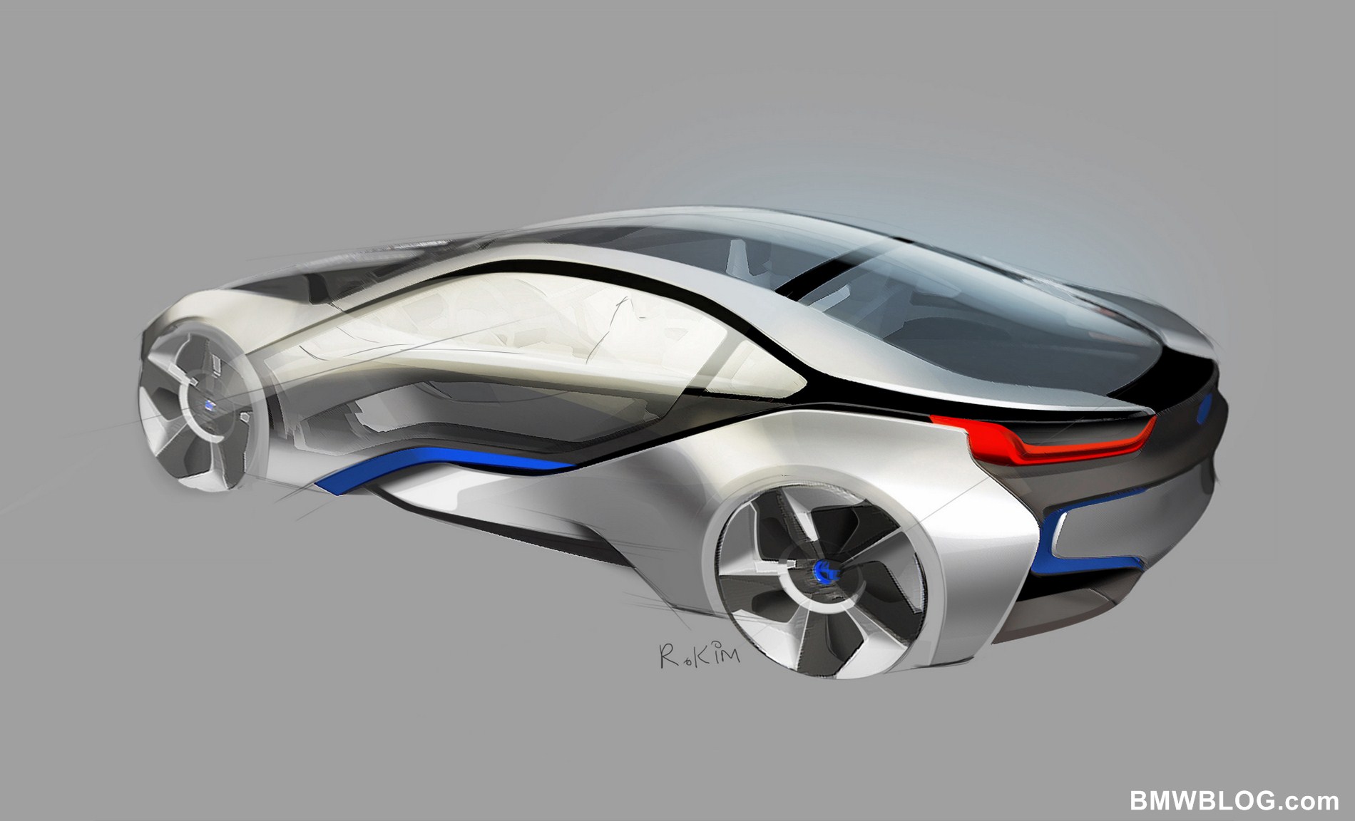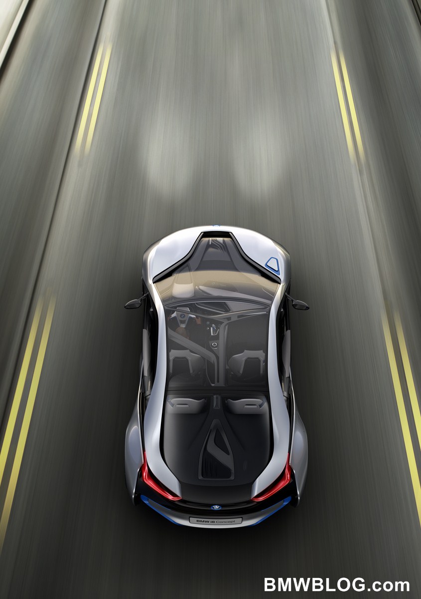 The design of the BMW i8 Concept is as special as the car’s overall concept, embodying the perfect synthesis of technology and aesthetic allure. Its sweeping lines and flat silhouette lend the vehicle a strikingly dynamic appearance even when standing still. Taut surfaces and precise edges combine to form an extremely sculptural and organic surface structure. The BMW i8 Concept appears to have been cut from a single mould, with the front end, flanks, rear end and roof flowing smoothly into one another. Dynamic surfaces and forms generate attractive light and shadow effects, which add emotional emphasis to the car’s light and sporty character. A large, transparent greenhouse lends the exterior an extraordinary feeling of lightness and highlights the exceptional efficiency of this vehicle concept. Short front and rear overhangs round off the sporting overall impression. Despite its dynamic appearance, the 2+2-seater can accommodate four people, giving it a high degree of everyday practicality.