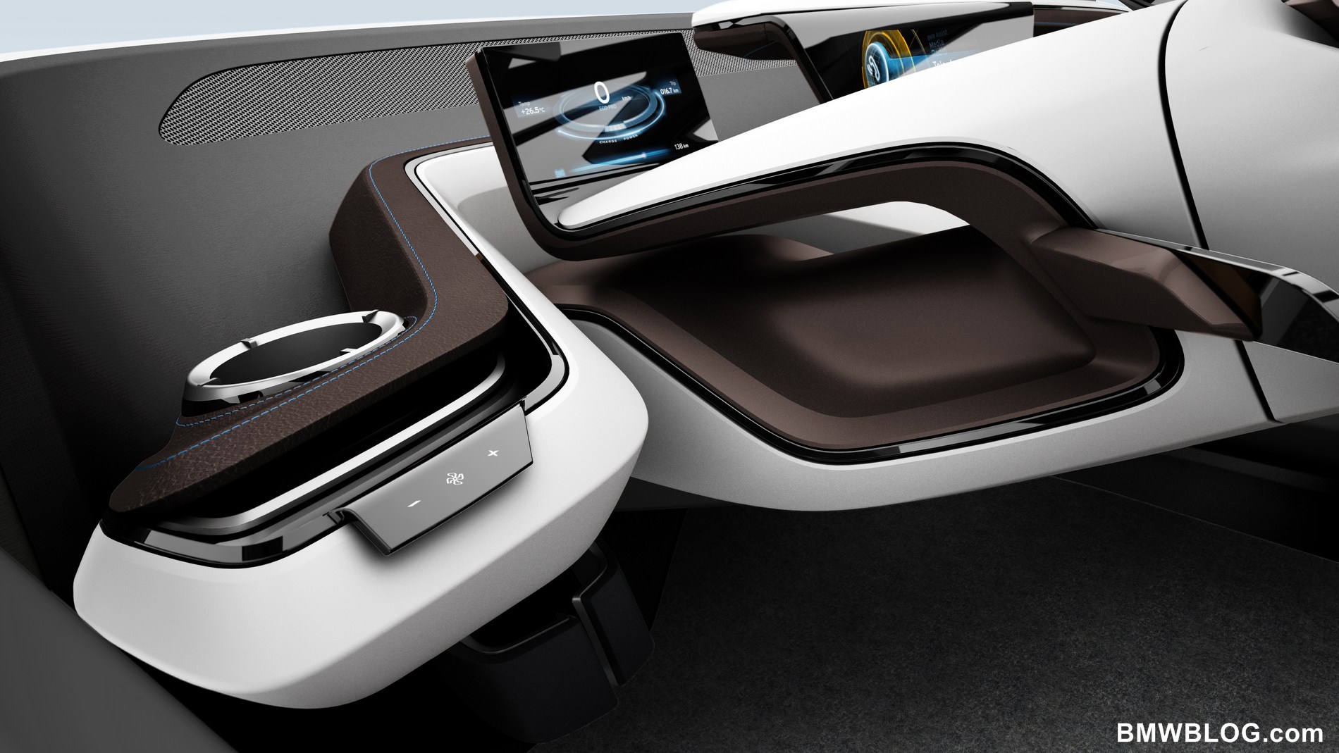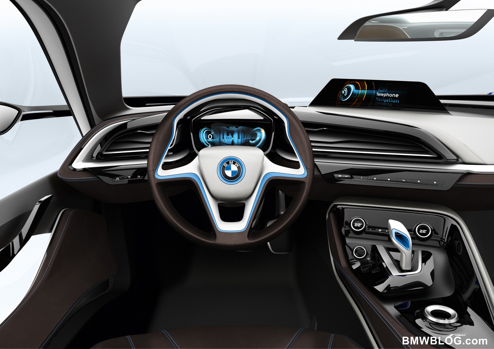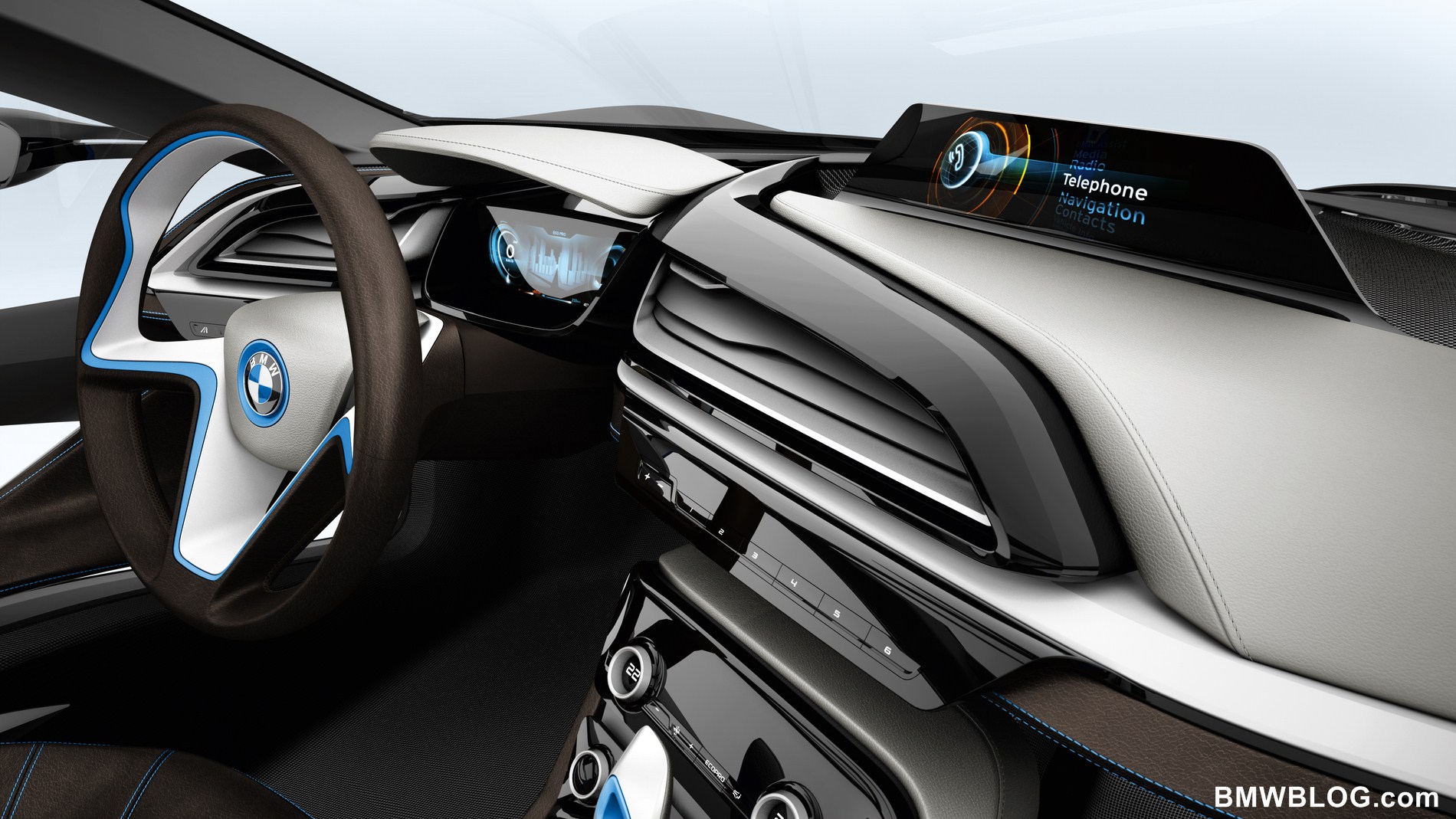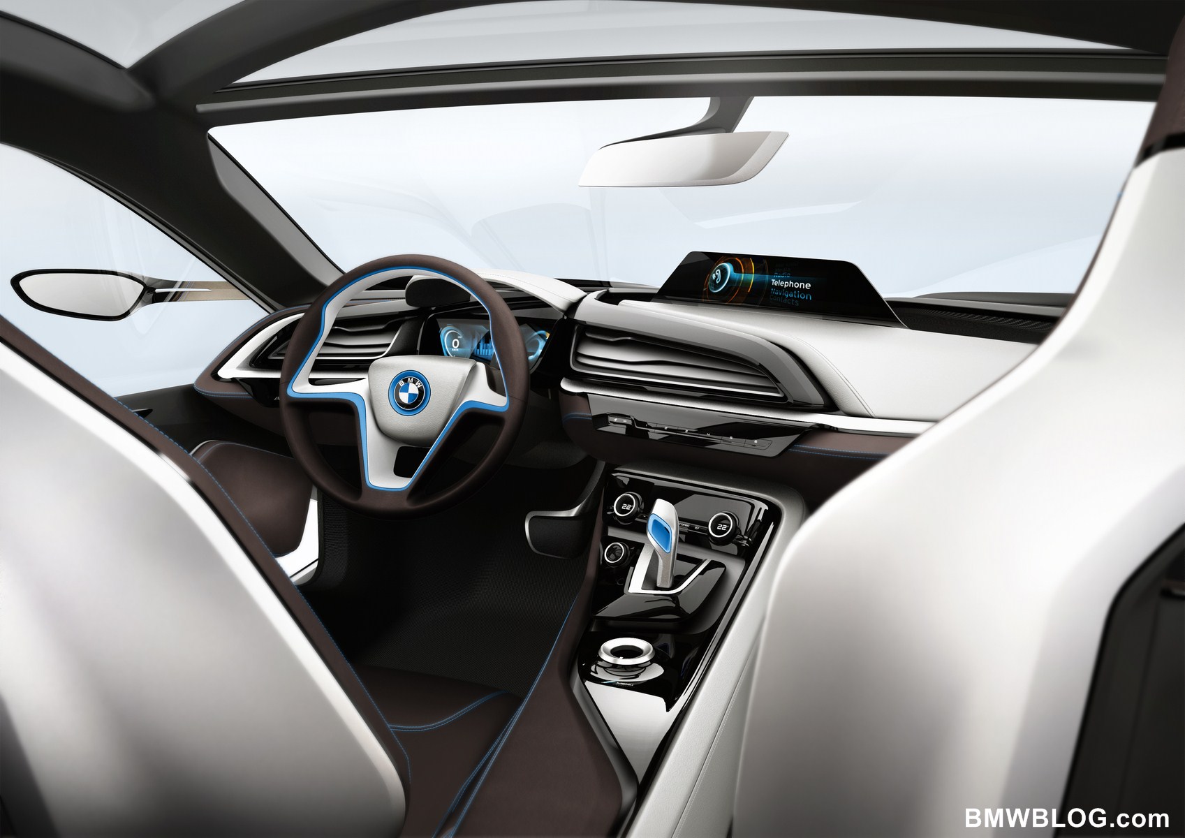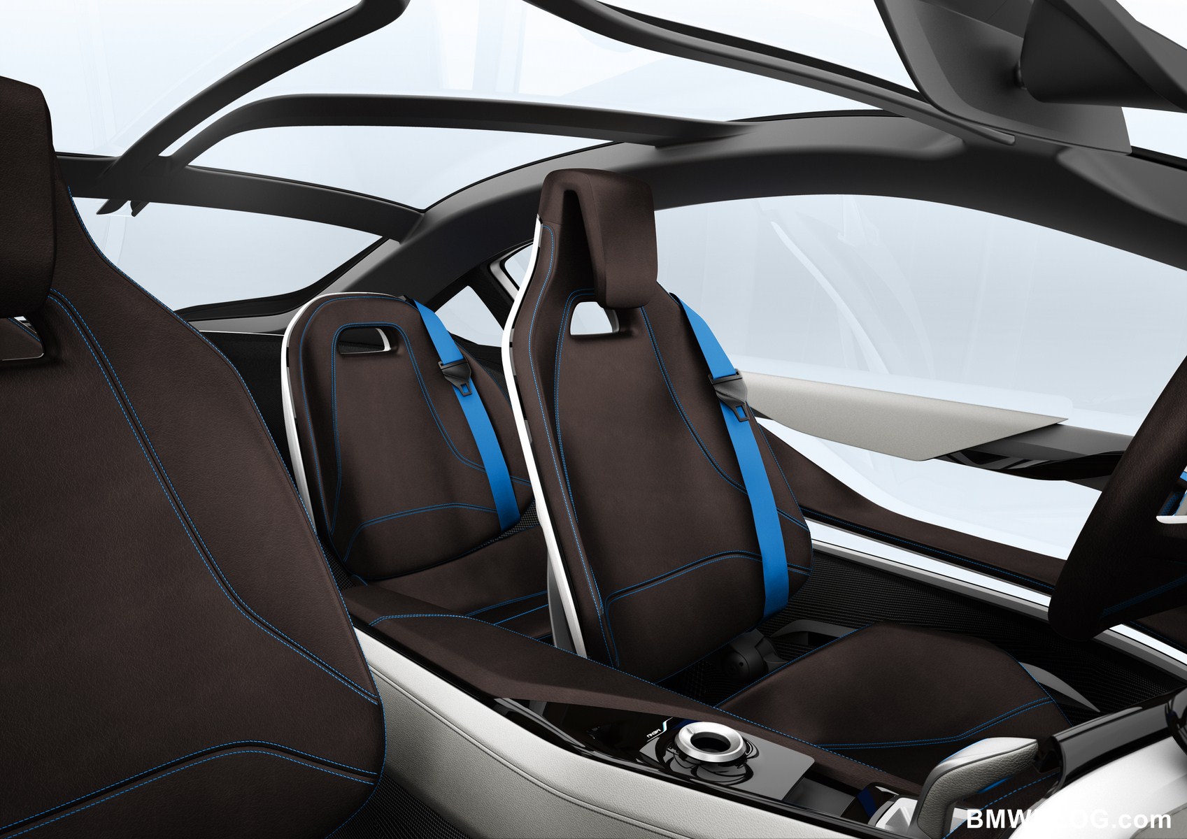 The transparent surfaces in the doors and roof give the exterior and interior design of the BMW i8 Concept the appearance of merging into one another. The clear forms of the interior provide an attractive contrast to the dynamically flowing exterior and lend the cabin a special lightness and dynamic flair. The colour concept and underlying structure of the BMW i8 Concept interior closely mimic those of the BMW i3 Concept. Here again, the Porcelain White support structure, black technical level and comfort section with Mocha Brown leather are split into three different layers. Stream Blue touches on the centre console, instrument panel and seats lend stylistic expression to the efficiency and sustainable character of BMW i in the interior. Naturally tanned leather and warm colours underline the light, high-quality and sustainability-focused ambience inside the BMW i8 Concept. A light felt with three-dimensional meshing provides the floor covering and emphasises the dynamic flavour of the interior as a whole.