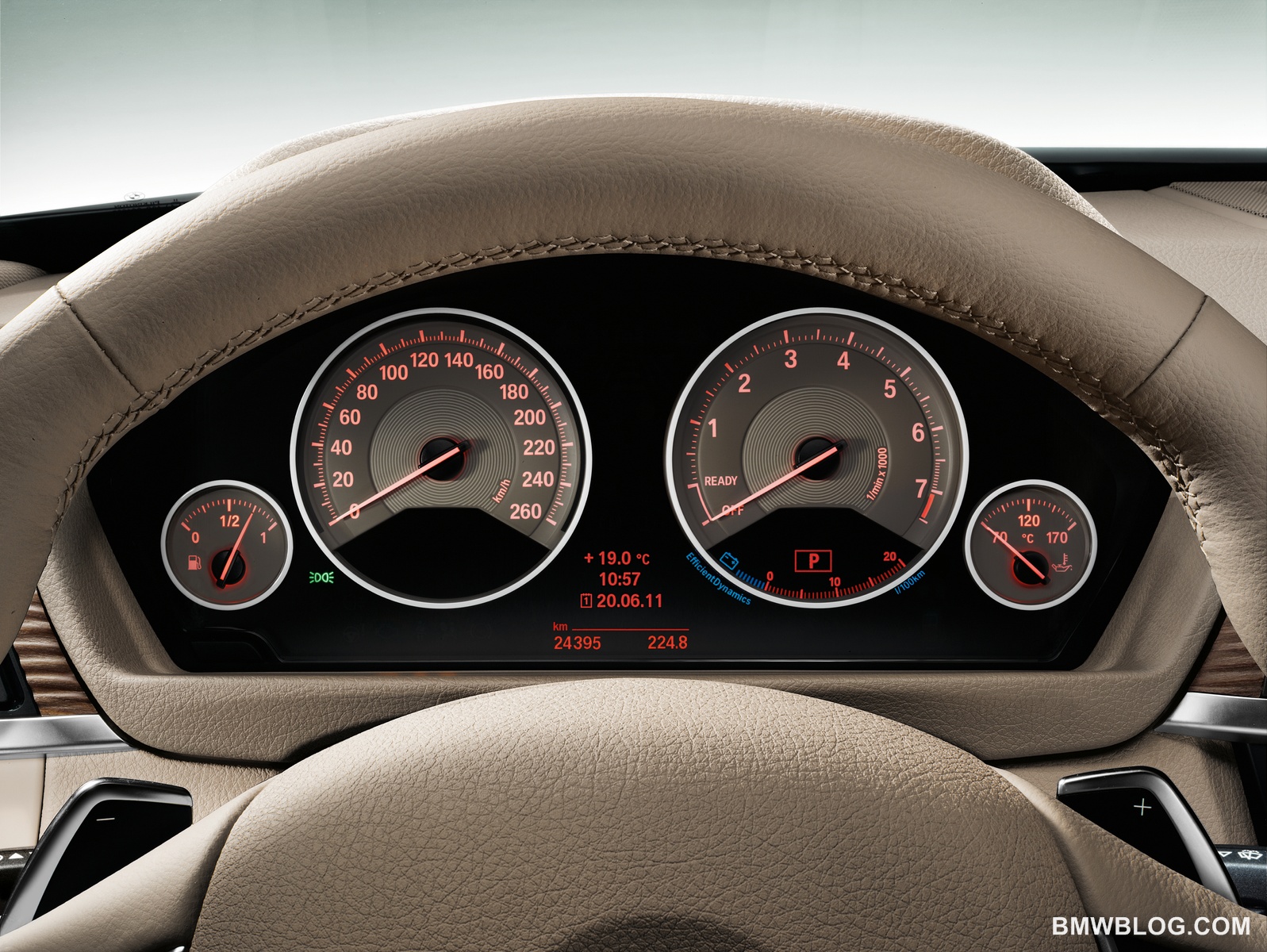 The cockpit’s four circular dials (fuel gauge, speedometer, tachometer and oil temperature gauge) come with a black panel display. Positioned on the horizontally-structured instrument panel, the freestanding iDrive monitor with slim, transreflective, high-resolution display recalls the latest flatscreen televisions normally found in living rooms rather than cars.