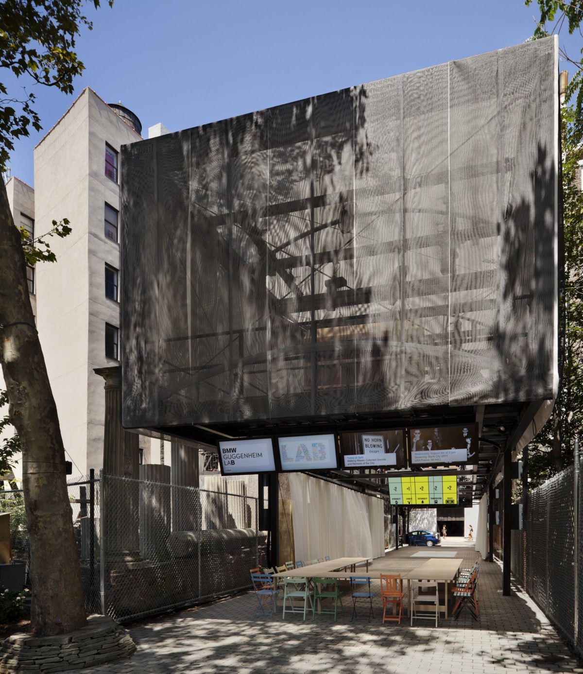The BMW Guggenheim Lab New York was located at First Park, Houston Street at 2nd Avenue, and housed in an innovative mobile structure designed by Tokyo-based architects Atelier Bow-Wow. Over 53 days, the inaugural BMW Guggenheim Lab—a combination think tank, public forum, and community center—offered 58 talks, 48 workshops, 28 screenings, 24 special events, 21 tours, and nine fieldwork sessions, all of which were developed by the New York Lab Team, together with Guggenheim curators, to explore urban issues and strategies relating to the theme of Confronting Comfort.