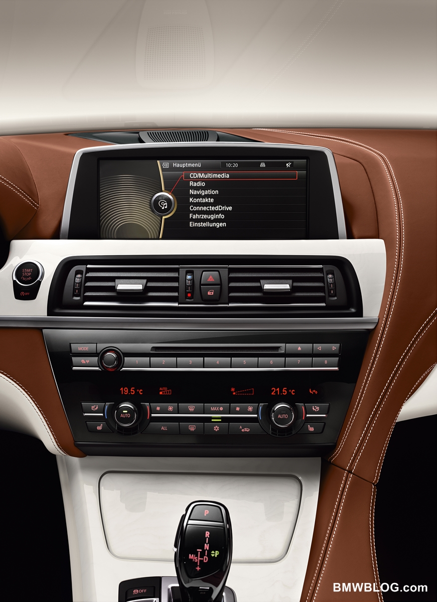 The interior of the BMW 6 Series Gran Coupe reveals the driver-focused cockpit design typical of the brand and a luxurious ambience for all those on board. The central section of the instrument panel is angled slightly towards the driver and the gear selector for the automatic gearbox, the Driving Experience Control switch and the activation button for the parking brake are all positioned on the surface of the center console which opens out towards the driver.