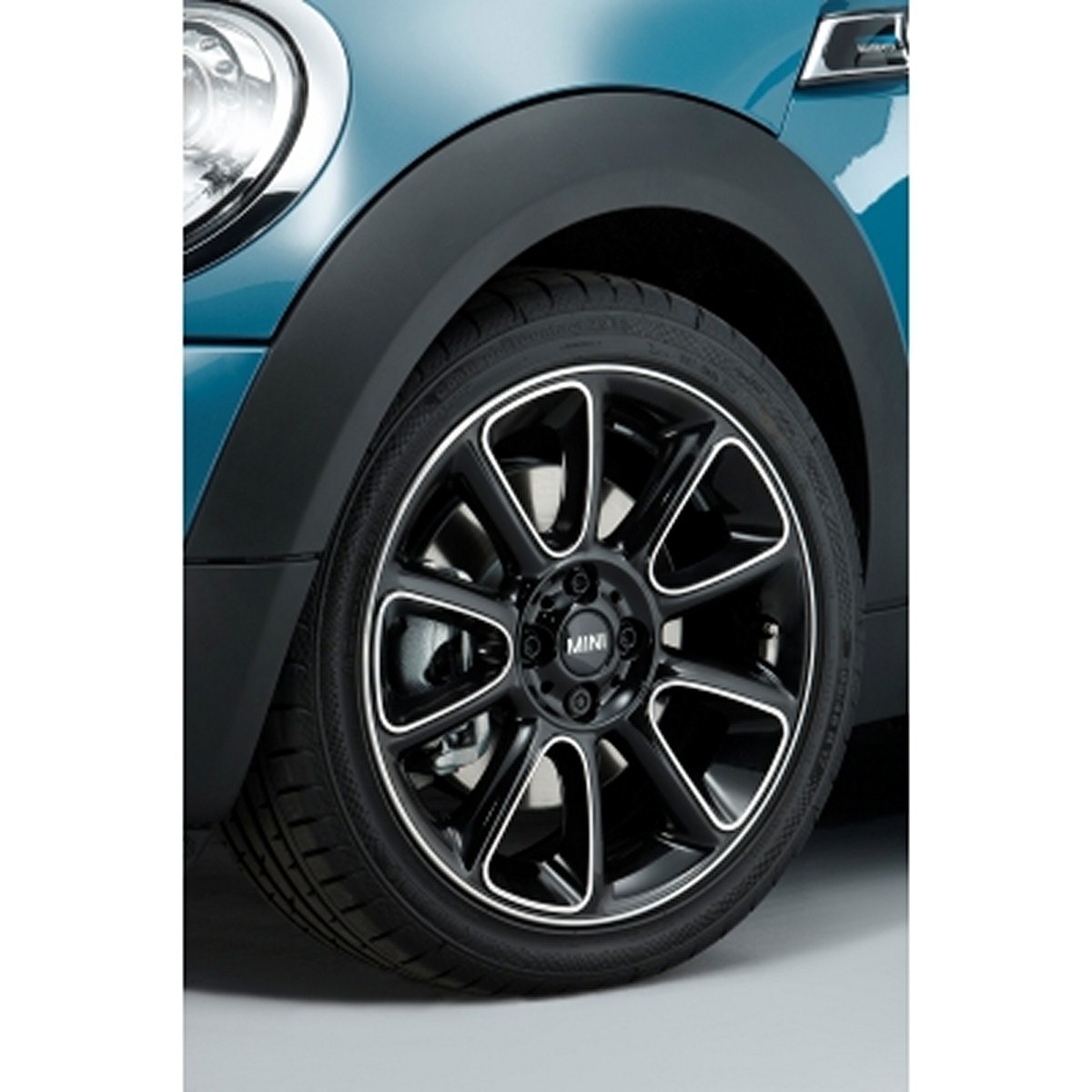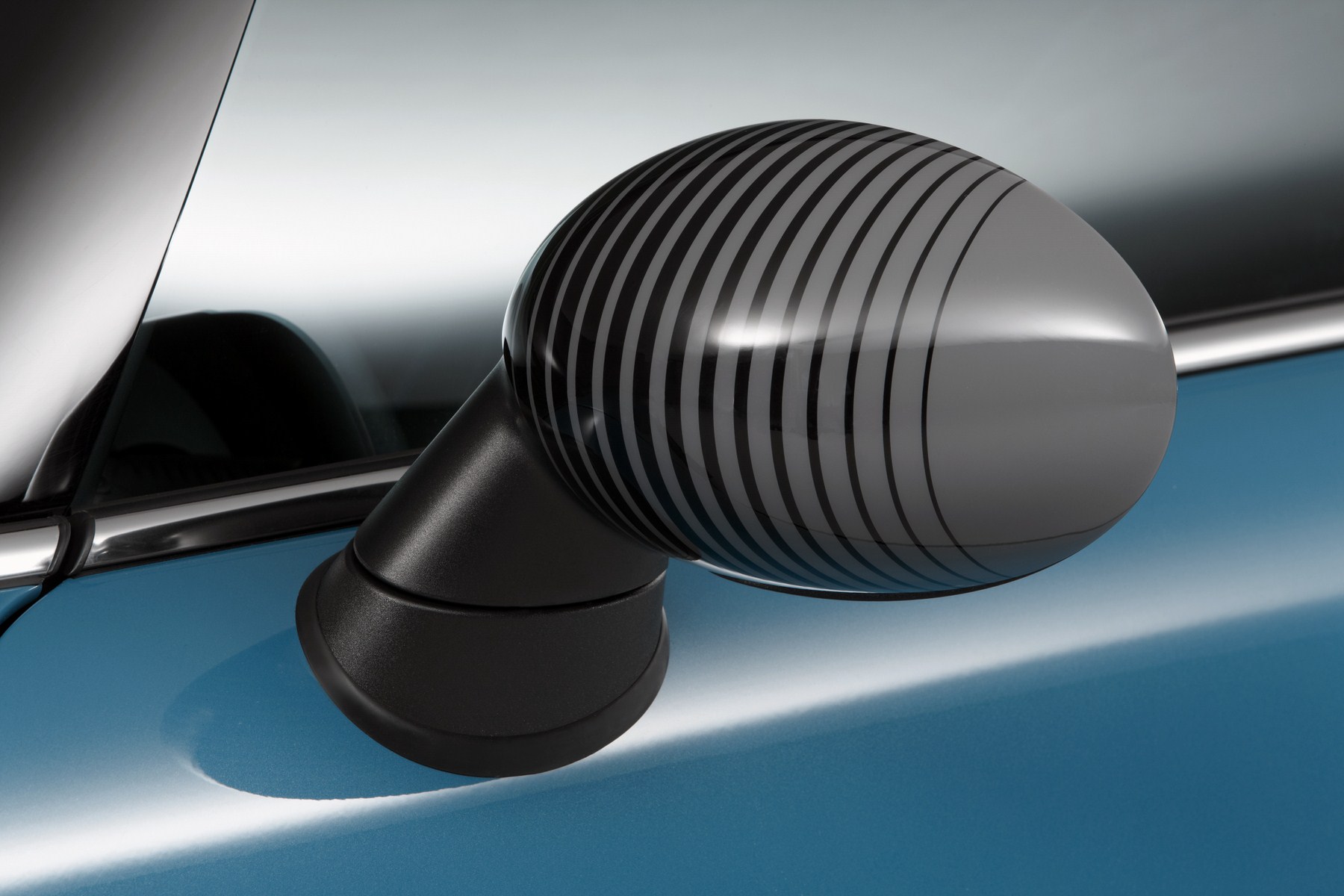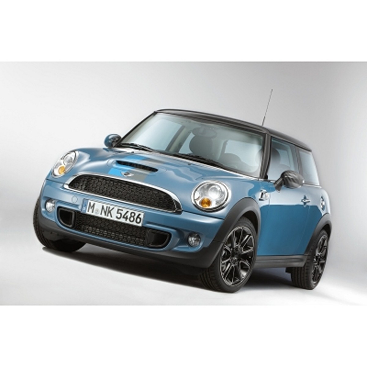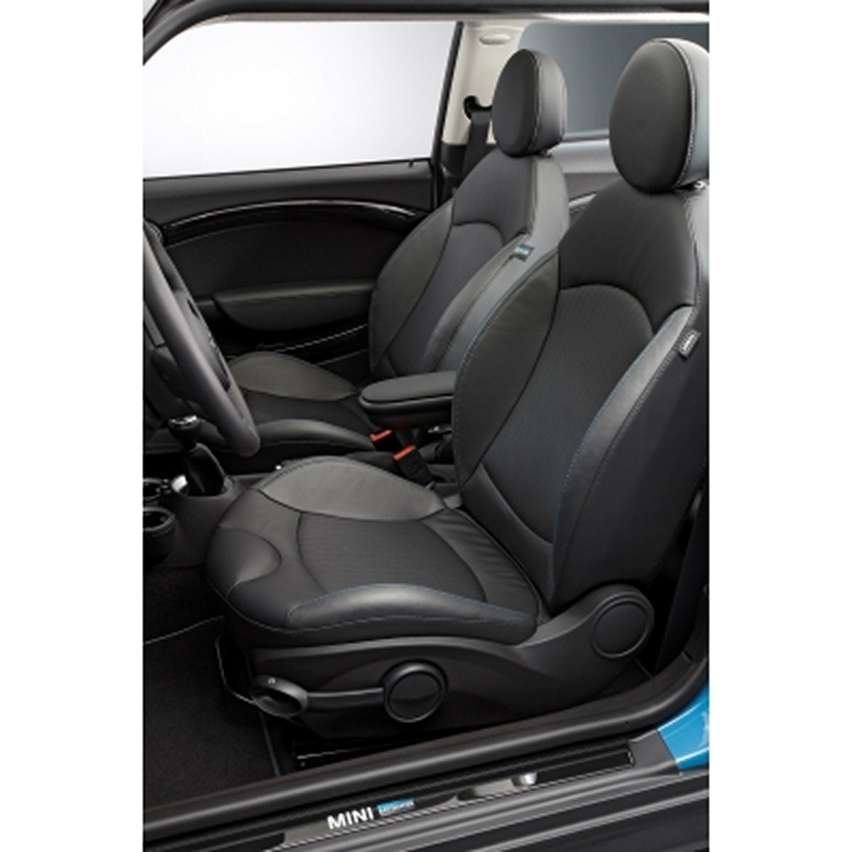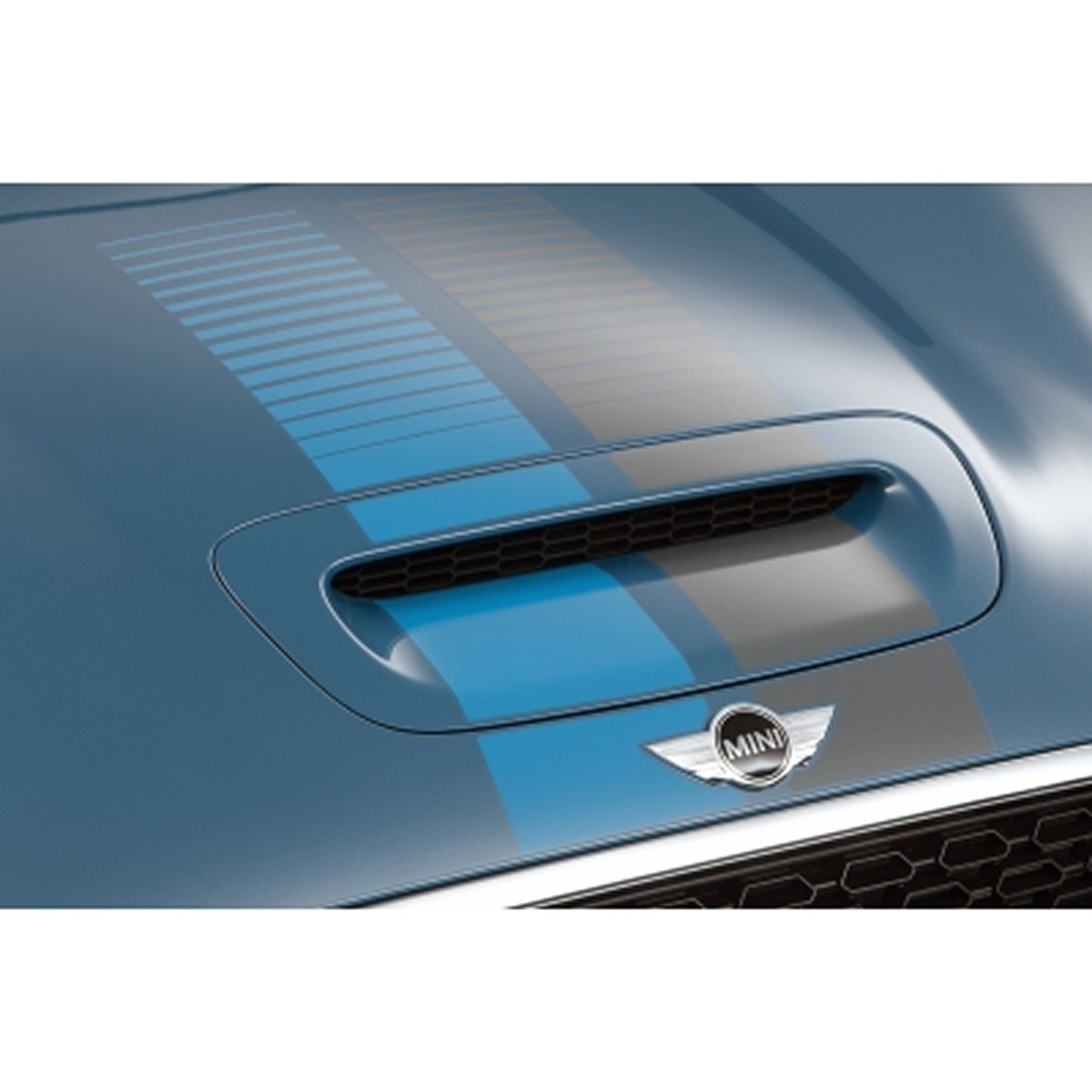 The MINI Bayswater wears its inherent sporting élan and extrovert style very much on its sleeve. The Kite Blue metallic exterior paintwork was created exclusively for the special-edition model, as was the interior design and 17-inch light-alloy Sandblast wheels with high-gloss black surfaces and bright machined rim and spoke edges. Midnight Black metallic and Eclipse Grey metallic paint shades can be ordered for the MINI Cooper S and MINI Cooper SD as an alternative to the new, radiant Blue finish. The sporty appearance of the MINI Bayswater is emphasised by the black contrasting roof and the likewise newly created Sport Stripes for the bonnet, which streak dynamically towards the windscreen. The exterior mirror caps carry an identical stripe design – blue on the right-hand side of the car, grey on the left.