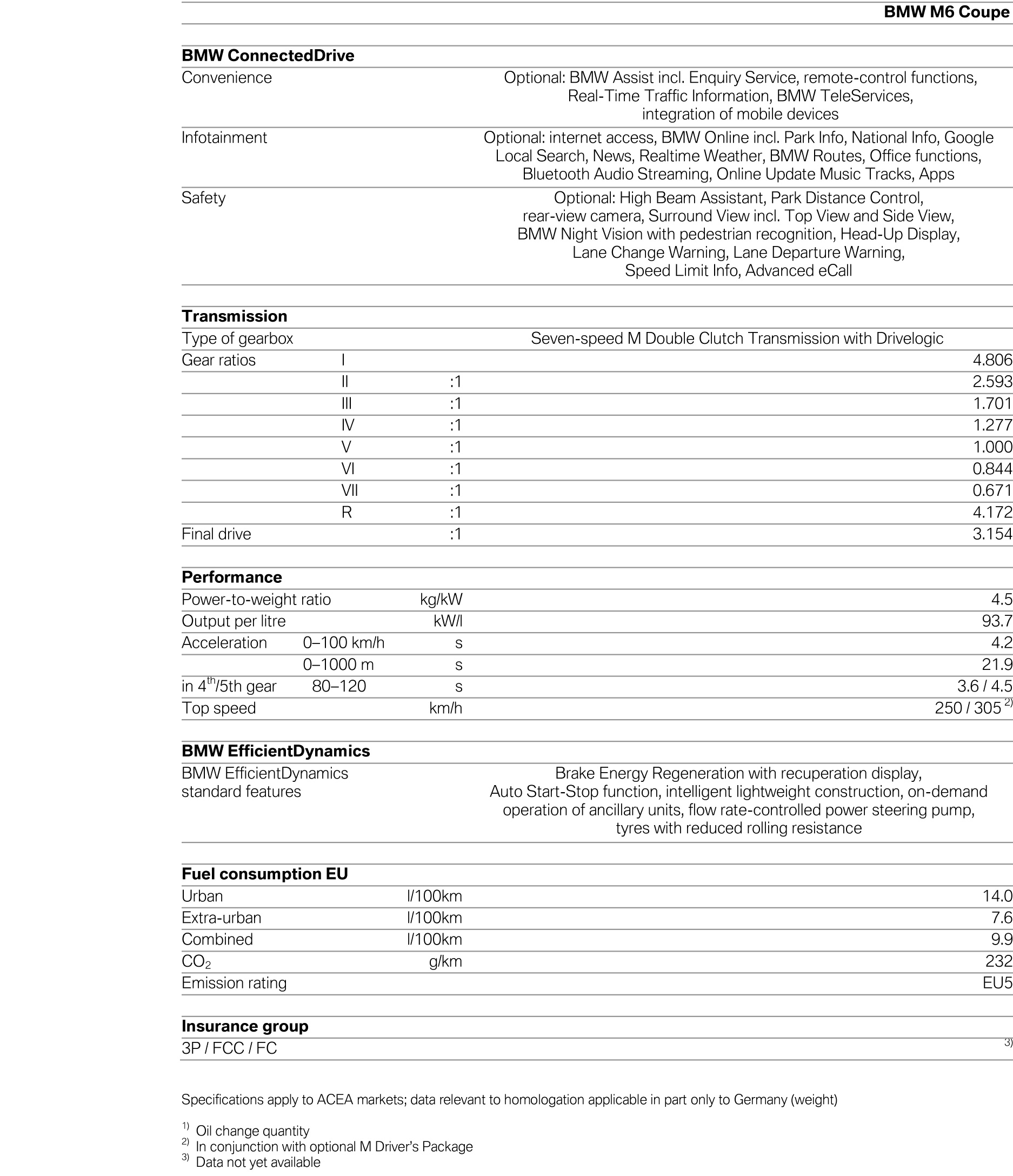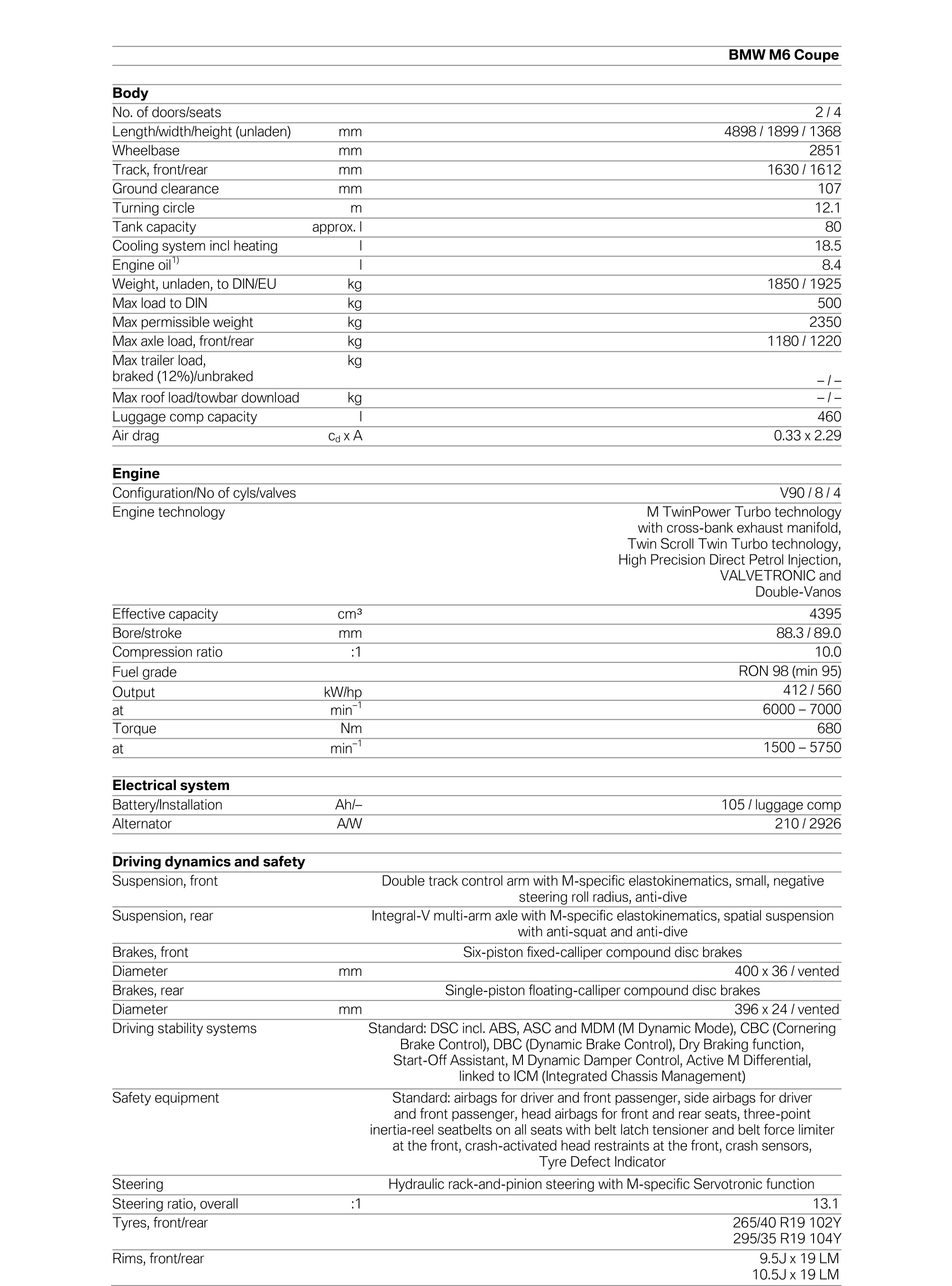 The engine’s exhilarating thrust gives the new BMW M6 models impressive acceleration. The instant power delivery and sustained thrust of the engine results in an acceleration of 0– 62 mph (0-100 km/h) in 4.2 seconds for the Coupe and 4.3 seconds for the Convertible. The sprint from 0–124 mph (0-200 km/h) takes only 12.6 seconds for the Coupe and 13.1 for the Convertible. The top speed of both models is electronically limited to 155 mph (250 km/h). While the engine’s output has increased by around 10% and maximum torque is up by more than 30%, the new BMW M6 models consume roughly 30% less fuel and have substantially higher range than their predecessors.