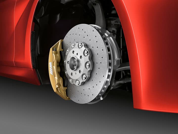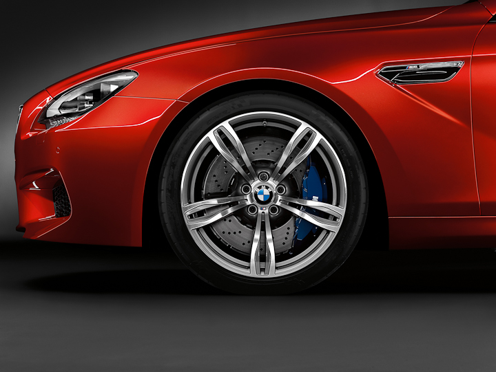 The new BMW M6 Coupe and Convertible will be the first cars in the history of BMW M to be offered with optional M Carbon-Ceramic brakes (in conjunction with 20-inch M light-alloy wheels as of July 2012 production). These new brakes are without parallel and take the cars stopping power to another new level – especially at the race track. The brake rotors measure 16.1 inches (410 mm) in diameter at the front and 15.6 inches (396 mm) at the rear. Made from a carbon-fiber ceramic compound, the rotors boast even greater resistance to heat combined with significantly reduced rotating masses. The M Carbon-Ceramic brakes are 42.8 lb (19.4 kg) lighter than the standard brakes, yet the innovative material also displays exceptional resistance to wear, and the operating life of the rotors is many times that of conventional equivalents. The optional M Carbon-Ceramic system also sees six-piston fixed radial calipers at the front teamed with single-piston floating calipers at the rear. The M Carbon-Ceramic system can be easily identified through the wheels by the special gold-colored calipers.