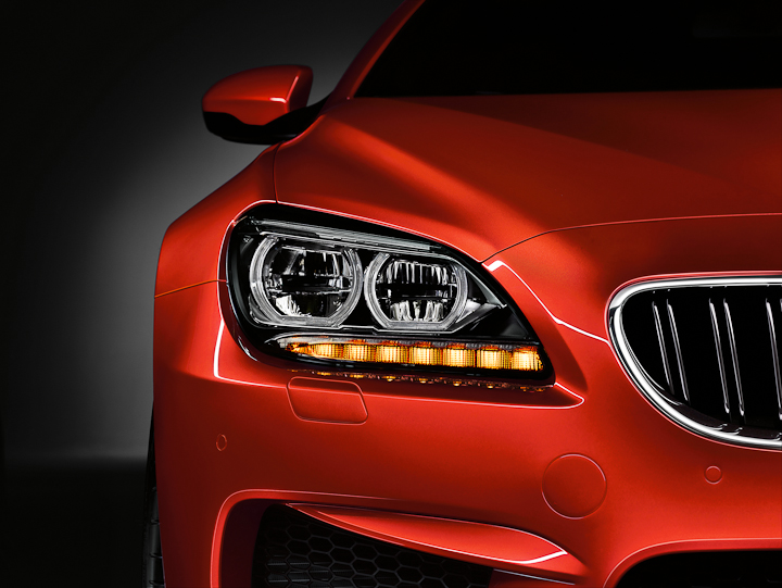 An LED accent light cuts across the tops of the standard Adaptive Xenon Headlights. The bright white, three-dimensional LED corona rings are leveled off to striking effect at the top and lower edges. Adaptive LED Headlights are available as an option on both M6 models. The LED sources in these headlights are placed on a horizontal rib running through the center of the units and feed their light into the reflectors in front of them. This ensures that the distinctive appearance of the twin circular headlights comes across clearly in every situation. The turn signals – in the form of horizontally arranged LED units – are integrated into the headlight units below the light rings.