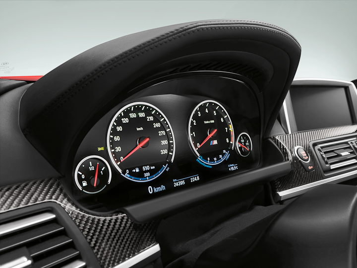 The instrument cluster with black-panel-technology includes classic circular instruments in traditional BMW M car style, with red needles and white illumination, as well as model-specific displays and the MÂ logo on the rev counter. The shift program currently selected and gear engaged are shown in the center of the instrument cluster. Feedback from all the drive and chassis settings selected at the touch a button are also displayed in the instrument cluster under the tachometer.