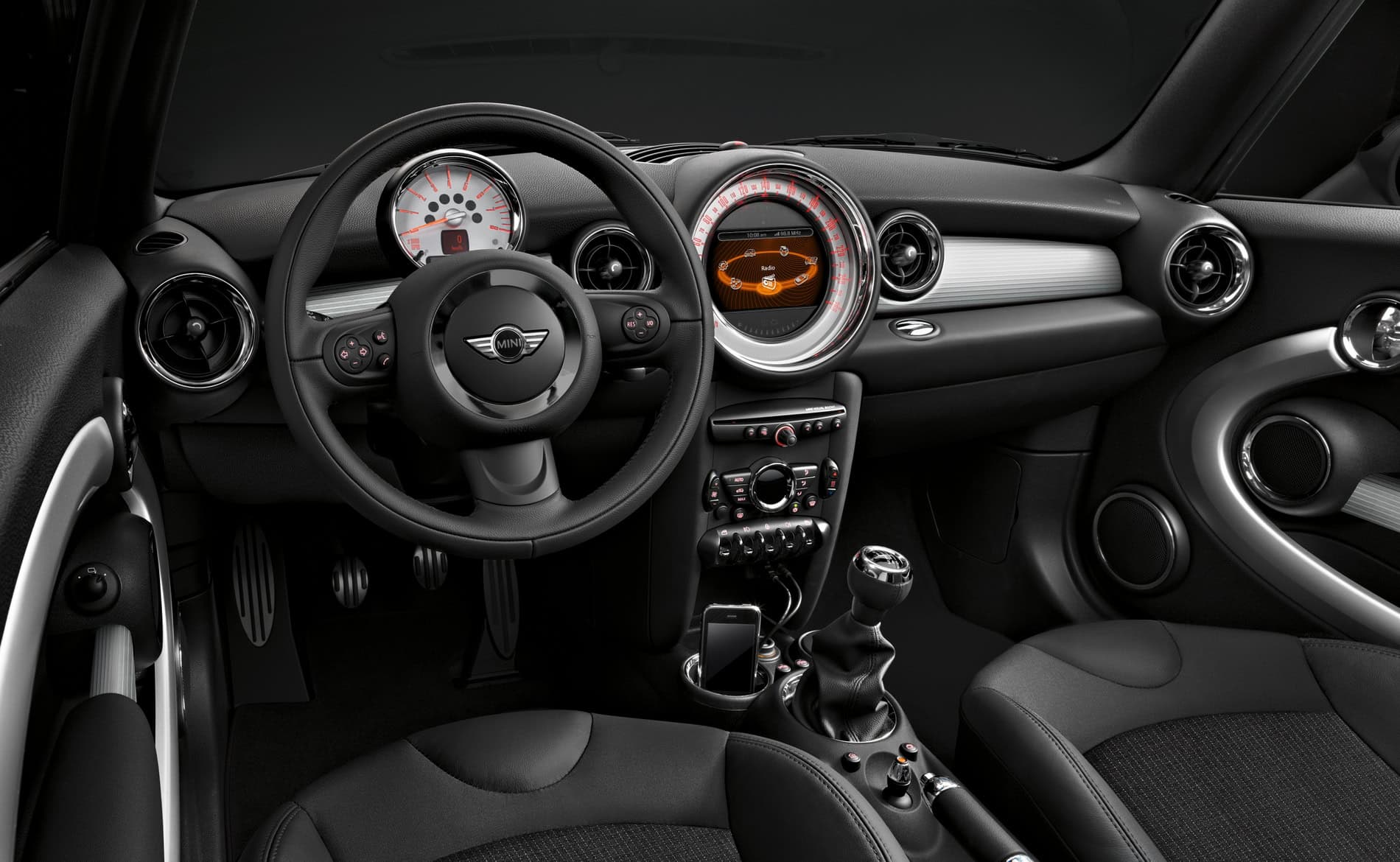 The interior of the car also references the classic Mini to create its air of authenticity. The clear structure of the controls is a typically MINI feature. Elliptical forms transplanting the style of the circular exterior elements inside the car add further distinctive touches.