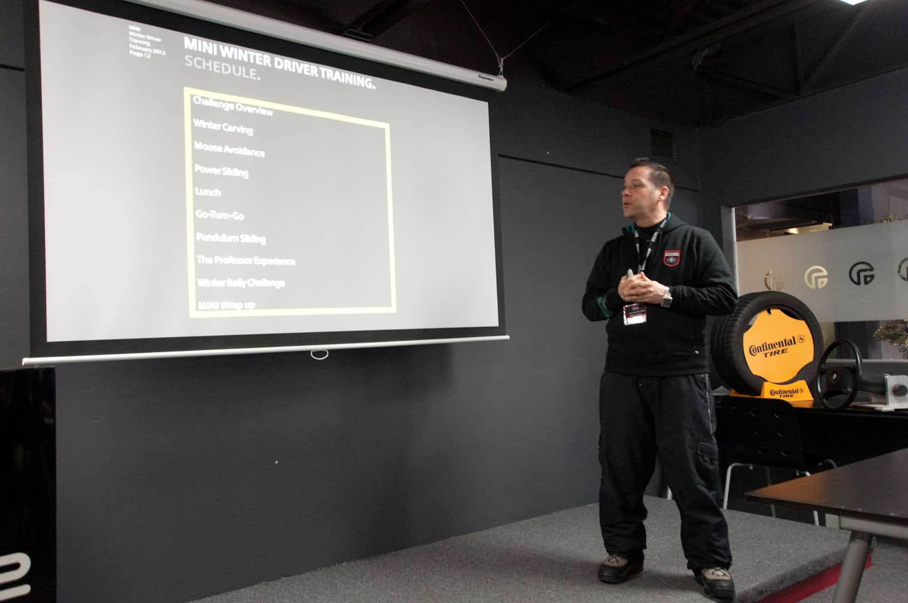 To that end, MINI Canada set up a brilliant training course on packed snow and ice in the frigid cold of Montreal, Quebec. Thankfully, the weather was quite temperate during our time at the training event, and we were not severely punished for forgetting our long johns. The venue was situated behind a new abandoned airport – that’s right, new, not old. A waste of money it may have been, but the advantage of training on smooth, flawless concrete and asphalt was much appreciated and added to the quality of the course. Most of the concrete was covered up by a thick base of ice and snow anyway, but the smooth base translated into a smooth surface to train on. The facilities were also modern and very well maintained, making you feel at home from the moment you arrived. Breakfast and lunch was also catered, and the food was delicious and nutritious – just what you need to distract yourself from traction circle graphs when it’s finally time to eat.
