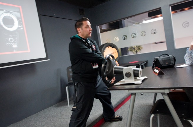 Of course, we didn’t go for the food – we went for the slippery surface driver training. It’s funny how much you take for granted behind the wheel. As astutely pointed out by Mr. Letourneau, quality driving starts before you put the car in drive. If you are not seated properly, you will never be able to extract performance from your car – nevermind drive it safely. One by one he nailed each common seating offense: the rap artist “bling at 12 o-clock” hand position on the wheel, the grasshopper “hands at 11 and 1 o-clock” and even the often over looked “going to have the airbag rip your clothes off (and worse)” seated way too close to the steering wheel position. The first part of the program was as much about learning how not to drive as how to drive. One very common winter driving offense is having the seatbelt ride up over bulky coats and clothing across the waist. I have often been guilty of this, and will be much more careful henceforth. Since you can’t feel the seatbelt through your clothes, it’s easy not to notice this, but the consequences can be quite severe should you be in a collision.