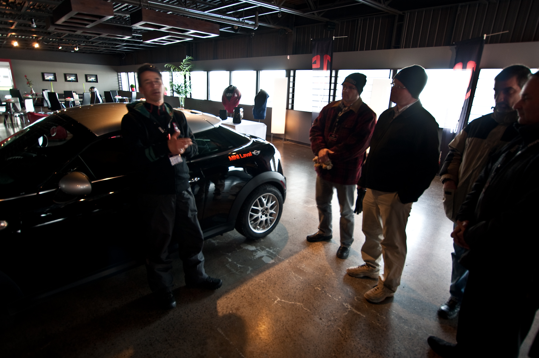 After we were seated and mirrored properly, we got down to the basics of performance driving – which, by the way, roughly equate to the basics of safe driving: specifically collision avoidance. We considered the way that tire grip can be used up: either 100% to braking, acceleration or cornering, or a mix thereof – but never more than 100% between all three or you will find yourself in a slide. We also talked about reaction times behind the wheel, where we should keep our eyes and attention, and how to react should things go sideways – quite literally. All of the curriculum was standard driving school content – but applied in a very fresh and interesting way. The instructors managed to make what would otherwise have been the least exciting part of the day fast-paced and comical in true MINI fashion.