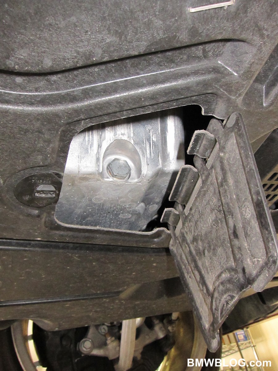 Once you are up under the car locate the small trap door in the splash guard. Get a large screw driver and rotate the lock 180 degrees and the the door will just swing down. This trap door is pretty cool and will hopefully stand up to repeated use unlike some of the earlier generations where parts were easy to loose or break leaving a lot of shops to simply remove your panel and not tell you.
