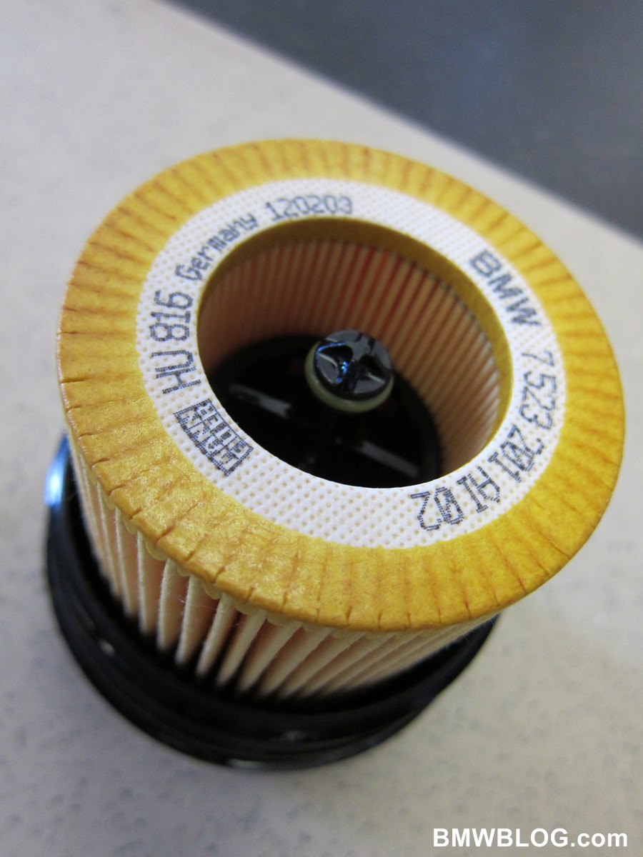 Remove the dirty oil filter and the two O rings – a large black one and a much smaller green one. I use a very small flat head screw driver but you could also use a small pic. Replace these with the new o rings in the oil filter box. Make sure to coat the new ones with fresh oil before installing them. Next seat the new oil filter in the black housing and install the whole assembly back into the motor. The 25 Nm torque spec for the oil filter housing is thankfully marked on top of the oil filter housing.