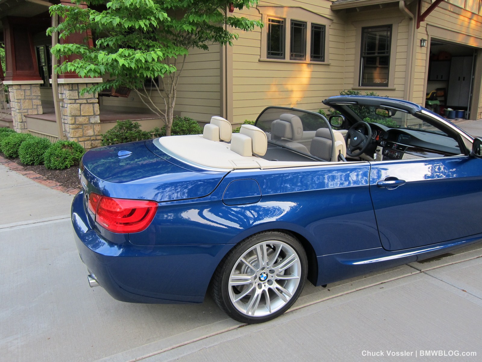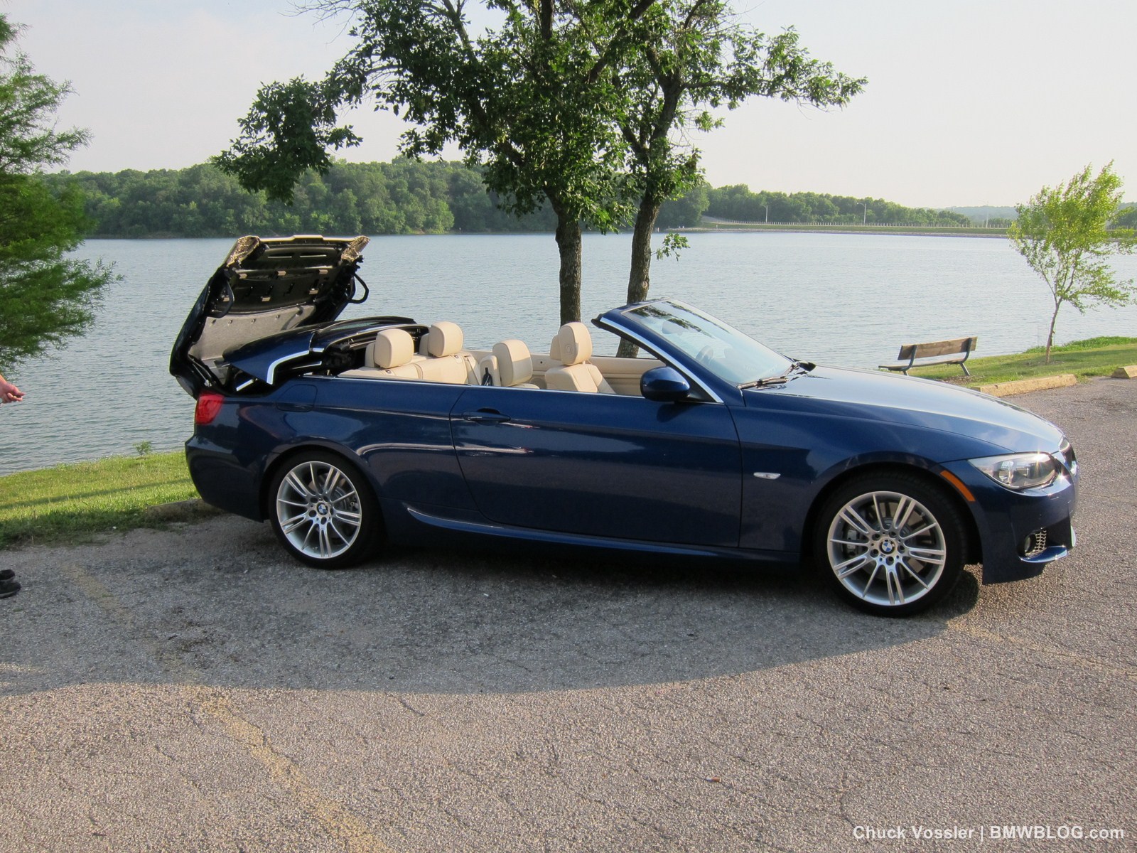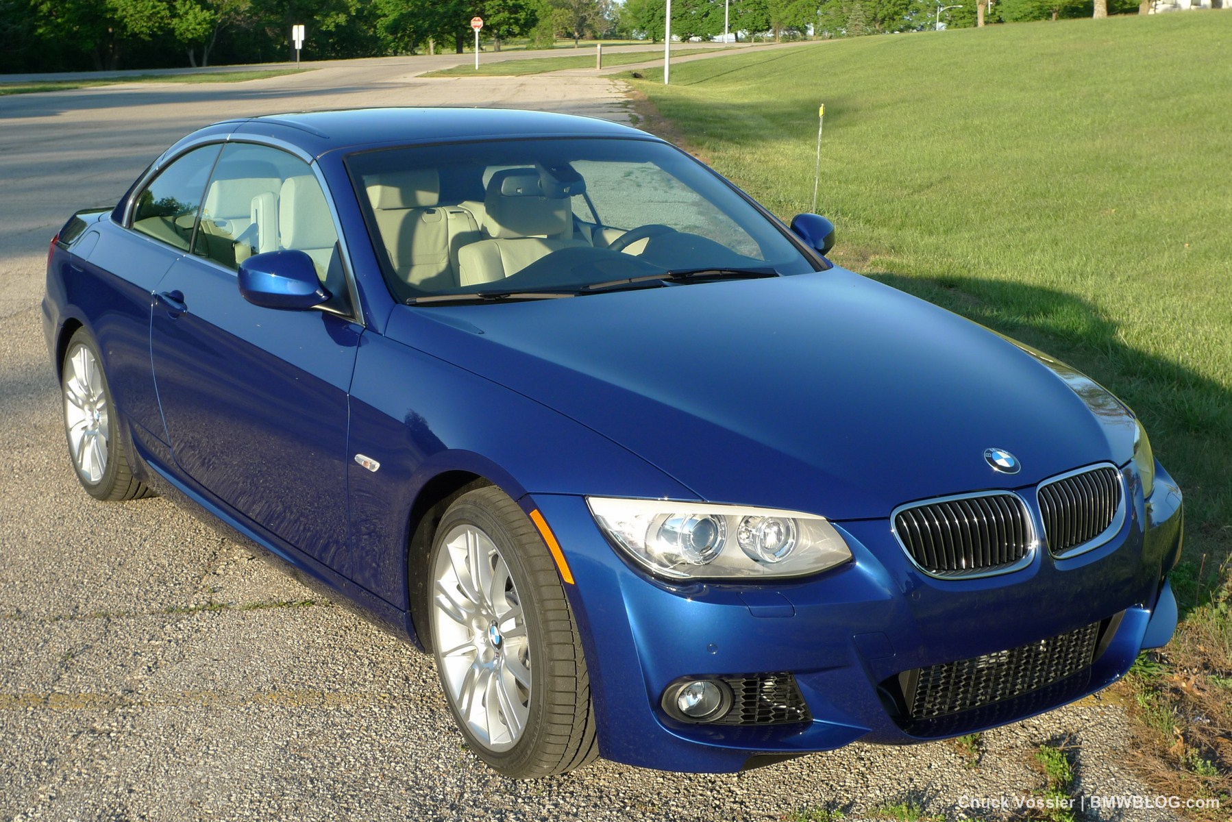 Ah summertime! What better time is there than this to drive a BMW convertible? Sometimes, we in the automotive press, spend too much time talking about the latest and greatest, forgetting about the here and now. This realization dawned on me while taking in the stunning view of the low slung, wide M-Sport package 2012 BMW 335i Convertible, top down in the shimmering sunlight next to the lake in LeMans Blue Metallic with its cream beige Dakota leather.