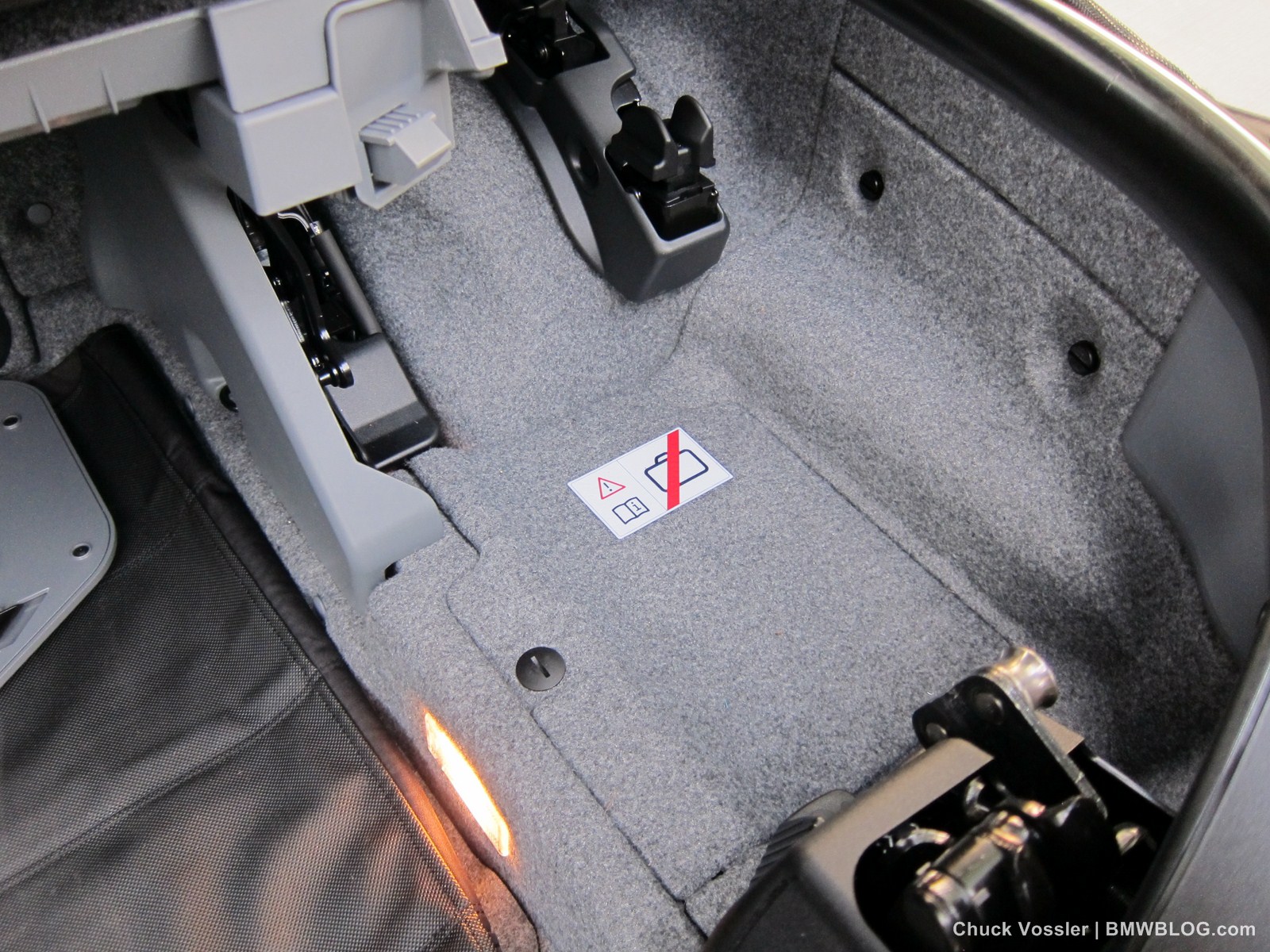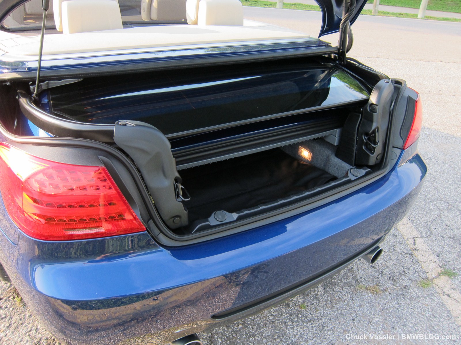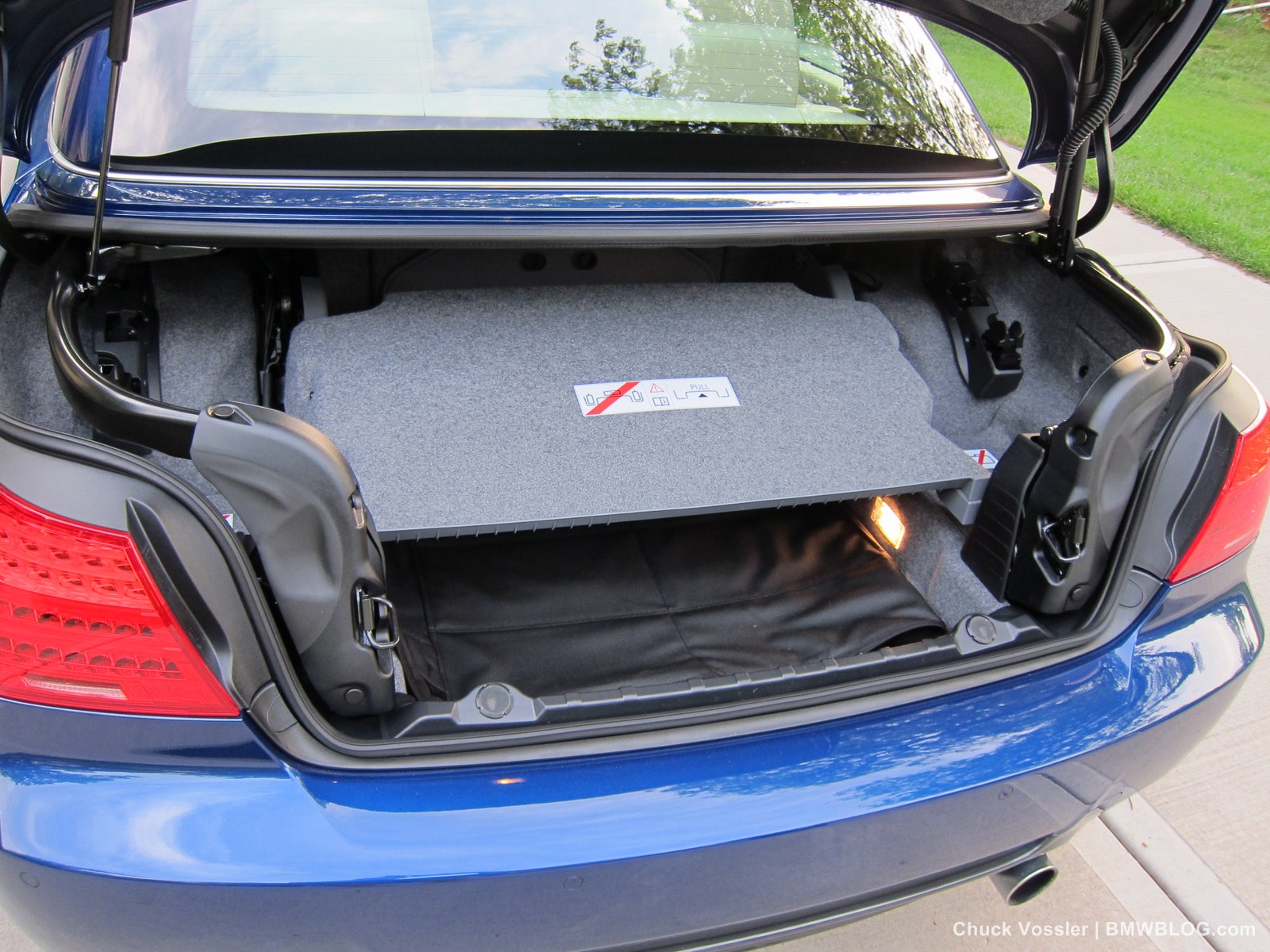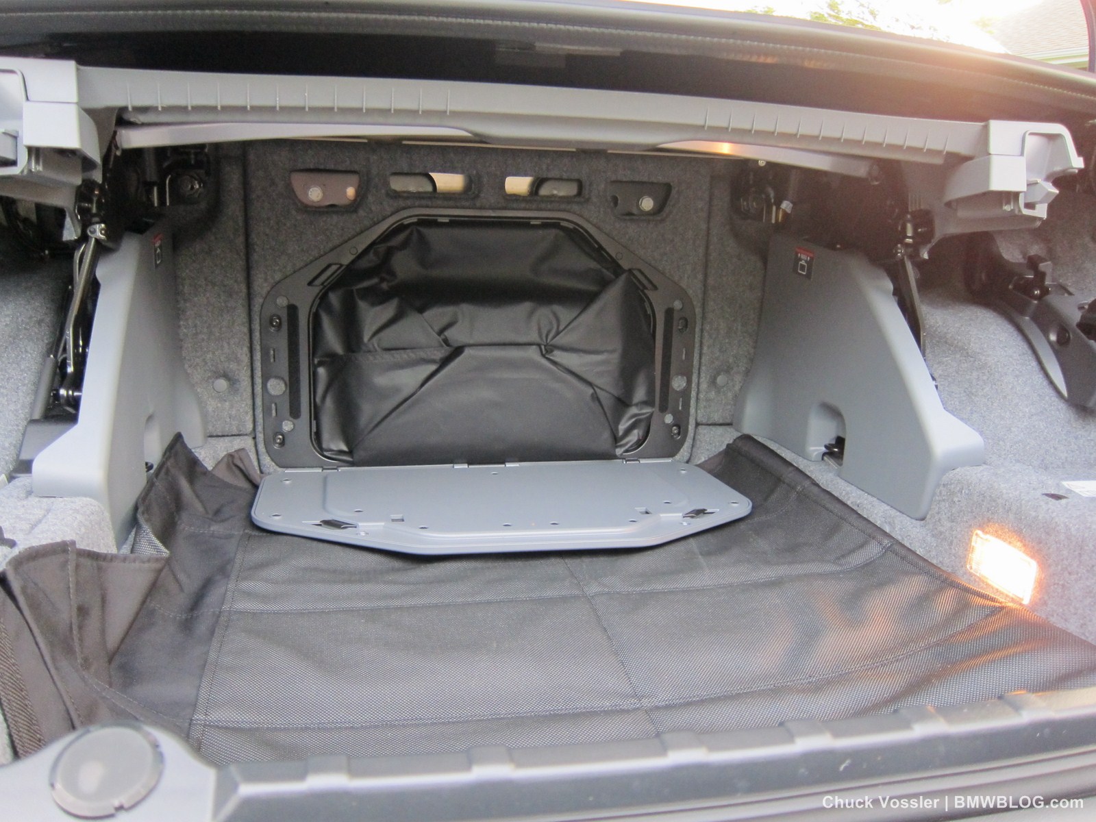 In the trunk, there is a little tray that moves up to give you more storage space but it needs to be down if you want to put the top down. It’s probably put there as a device to remind you that space is limited with the top down. This tray must be in the down position for the top to drop and several times I found it necessitated a trip out of car to the trunk. Try doing that a stop light. Doesn’t work. At least BMW gives you an idiot warning light when you’ve left the storage tray up giving you the reason for the hard top not moving. What could be in the way you say? Well the windscreen stows in there but was somewhat cumbersome yanking it in and out of the car for pics and scientific testing.
