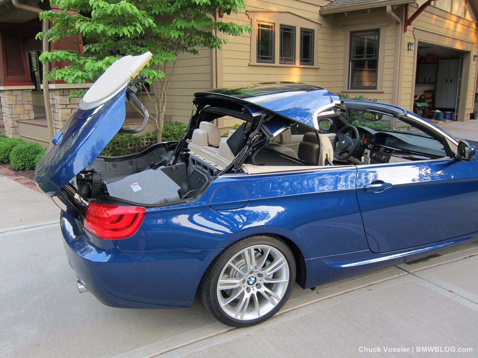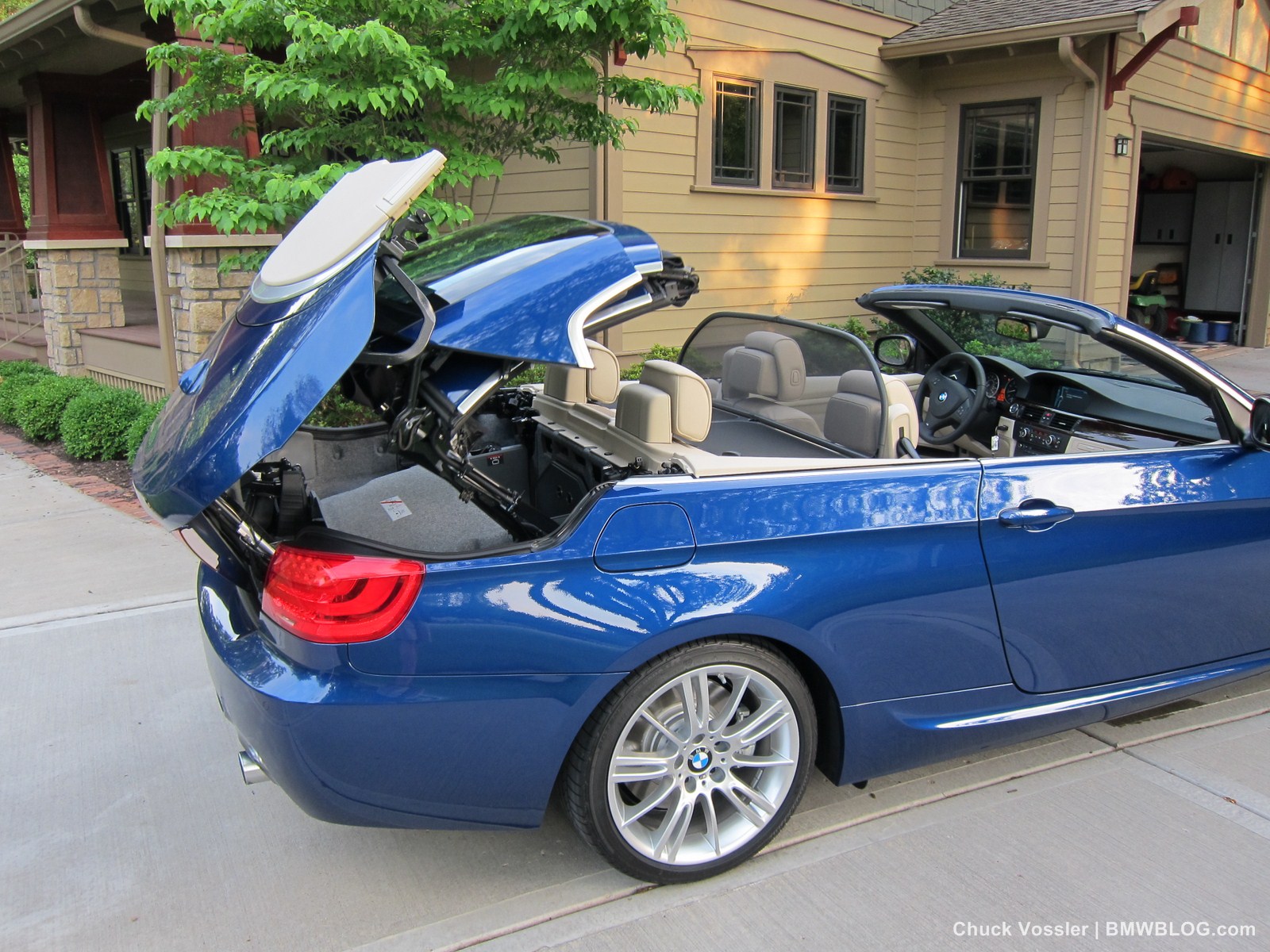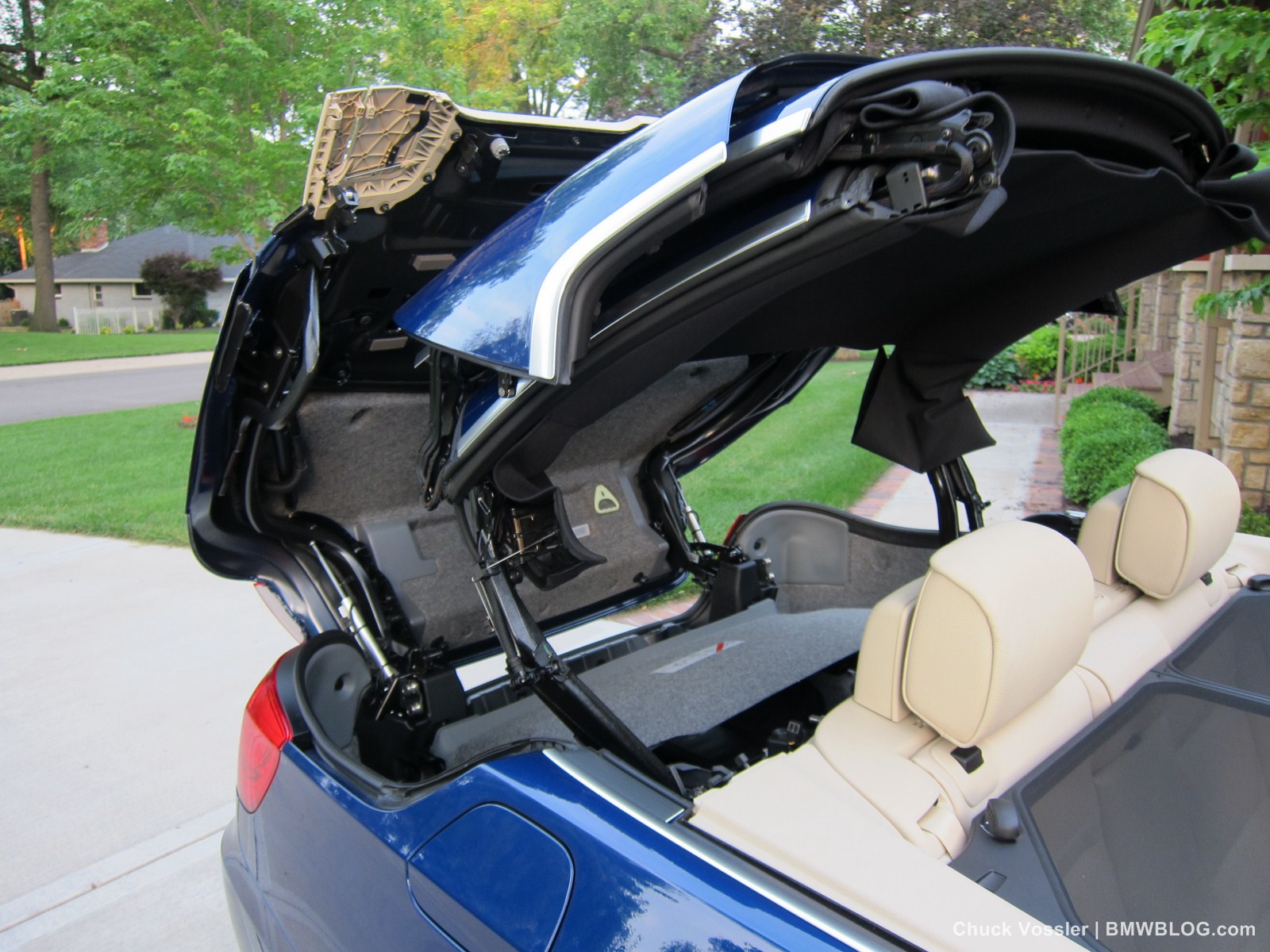 BMW’s mechanism for the folding hardtop involves a ballet of metal, plastic and cloth. It folds in three pieces with the back glass one, and the flat top in two roughly equal parts. The symphony starts by the windows dropping and then the trunk opening. Then, well, its hard to describe but the best view is from the back quarter panel if you want to see the mechanism. That’s the view we shot our video from.