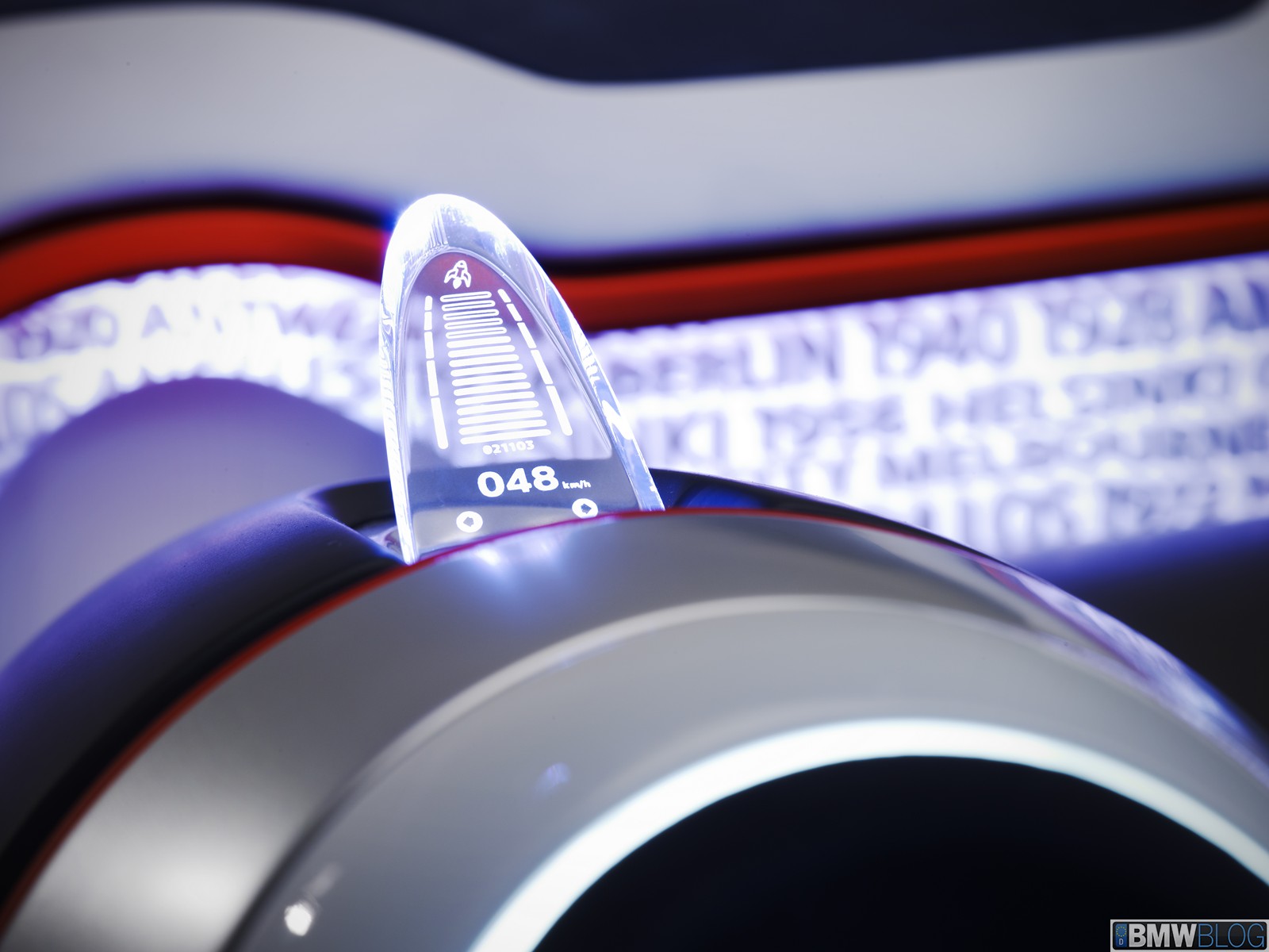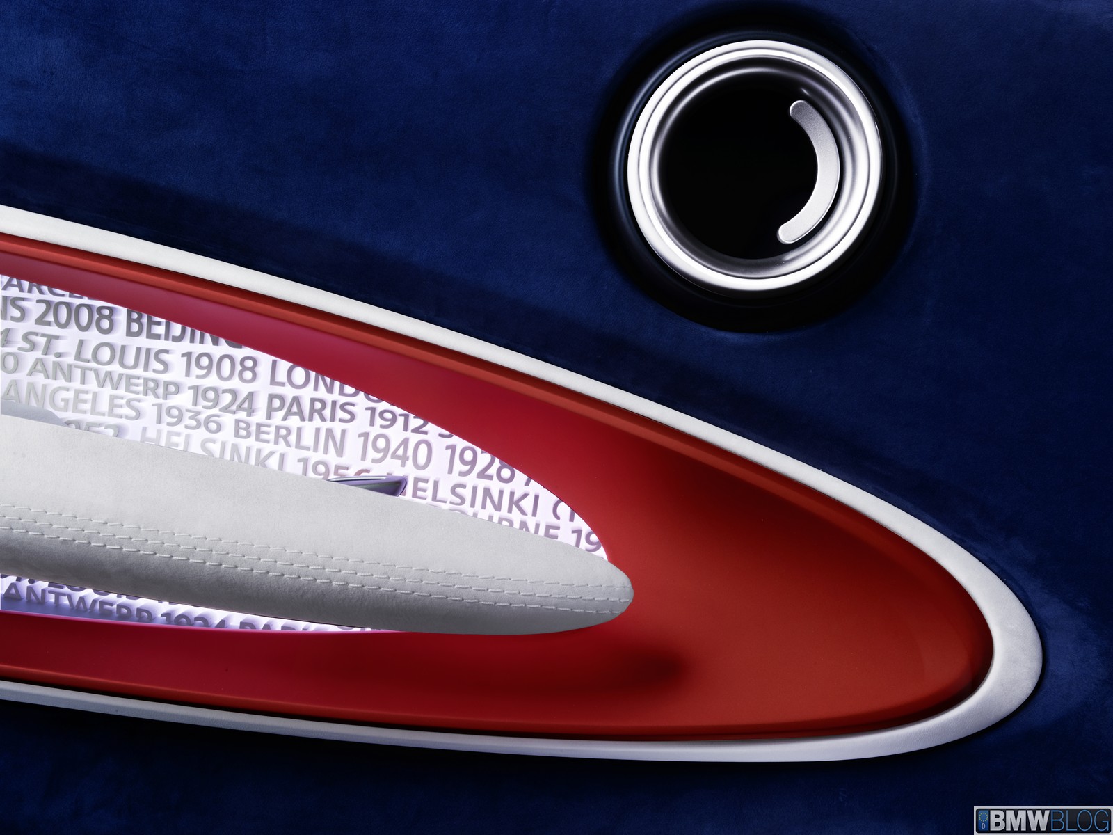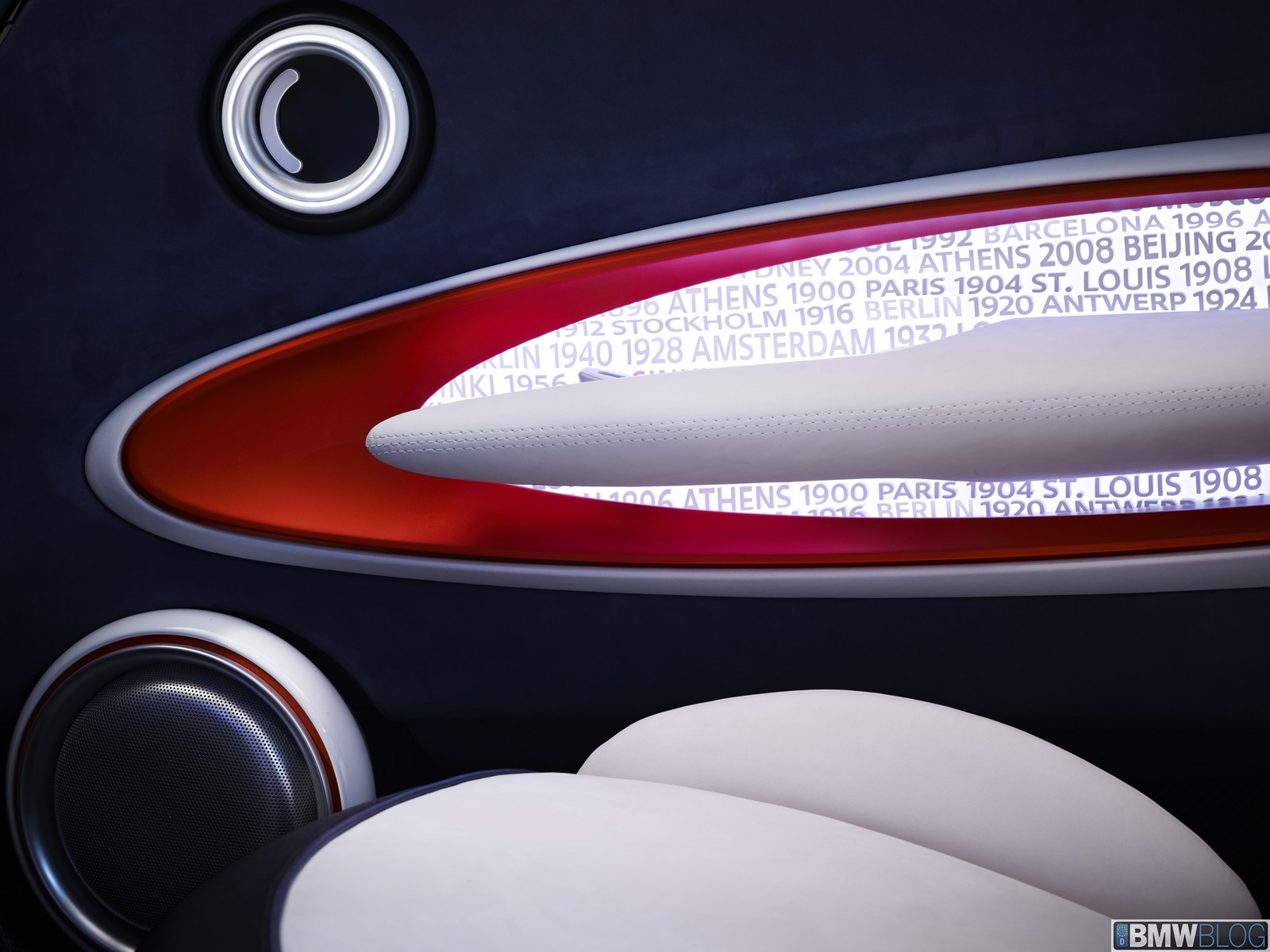 The exposed carbon elements in the interior accentuate the MINI Rocketman Concept’s high-tech character and are incorporated into its colour scheme. For example, the blue paintwork used for the dashboard merges smoothly into black around the steering wheel, producing a harmonious flow of colour into the dark carbon surfaces. The most distinctive element of the dashboard is the cockpit surface, which is bordered by a red bar and has a striking 3D effect. Its relief structure depicts the name of every host city of the summer Olympic Games in the modern era using artistically intricate lettering, with London given particularly prominent billing.
