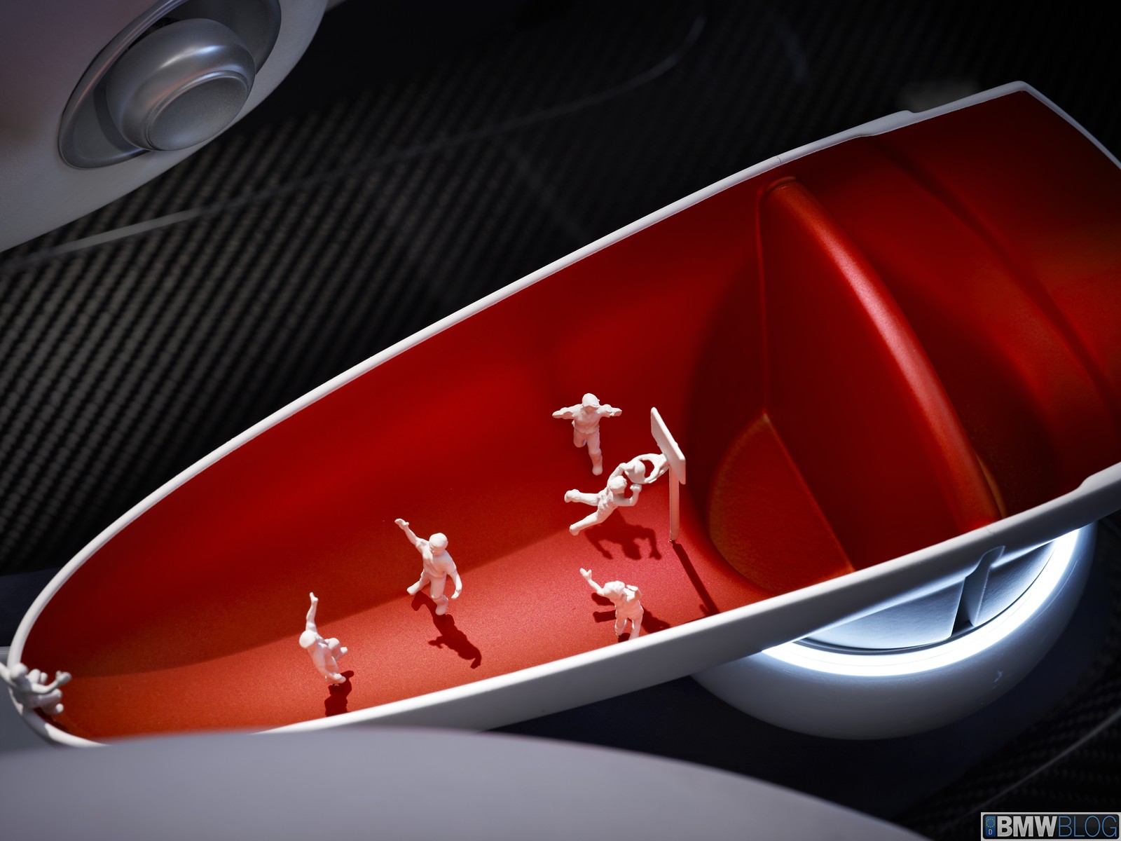 The grille structure – made up of MINI logos – could certainly be described as an “eye magnet”, thanks also to its red metallic paint finish and contrasting white surround. A red strip emphasises the path of the hallmark MINI diagonal link between the wheel arch and door at the foot of the A-pillar. This takes a particularly chunky form on the concept car and also makes a feature of the door hinges. The two-section split boot opening consists of one upward-pivoting element and a second segment which extends out of the body in the form of a drawer – and which is also painted blue on the inside in the new MINI Rocketman Concept. The rear lights have a trapezoidal stirrup design and work using projector technology.