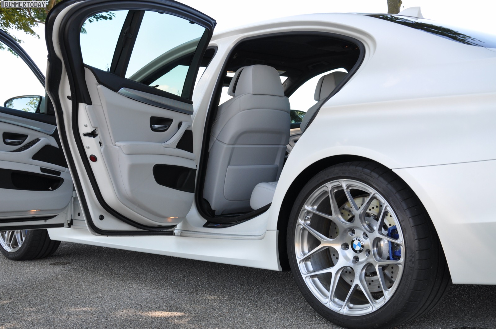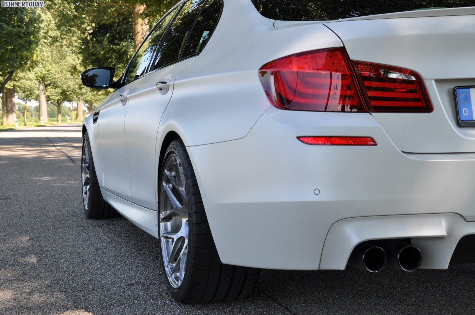 To emphasize the brilliant white matte color, the F10 M5 drops the polished chrome elements in favor of dark chrome or black parts, such as the grille, side gills and tail pipes. Furthermore, the standard wheels are replaced by 20 inch HRE rims combined with 265 and 295 millimeters wide Michelin sports tires.