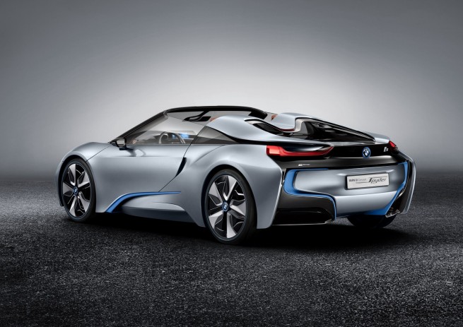 The sporty, emotion-led design of the BMW i8 Concept Spyder showcases the attributes of an open two-seater, coupling lightness, dynamics and efficiency with unusual aesthetics. The combination of intelligent lightweight design and cutting-edge hybrid technology helps the BMW i9 Concept Spyder on its way to genuine sports car performance, while its fuel efficiency figures are on a par with those of a small car. The sporty, dynamic impression is underscored by large body panels, a hunkered-down stance and numerous aerodynamic elements such as contact surfaces, spoiler lips, AirCurtains and aeroflaps.