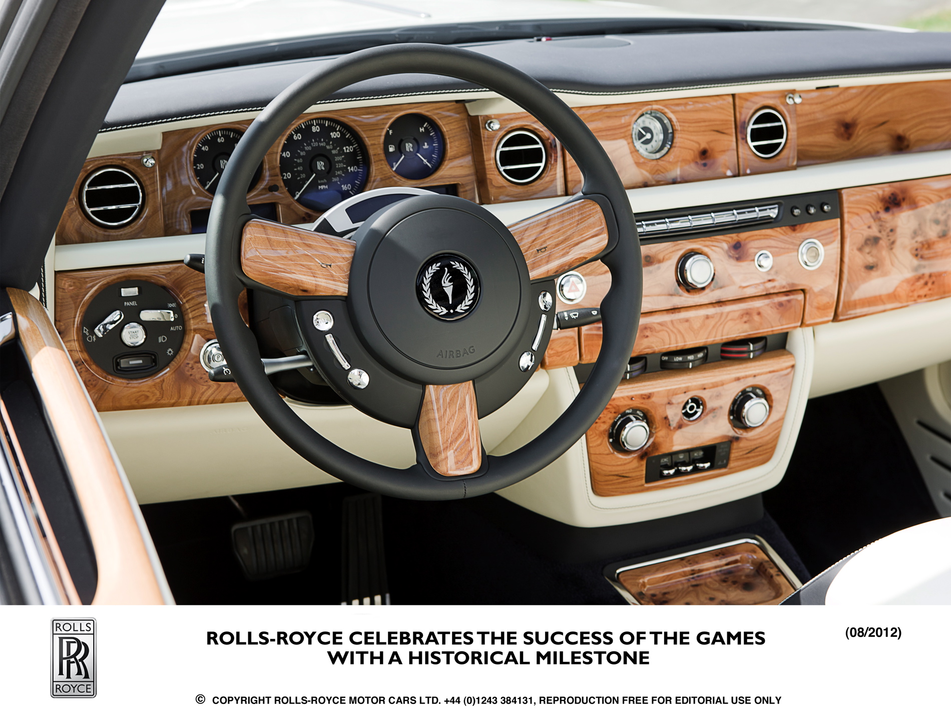 The new grille badge features the iconic Spirit of Ecstasy with patriotic Union Flag replacing the traditional flowing gown of the Graceful Little Goddess. The steering wheel centre includes a traditional laurel wreath and torch, and the self-righting wheel centres feature the words ‘London 2012’ surrounded by the Olympic motto, ‘Citius, Altius, Fortius’ (‘Faster, Higher, Stronger’). The badges are complemented by unique tread plates identifying each car as ‘One of Three’, creating perhaps the most collectable (and unobtainable) Rolls-Royce Bespoke items ever produced.