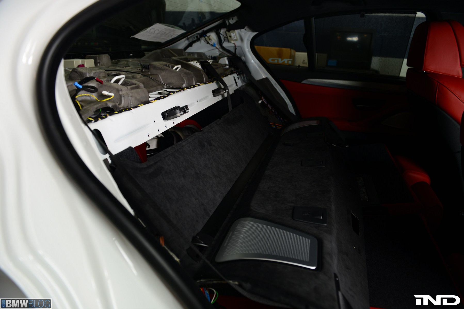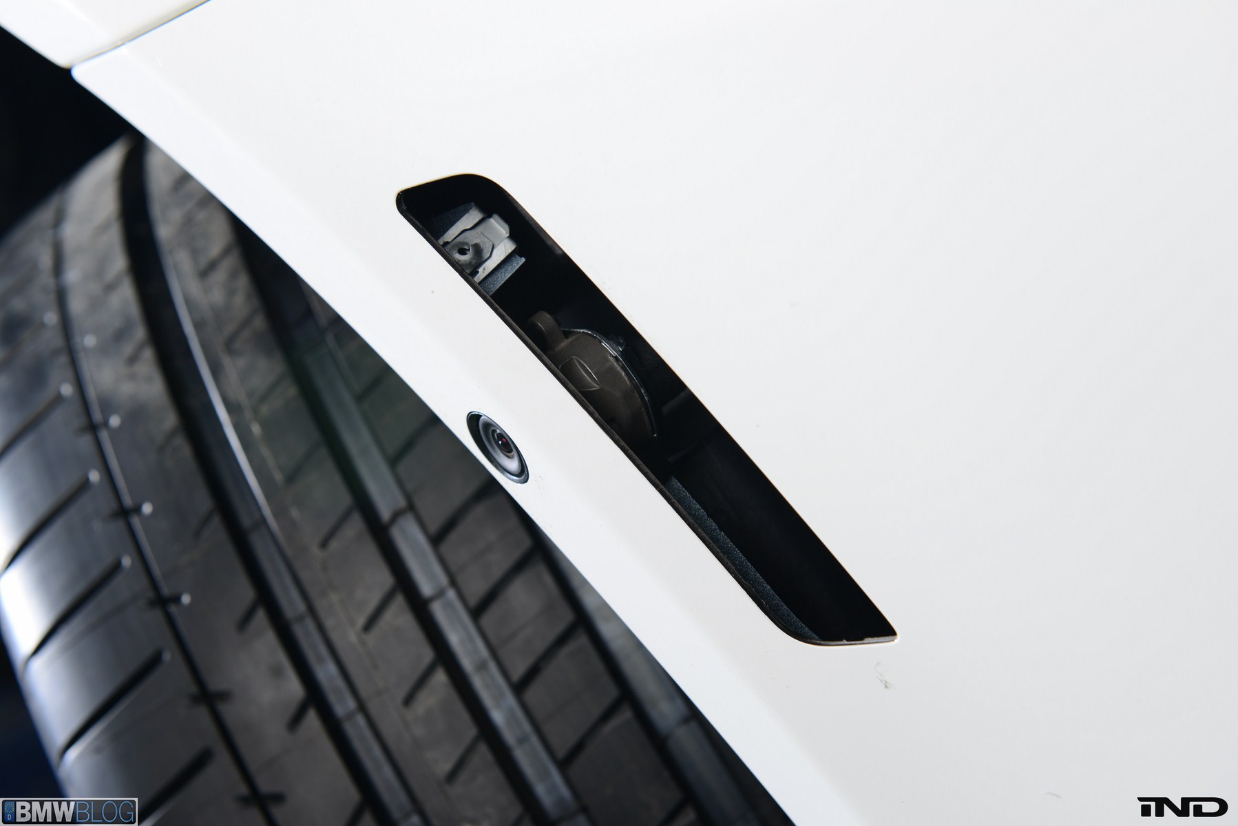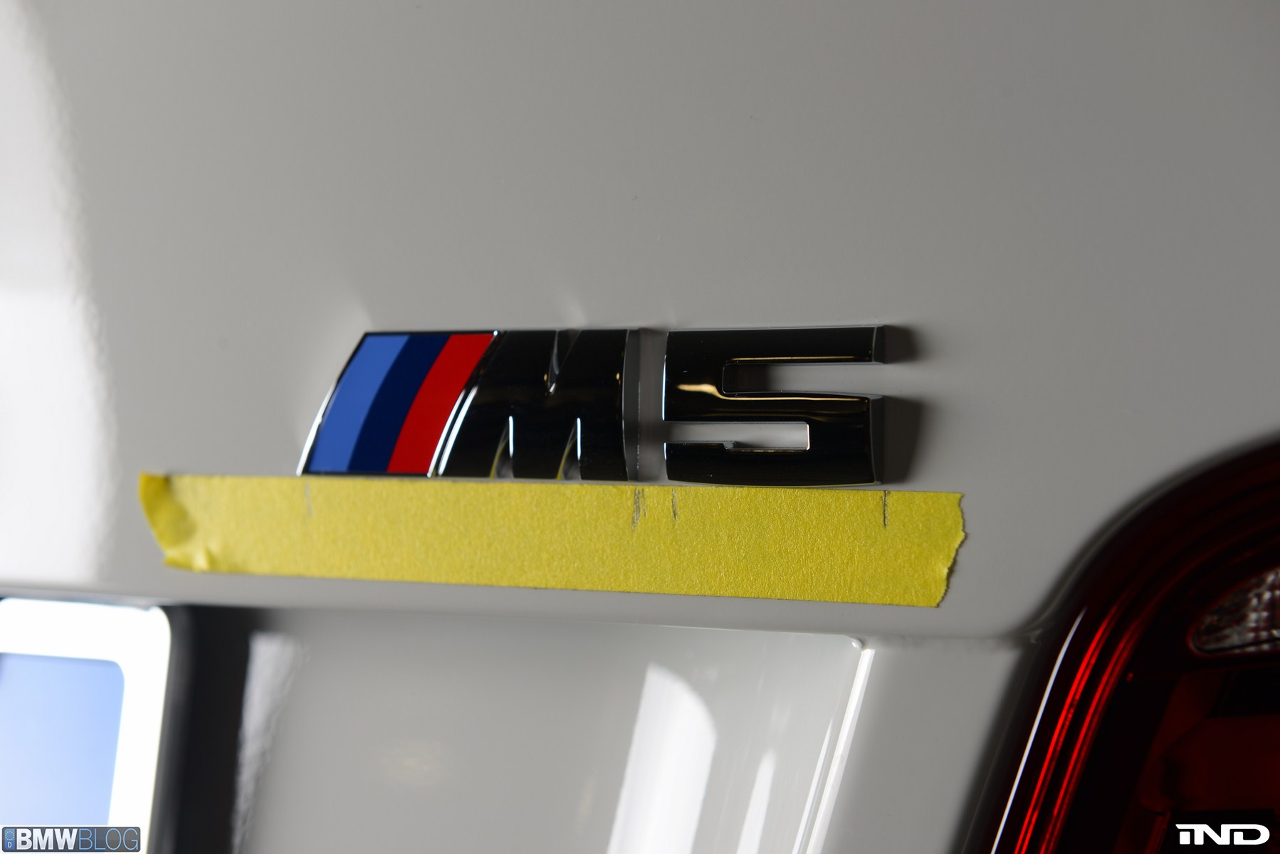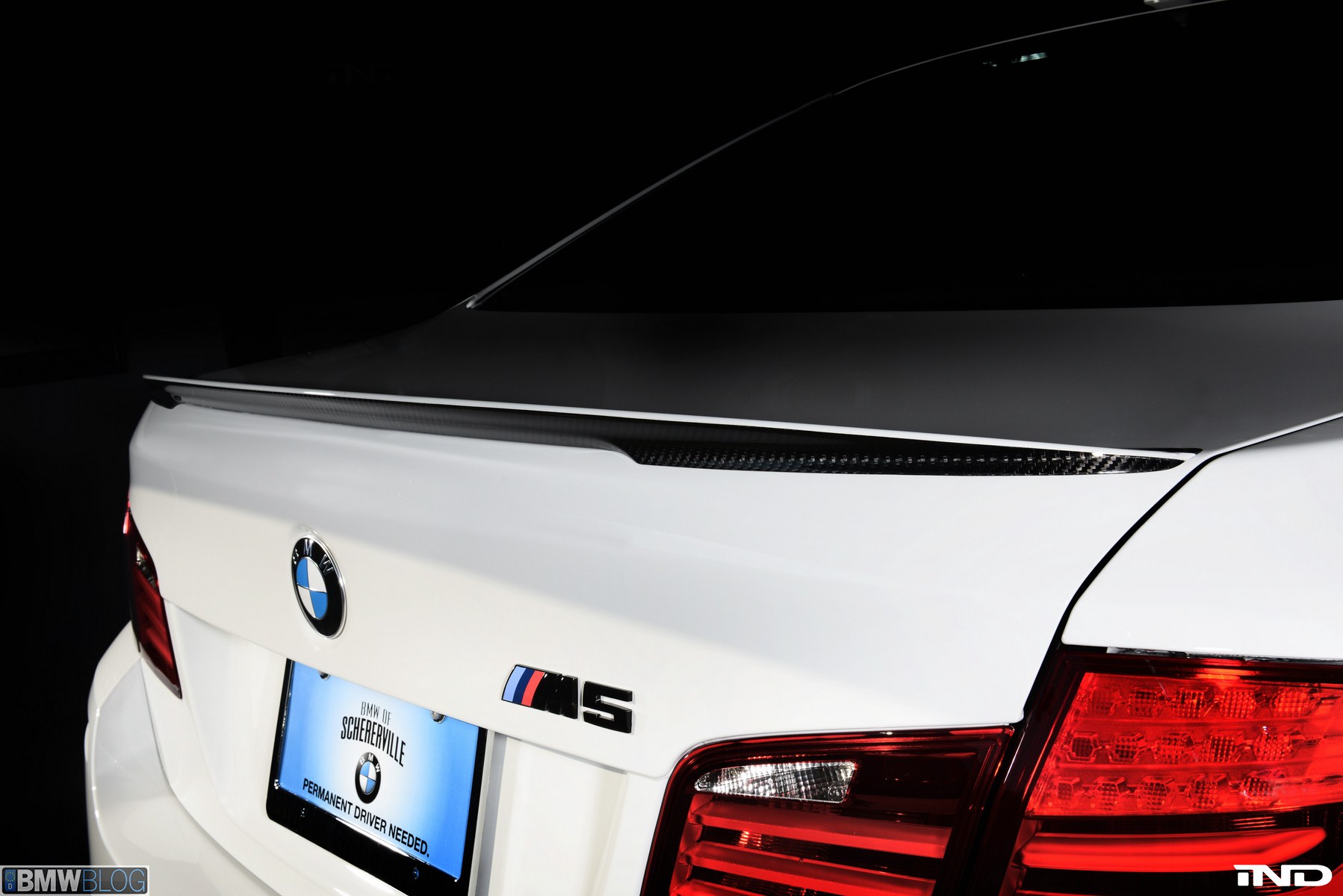 Matching the rear diffuser is a gloss black Revinora front lip, which fills in the lower end of the bumper for an OEM Plus look. We added IND’s Cosmetic Package, including custom painted gloss black front grilles and side grilles in Alpine White with light LED tint. Our rear spoilers with CRT theme have gained popularity quite rapidly, and we installed a lightweight one from BMW Performance with an Alpine White stripe setting off the carbon fiber perfectly. Rather than leave the existing rear M5 trunk badge chrome, gloss black paint was applied to again bring relief against the light-colored body.