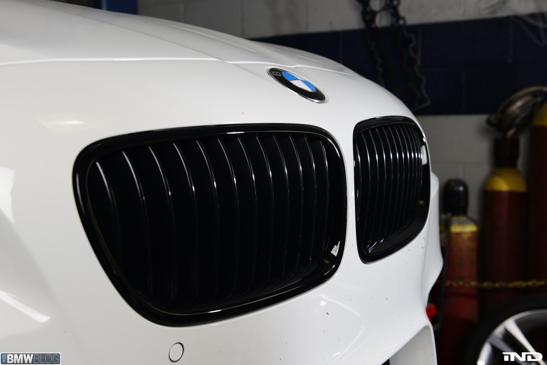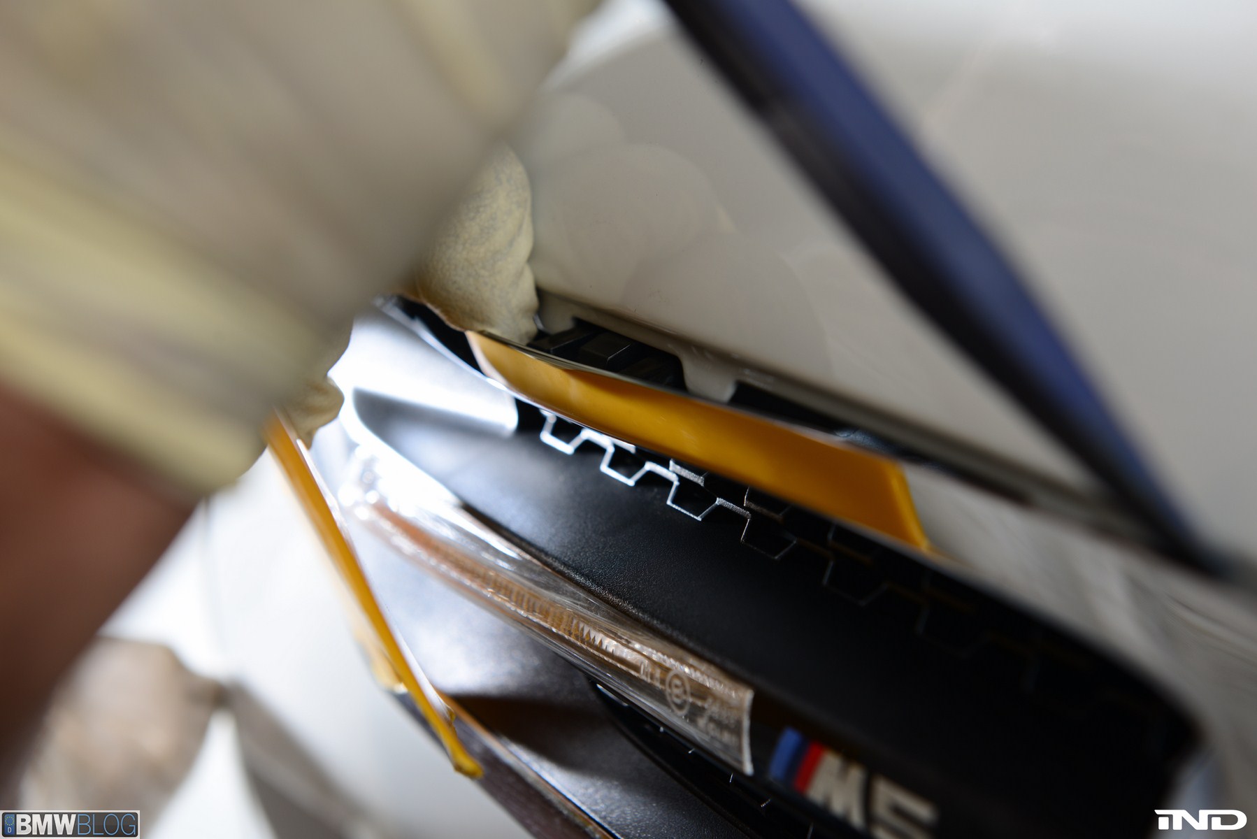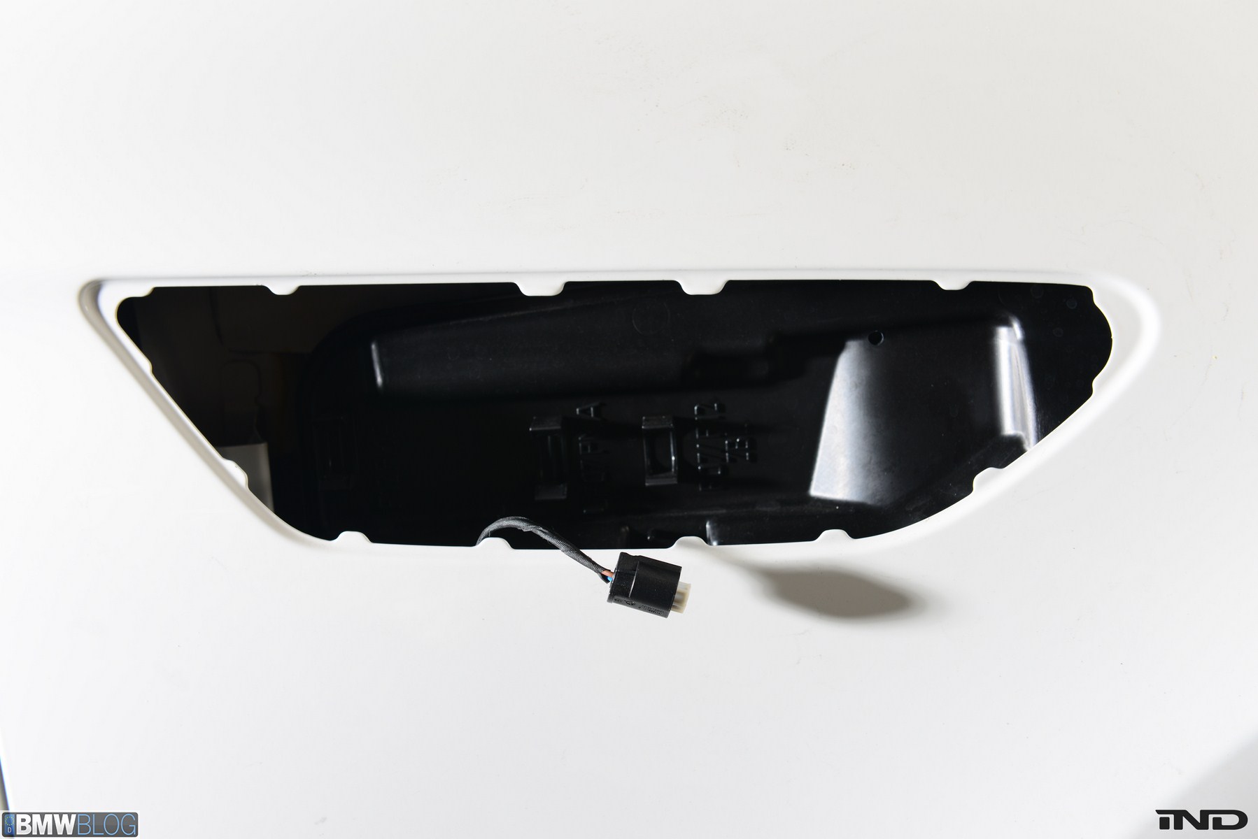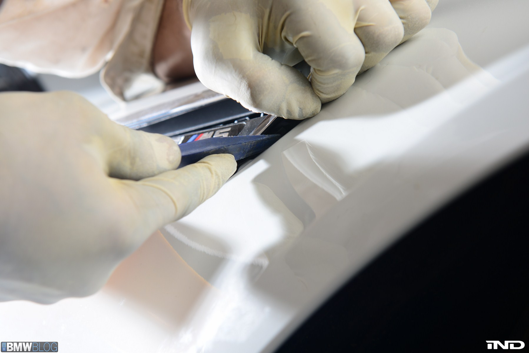 Matching the rear diffuser is a gloss black Revinora front lip, which fills in the lower end of the bumper for an OEM Plus look. We added IND’s Cosmetic Package, including custom painted gloss black front grilles and side grilles in Alpine White with light LED tint. Our rear spoilers with CRT theme have gained popularity quite rapidly, and we installed a lightweight one from BMW Performance with an Alpine White stripe setting off the carbon fiber perfectly. Rather than leave the existing rear M5 trunk badge chrome, gloss black paint was applied to again bring relief against the light-colored body.
