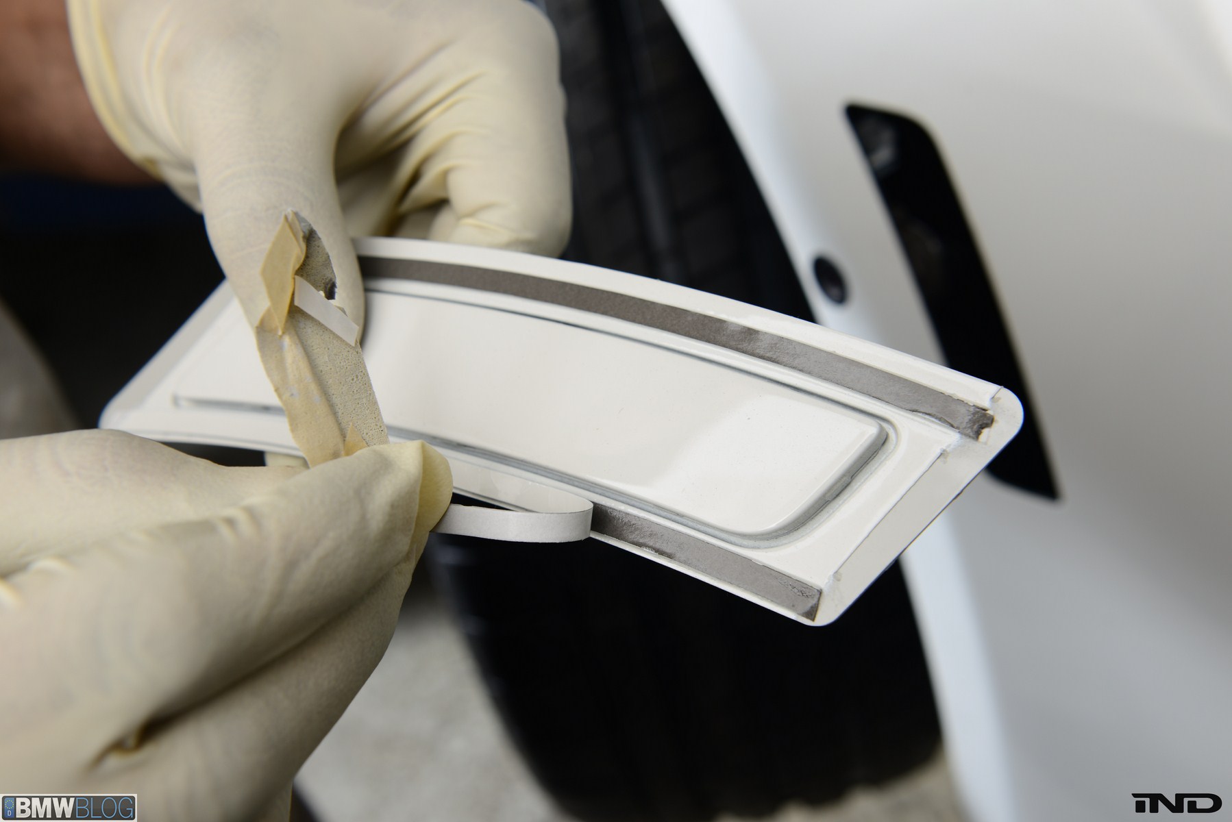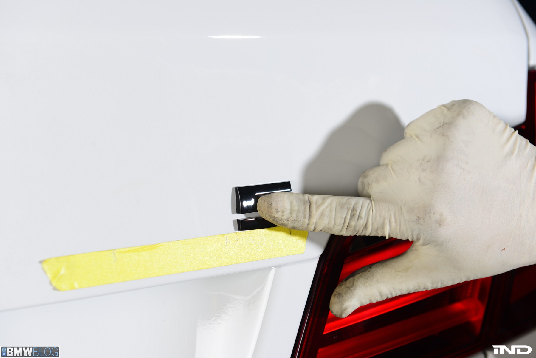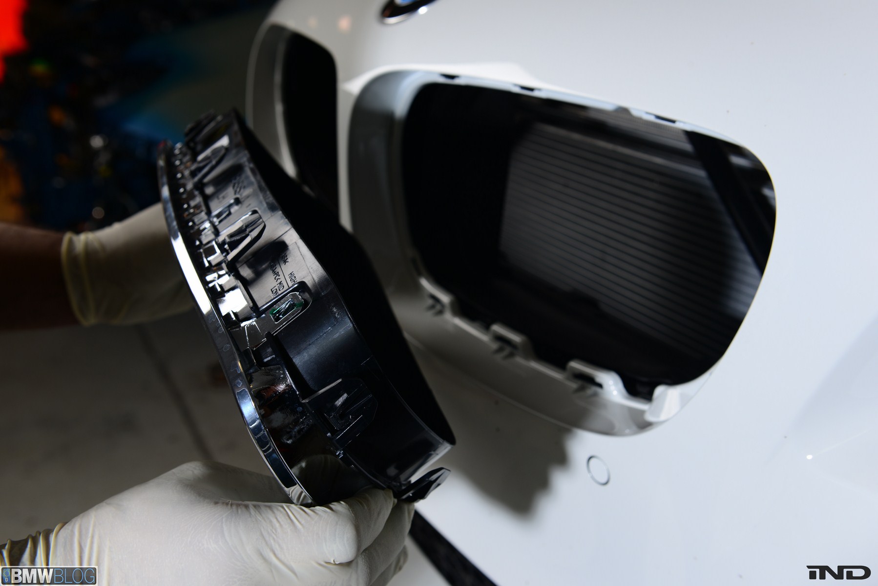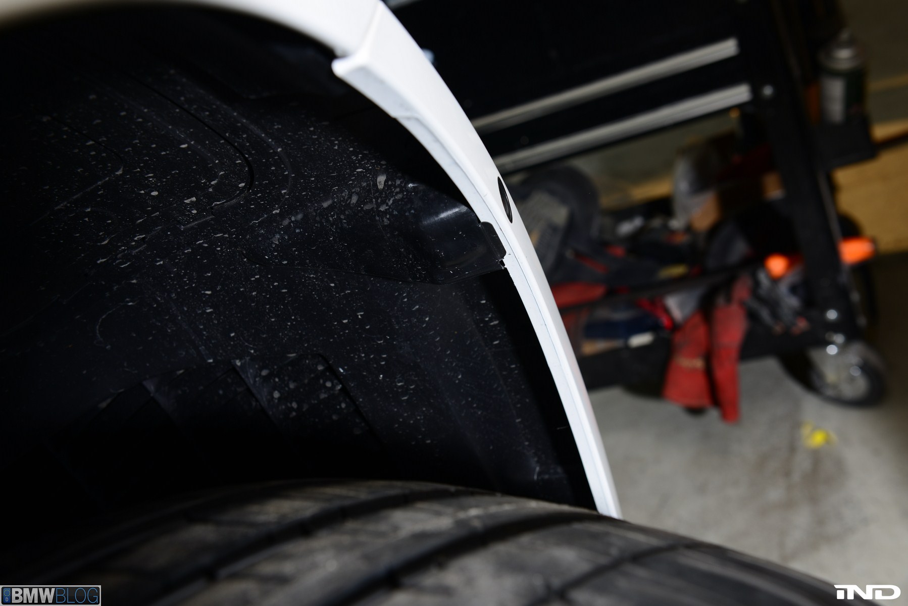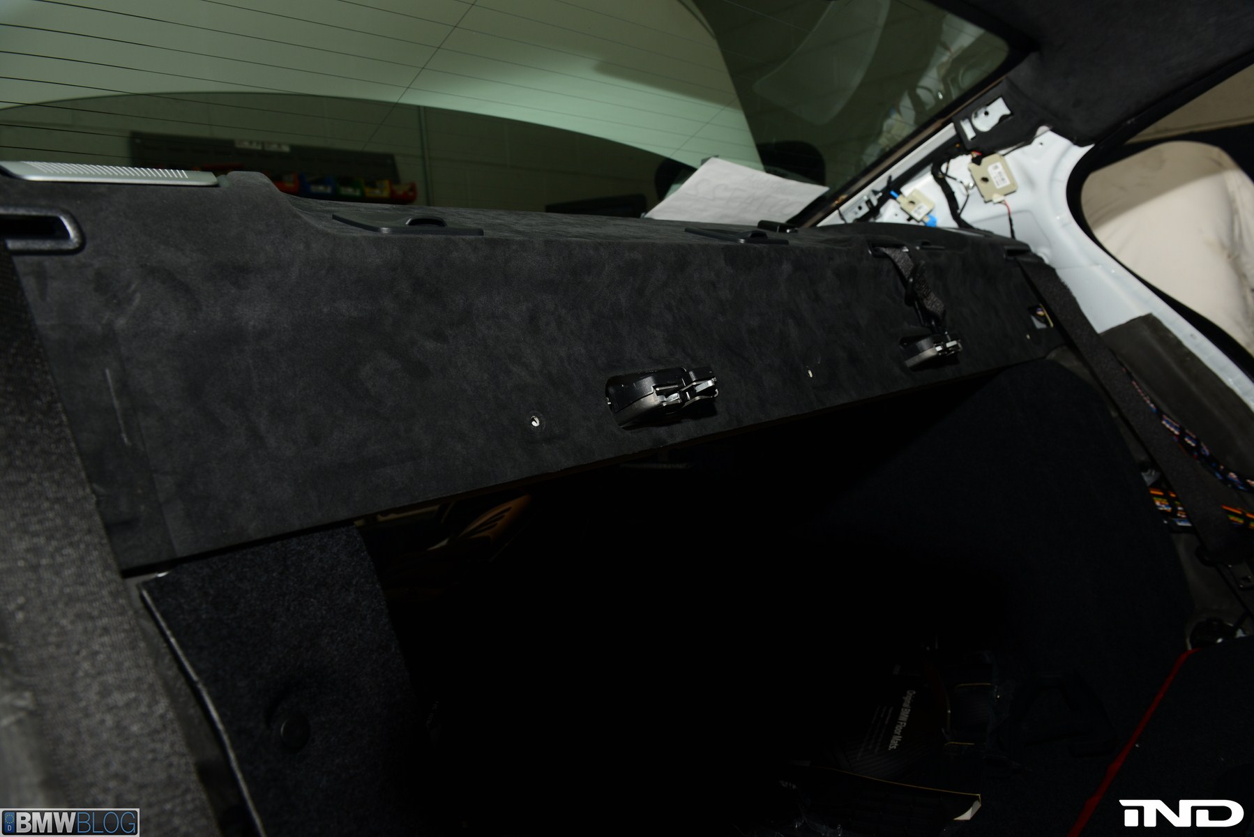 Matching the rear diffuser is a gloss black Revinora front lip, which fills in the lower end of the bumper for an OEM Plus look. We added IND’s Cosmetic Package, including custom painted gloss black front grilles and side grilles in Alpine White with light LED tint. Our rear spoilers with CRT theme have gained popularity quite rapidly, and we installed a lightweight one from BMW Performance with an Alpine White stripe setting off the carbon fiber perfectly. Rather than leave the existing rear M5 trunk badge chrome, gloss black paint was applied to again bring relief against the light-colored body.