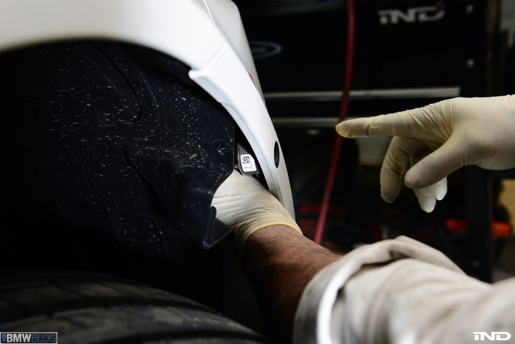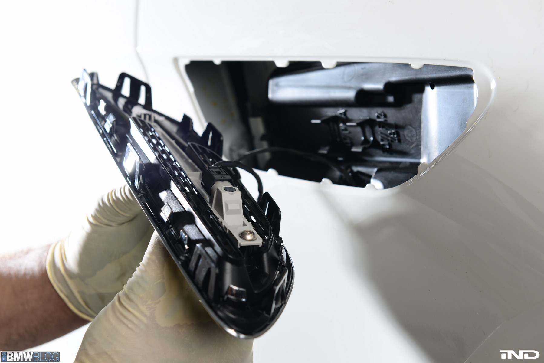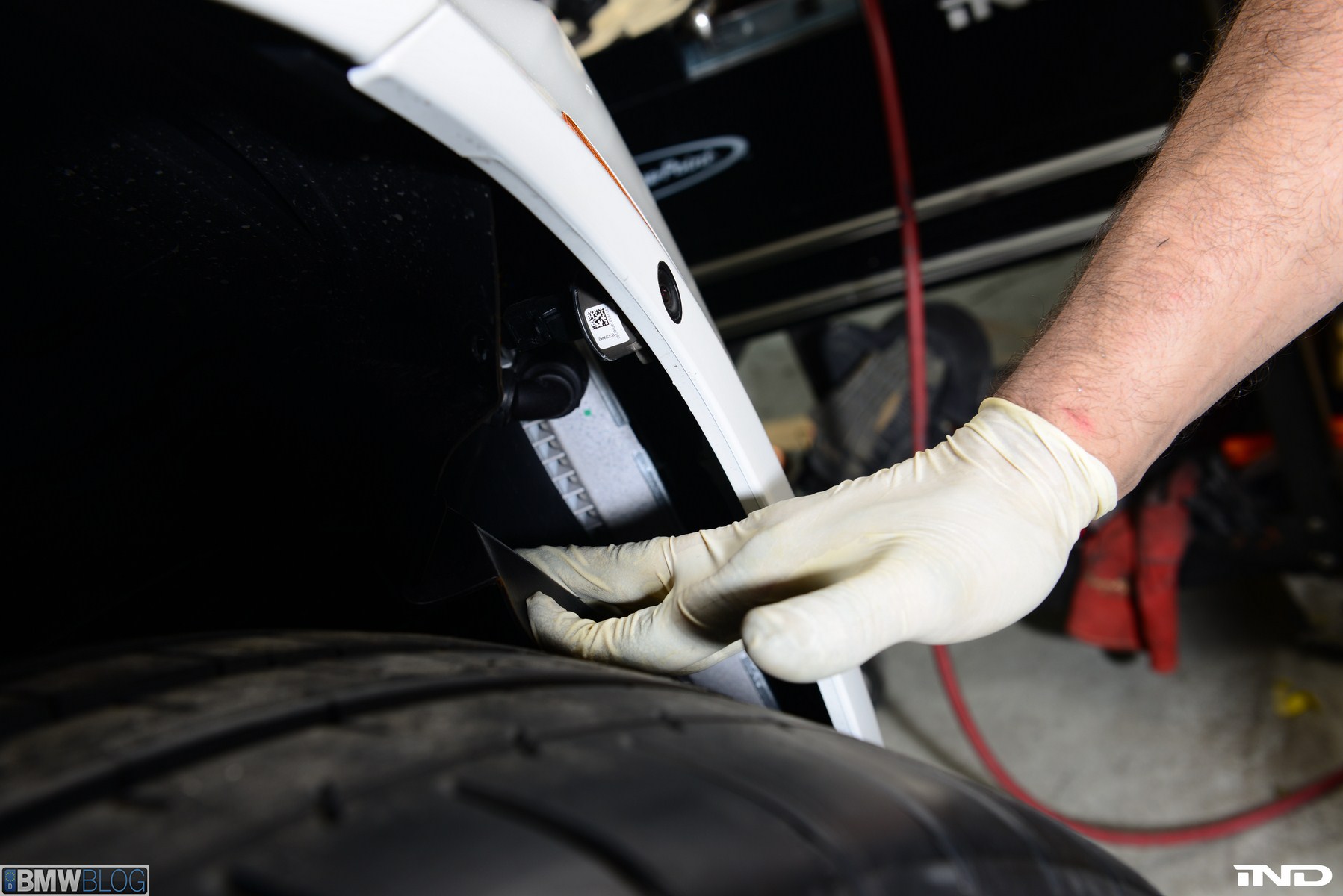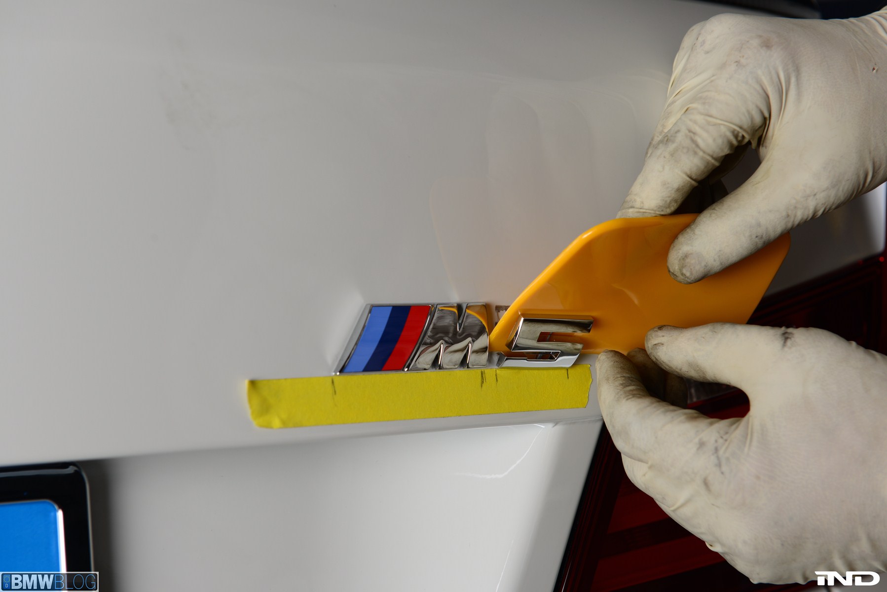 Matching the rear diffuser is a gloss black Revinora front lip, which fills in the lower end of the bumper for an OEM Plus look. We added IND’s Cosmetic Package, including custom painted gloss black front grilles and side grilles in Alpine White with light LED tint. Our rear spoilers with CRT theme have gained popularity quite rapidly, and we installed a lightweight one from BMW Performance with an Alpine White stripe setting off the carbon fiber perfectly. Rather than leave the existing rear M5 trunk badge chrome, gloss black paint was applied to again bring relief against the light-colored body.
