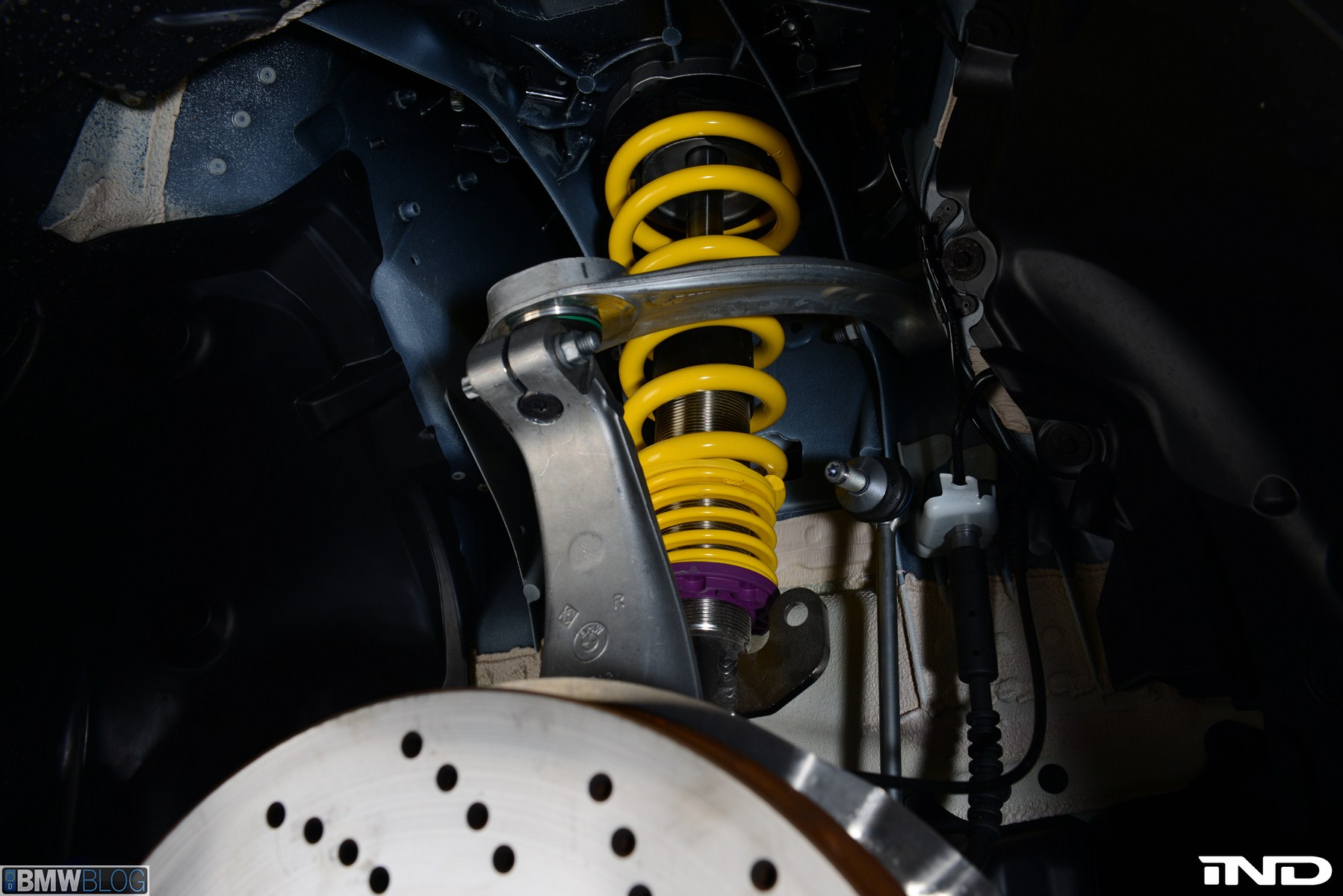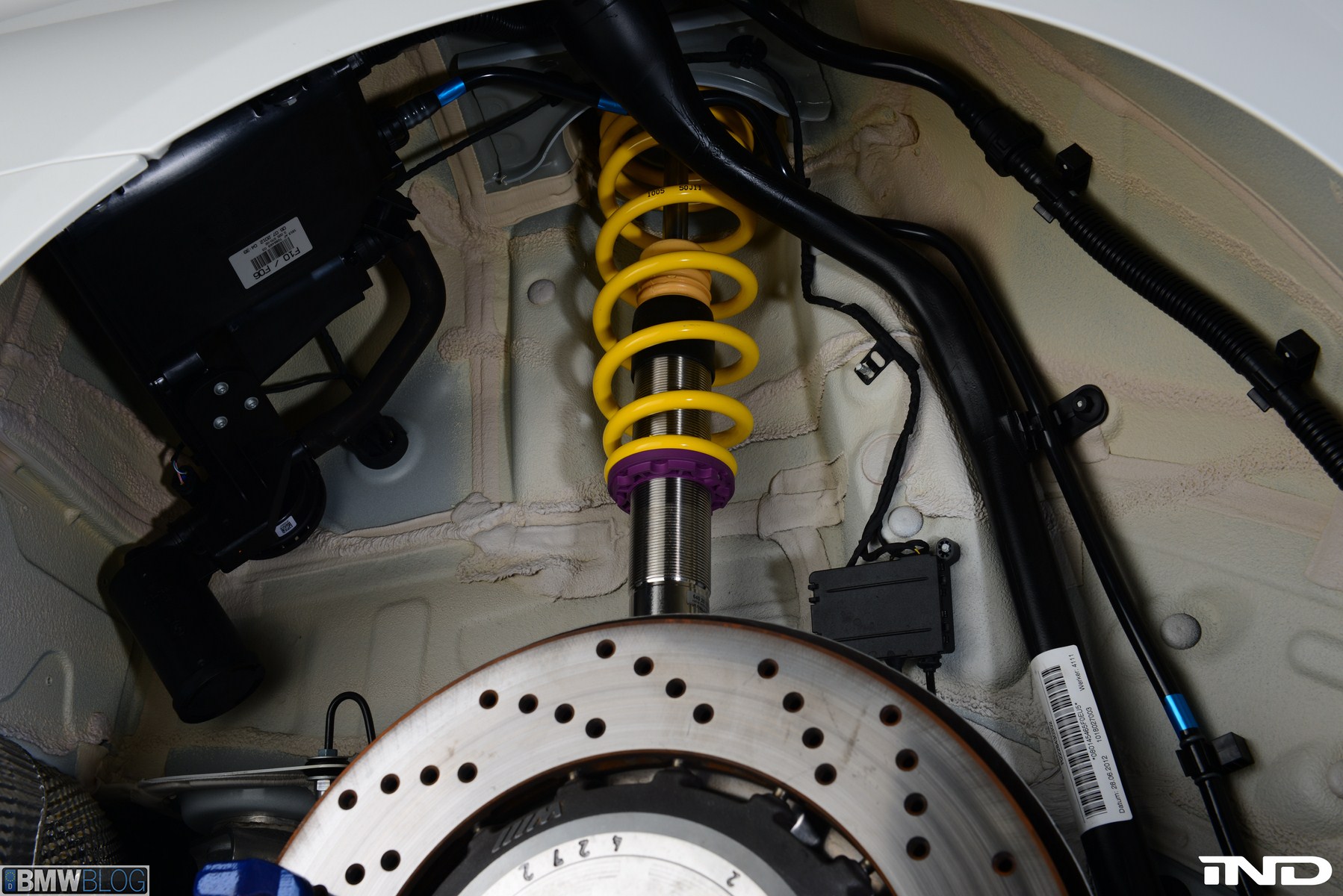 In addition to providing many levels of damping with respect to compression and rebound, the F10 M5 coilovers supply mildly progressive springs while maintaining optimum shock travel. For compliant ride comfort, custom bump stops are used, and ride height has a wide range of adjustment to obtain the best possible stance. We never tire of the colorful purple and yellow used by KW, and the fit and finish quality is absolutely world class as always. Even more importantly, confidence is inspired by the relentless amount of testing and calibration done by the engineers at KW, from their state-of-the-art computer simulated environments and test rigs to world-renowned race circuits such as the Nurburgring and beyond.